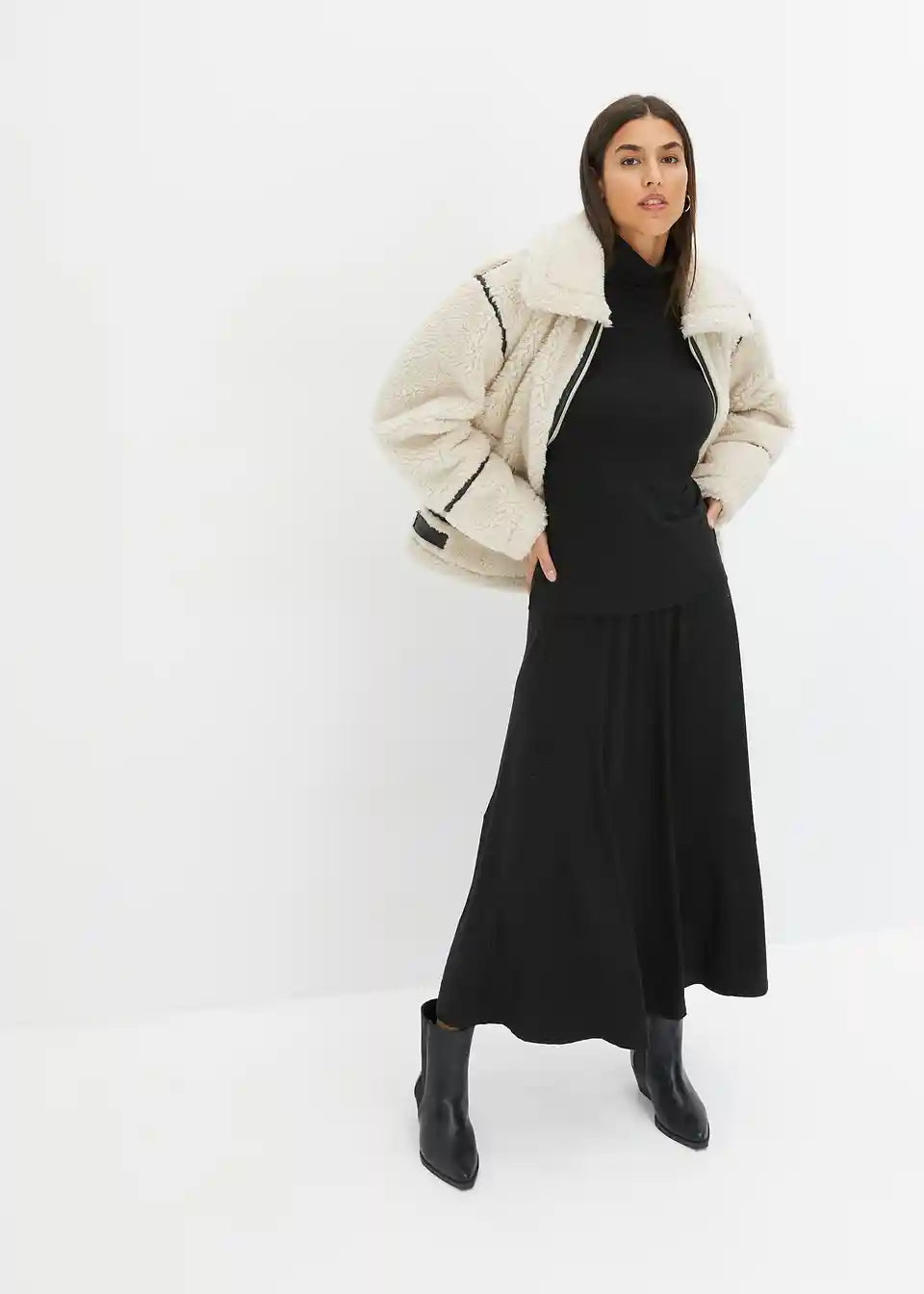 Der Rock ist leider aus sehr dünnem Stoff, hatte auf etwas festere Herbsqualität gehofft. Er kam auch sehr verknittert an und in der Farbe schwarz, habe ich die kreuz und quer Nähte nicht gesehen, das gefiel mir gar nicht, sodass der Rock retoure ging
