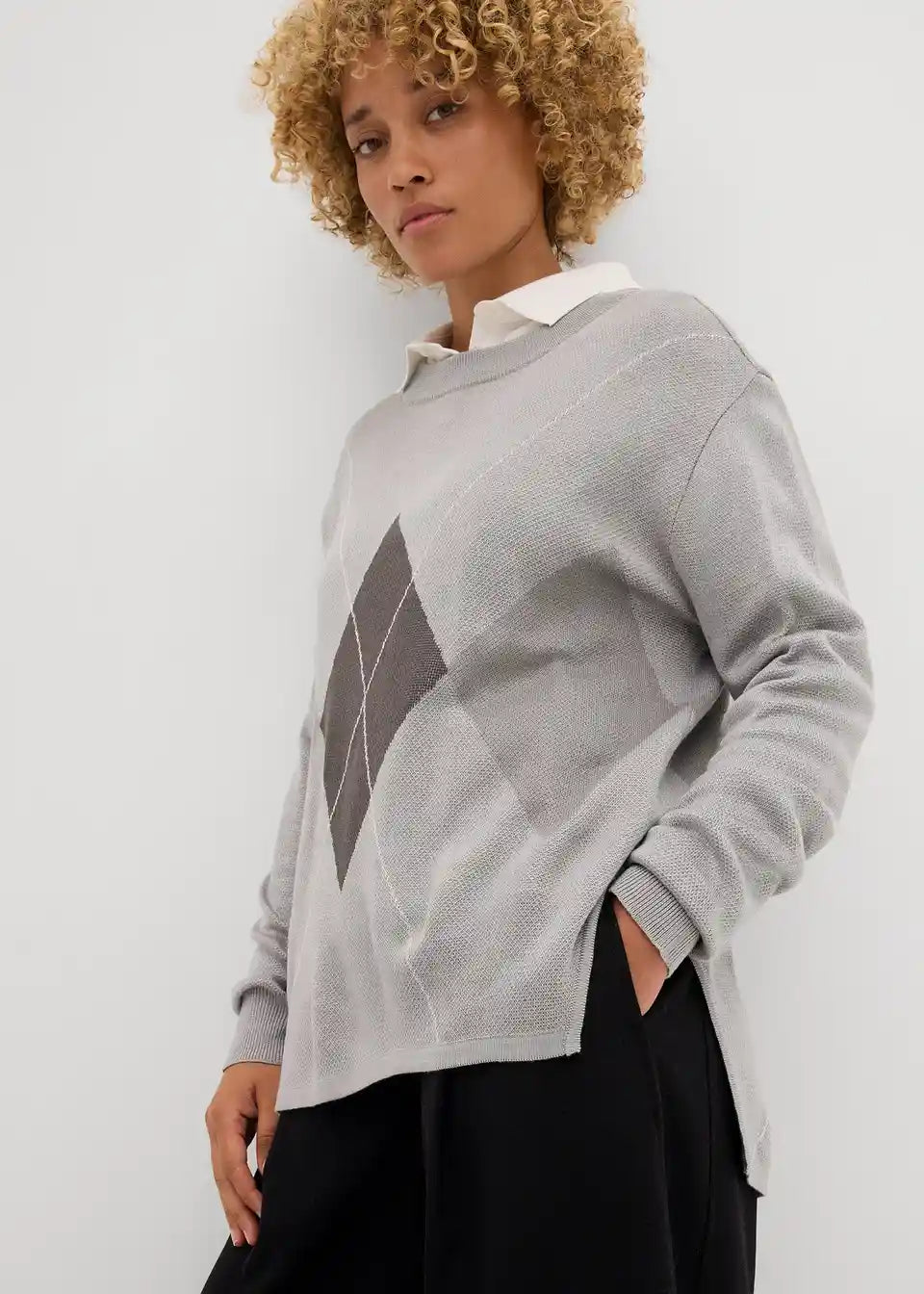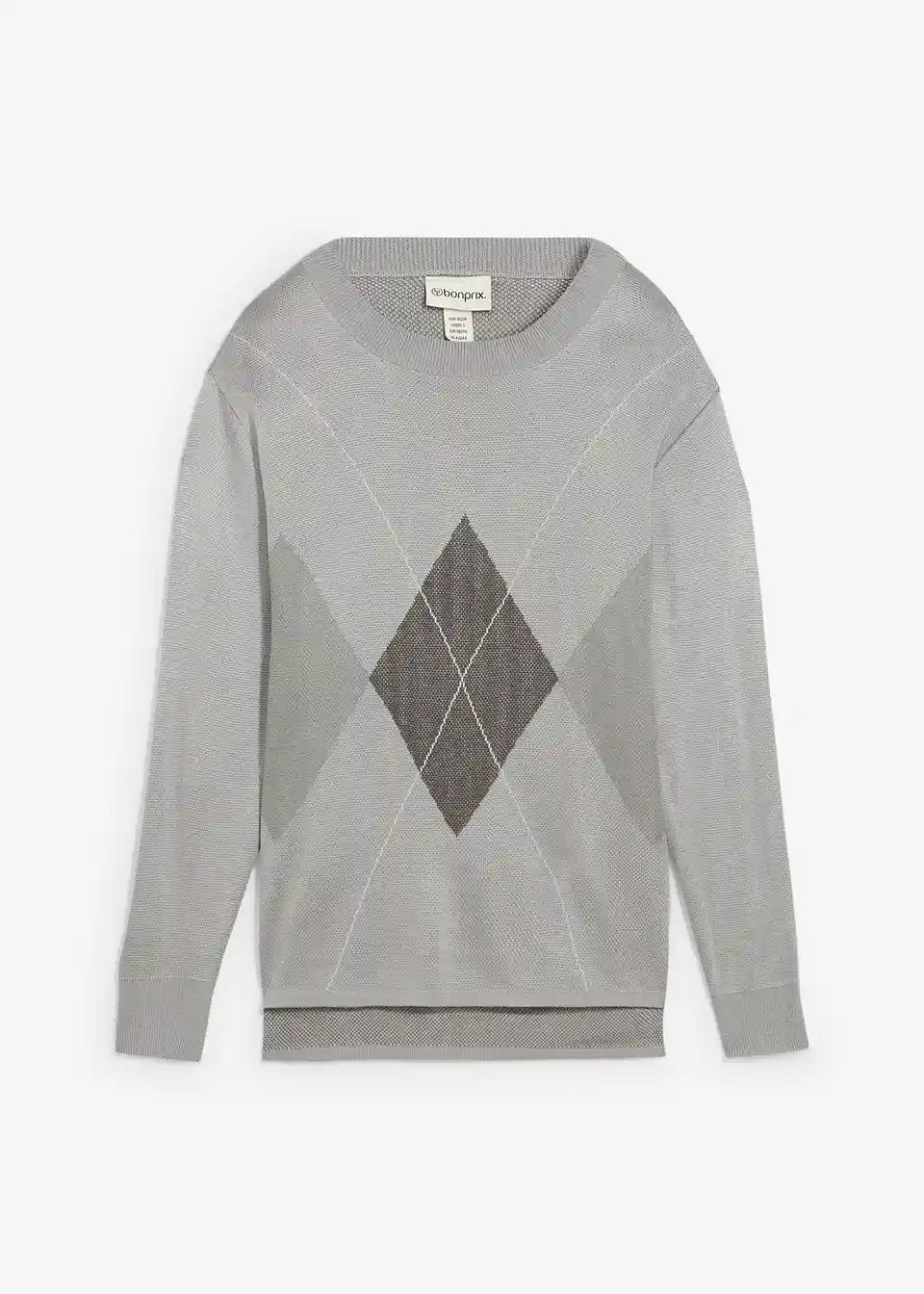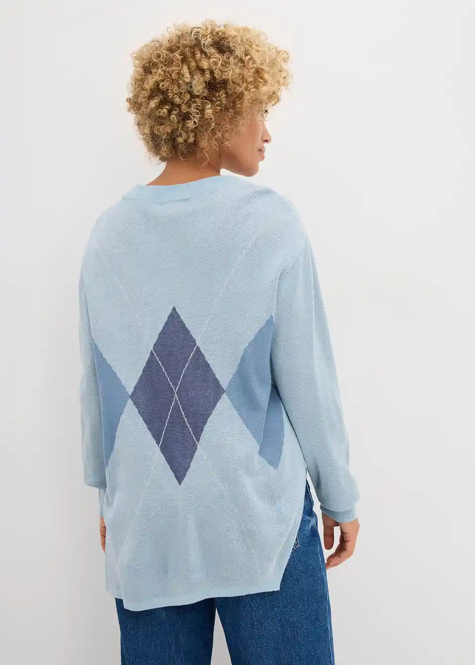 Longpulover s opuštenim ramenima i produženim stražnjim rubom. Široki kroj.