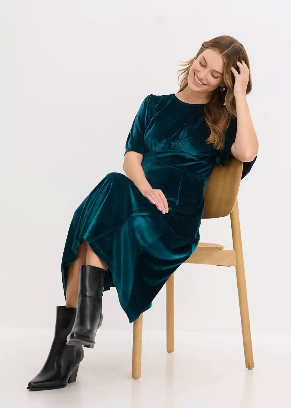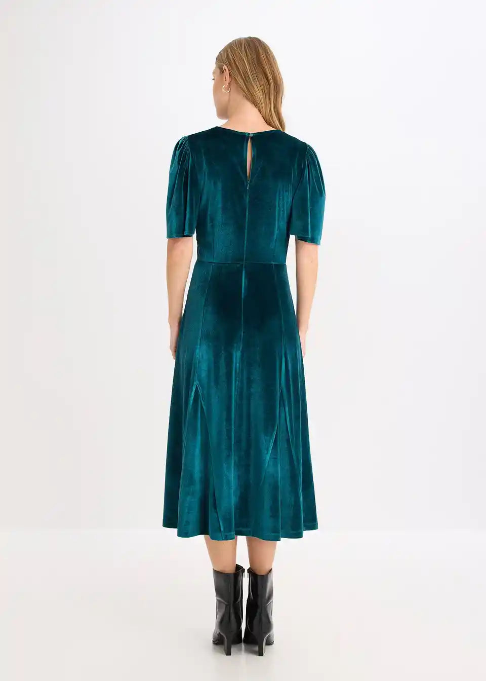 ženstvena midi haljina od mekog baršuna s lepršavom suknjom i krilastim rukavima