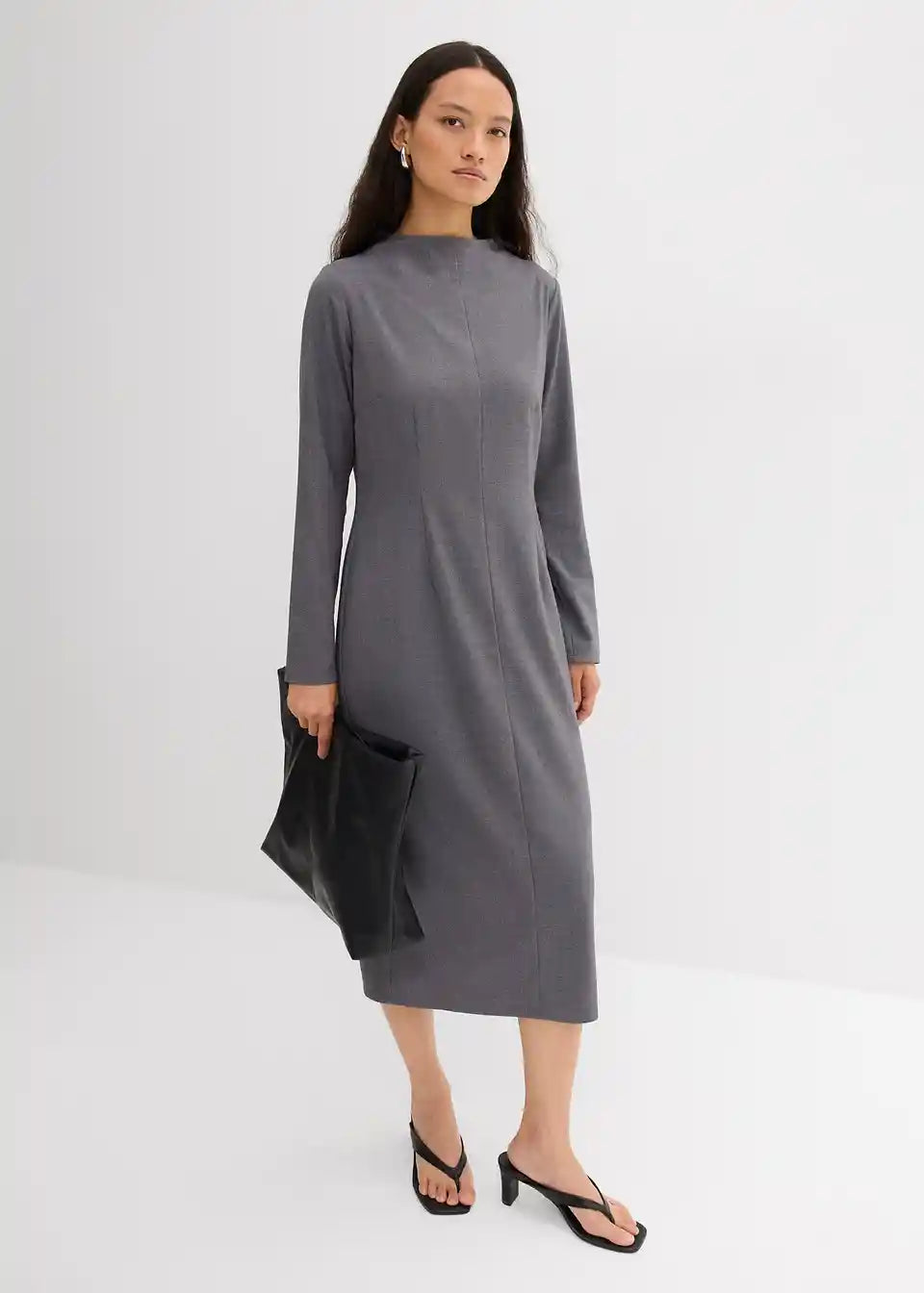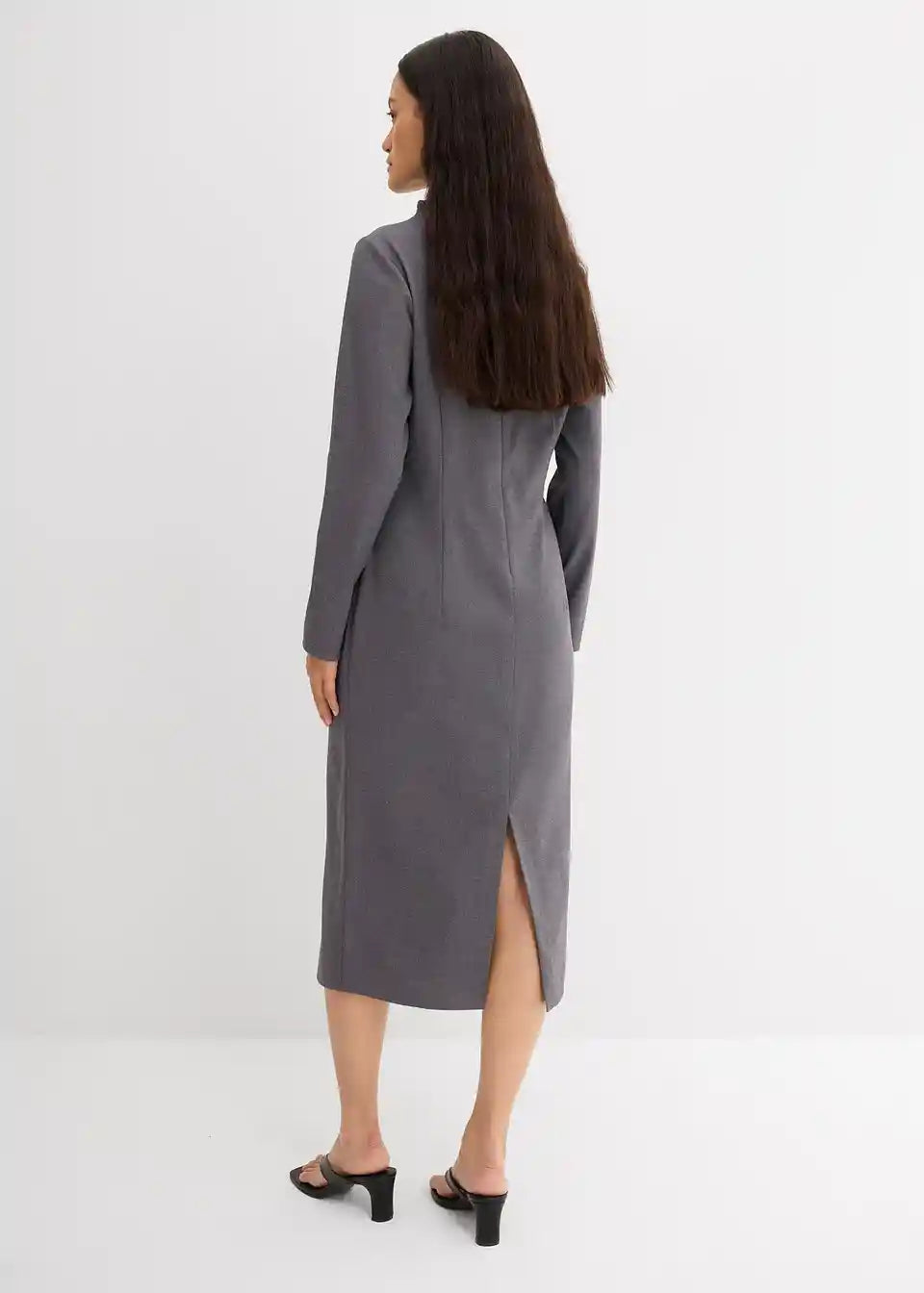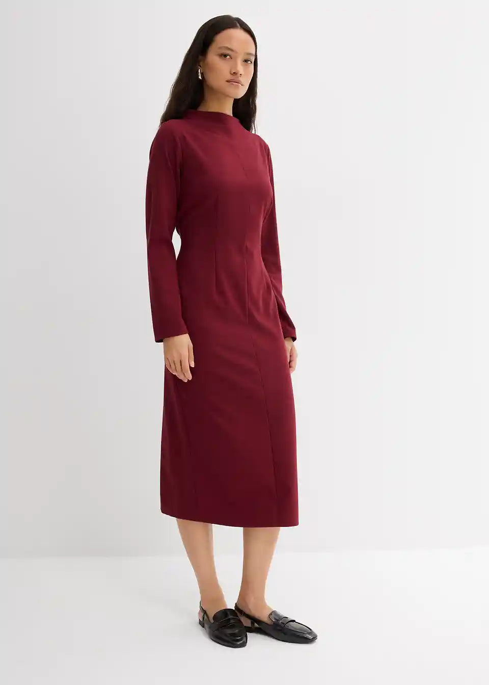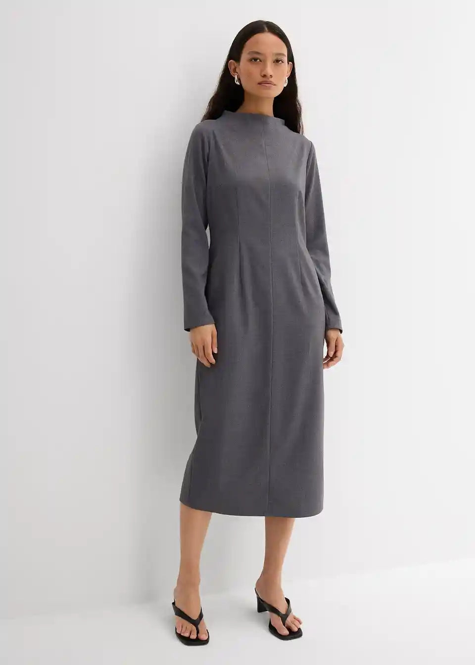 Zatvorena midi haljina s ušitcima i odvojnim šavovima sprijeda i straga te patentnim zatvaračem na leđima