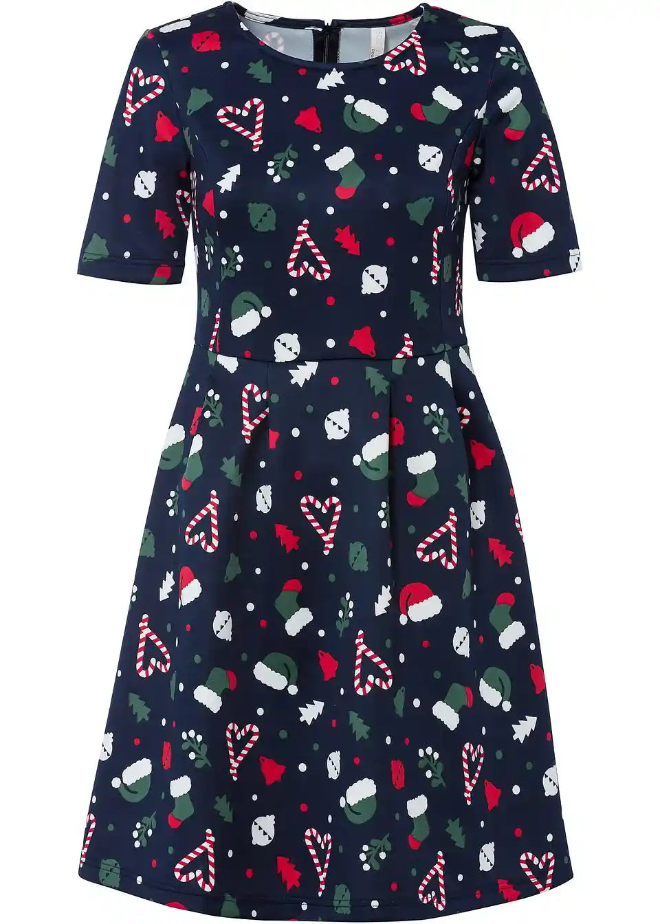 Šarmantna haljina s A-krojem, poludugim rukavima i slatkim božićnim motivom