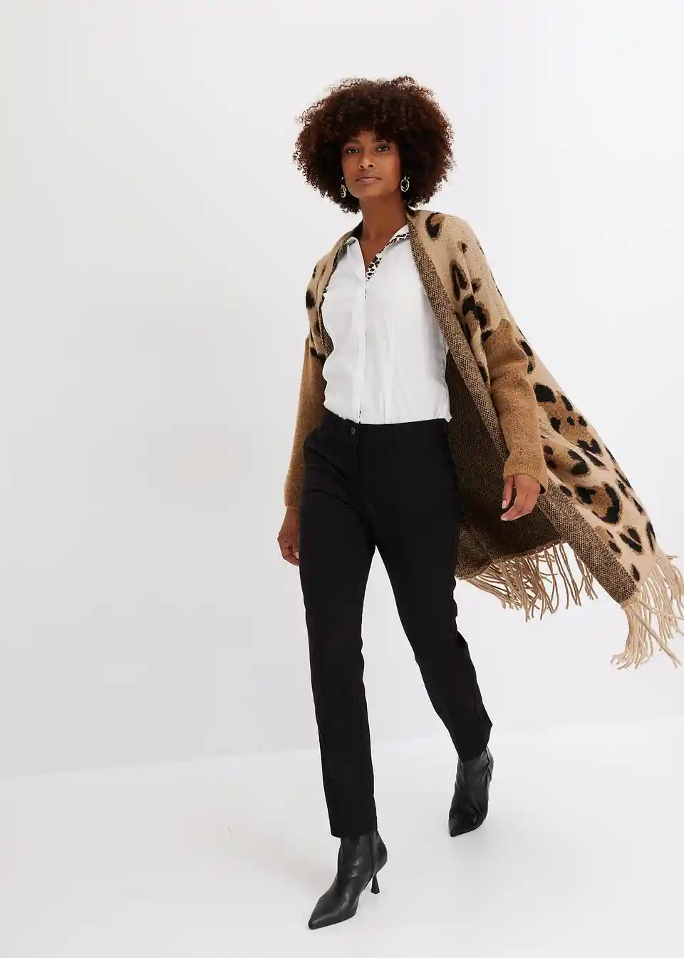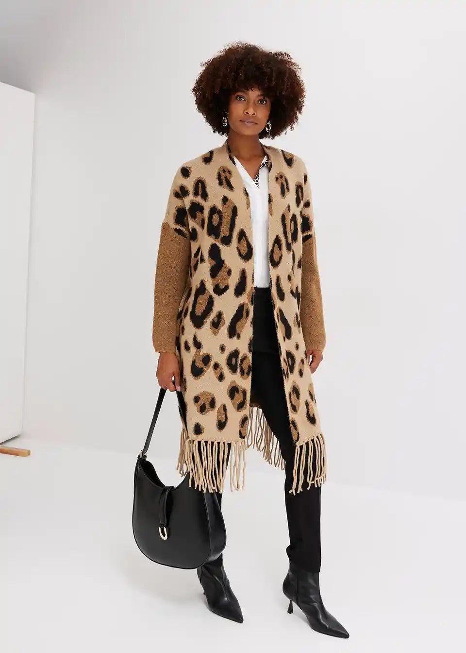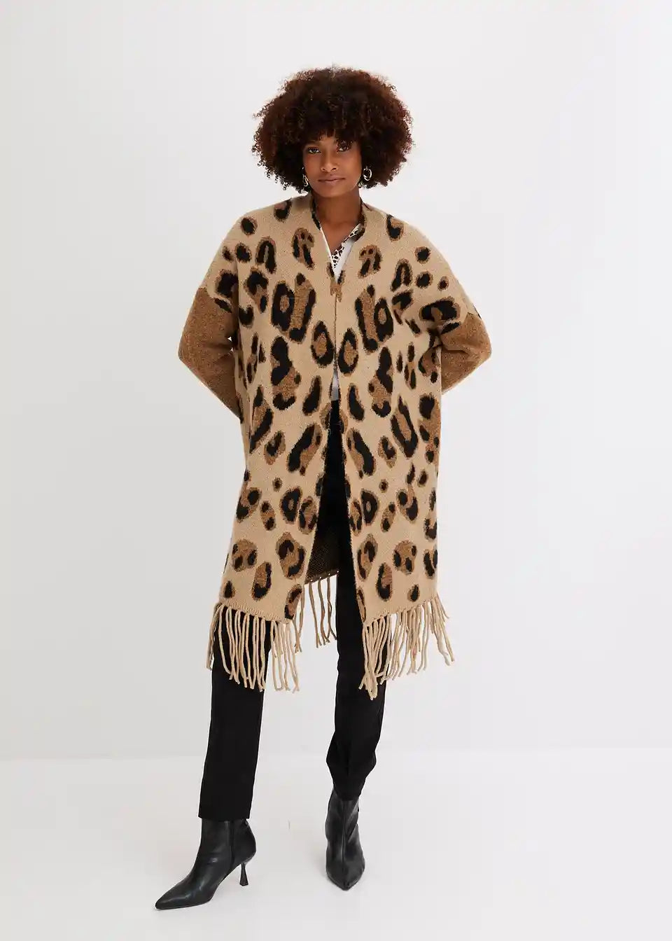Moderna pletena jakna s leopard uzorkom i resicama