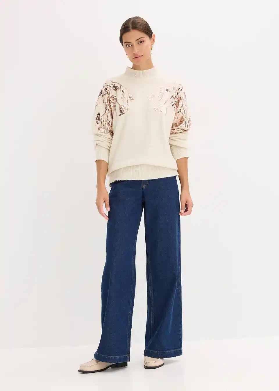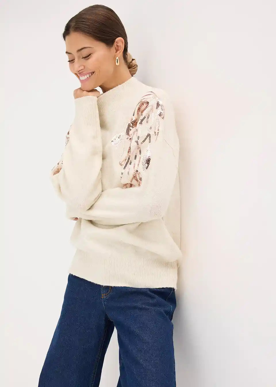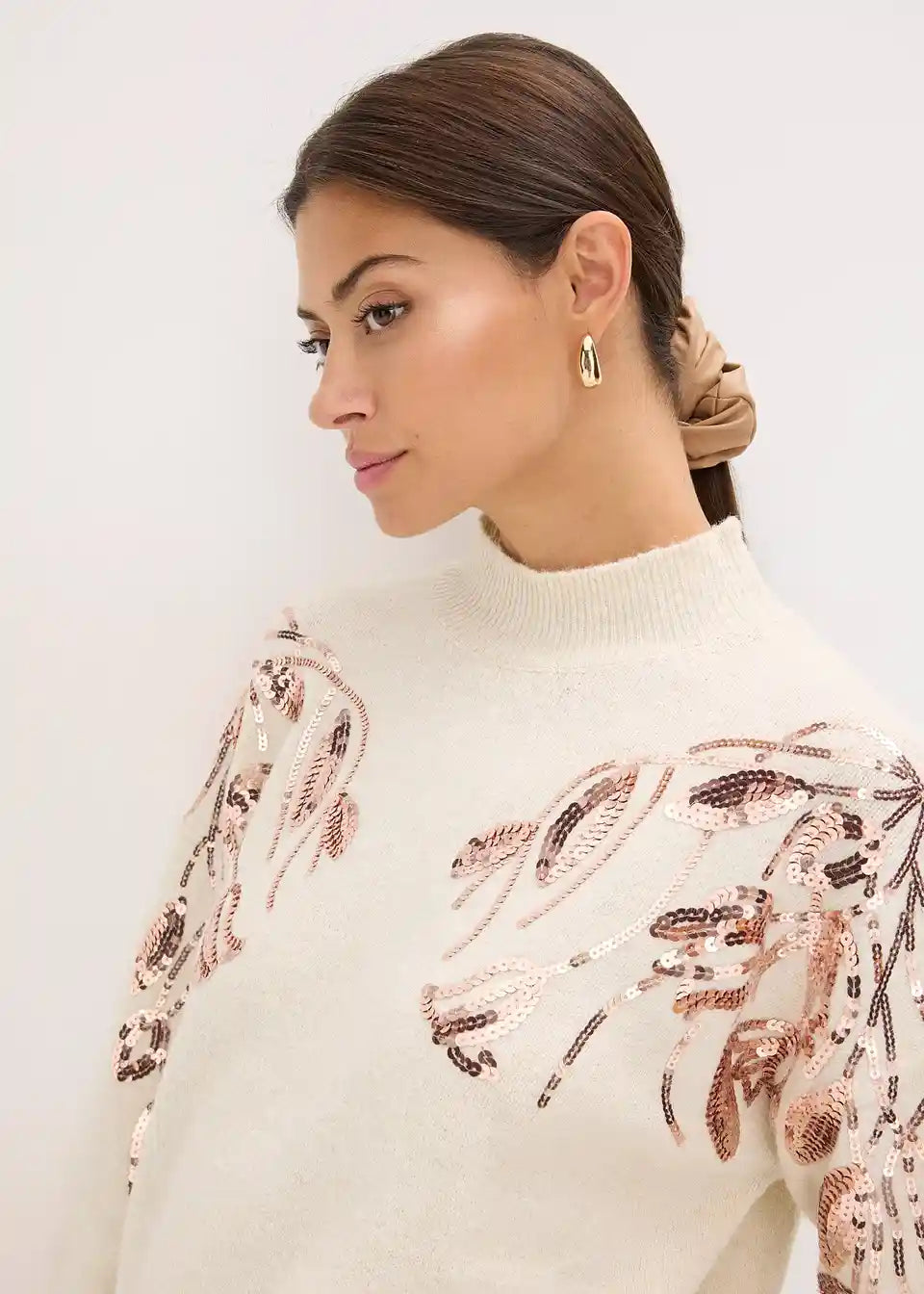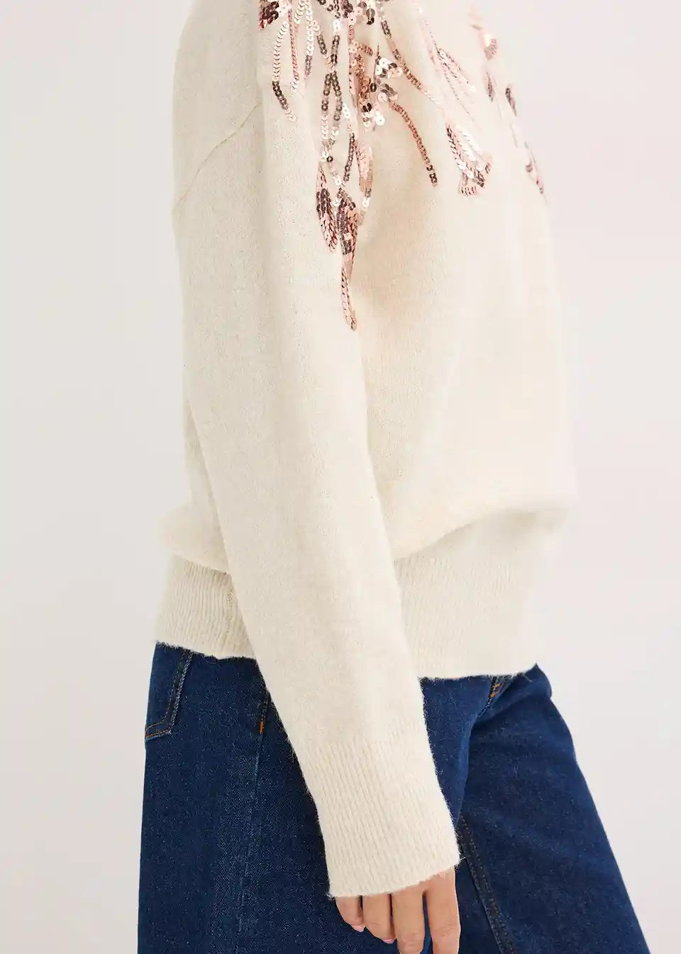 mekani oversize-pulover s dekorativnom aplikacijom od šljokica sprijeda i na rukavu