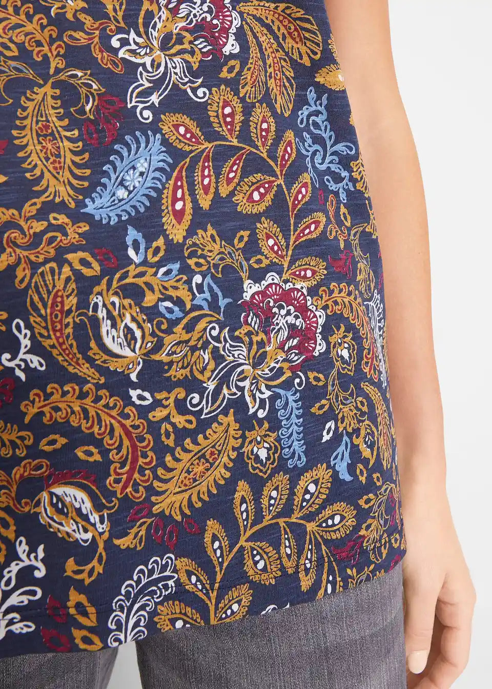 Majica s printom brenda John Baner odličan je izbor za moderne outfite. Zahvaljujući opuštenom kroju i dužini koja prekriva bokove, lijepo pristaje i vizualno oblikuje figuru. Šareni Allover print i mali volani na rukavima daju majici atraktivan izgled. U kombinaciji s trapericama 3/4 dužine, ova majica izgleda fantastično za slobodno vrijeme.