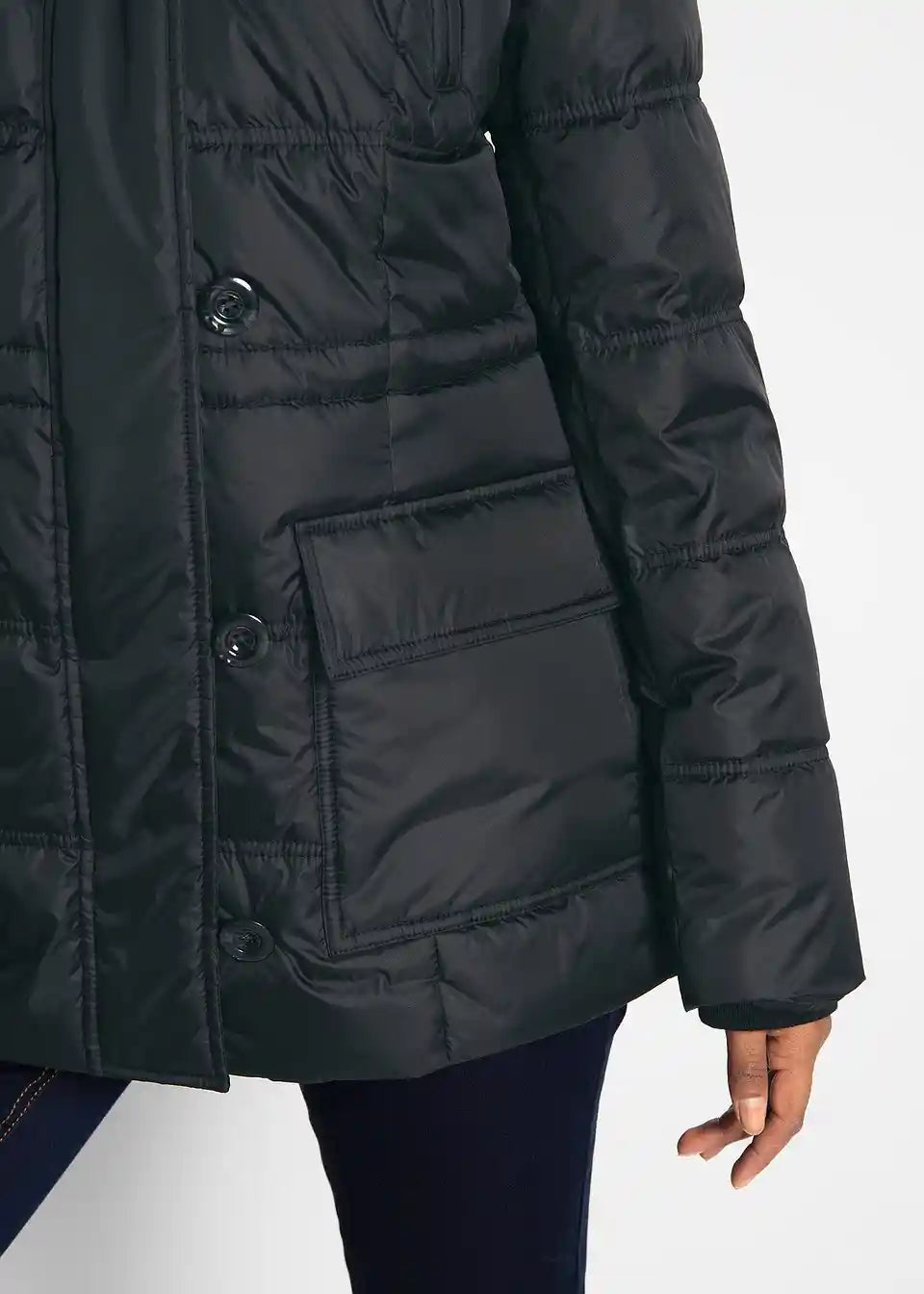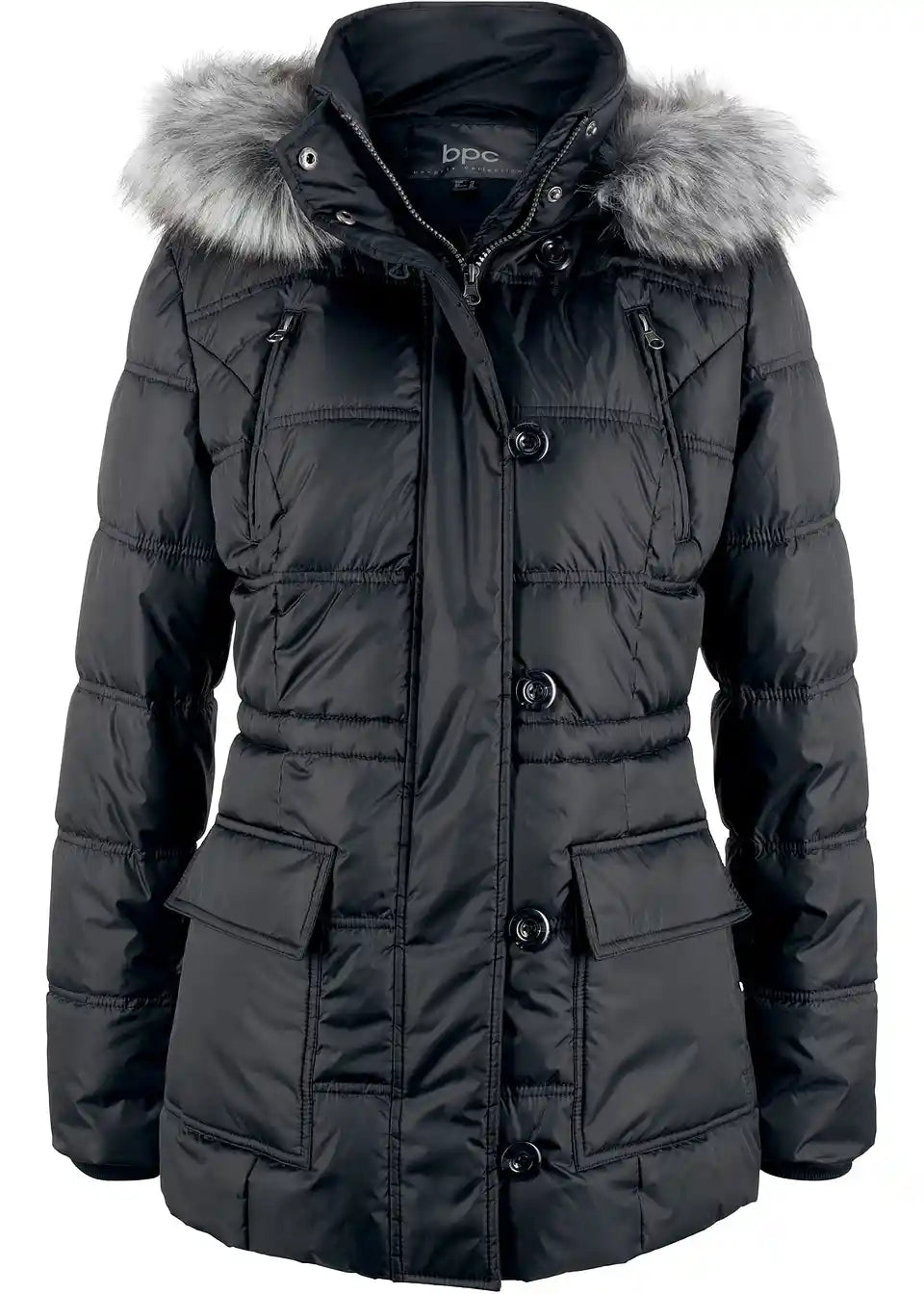 Lagano podstavljena, s atraktivnim pikiranim uzorkom i udobnom dužinom koja prekriva bokove, ova udobna pikirana jakna s kapuljačom dolazi iz bpc kolekcije. Na prednjoj strani jakne nalaze se dva velika džepa s preklopom. Vrlo praktični su i dva ušivena džepa s patentnim zatvaračem na visini prsa te pleteni rukavni završeci. Prednji patentni zatvarač prekriven je širokom letvicom koja se dekorativno zatvara velikim gumbima i petljama. Ukras od modernog imitacijskog krzna na kapuljači pričvršćen je drukerima i može se ukloniti.