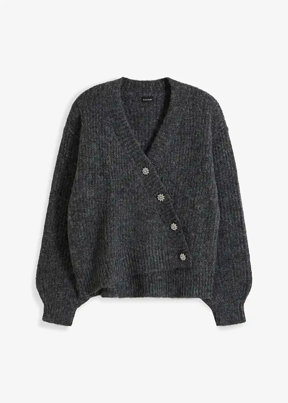feminina pletena jakna s asimetričnim zatvaračem sprijeda i dekorativnim gumbima od strasa