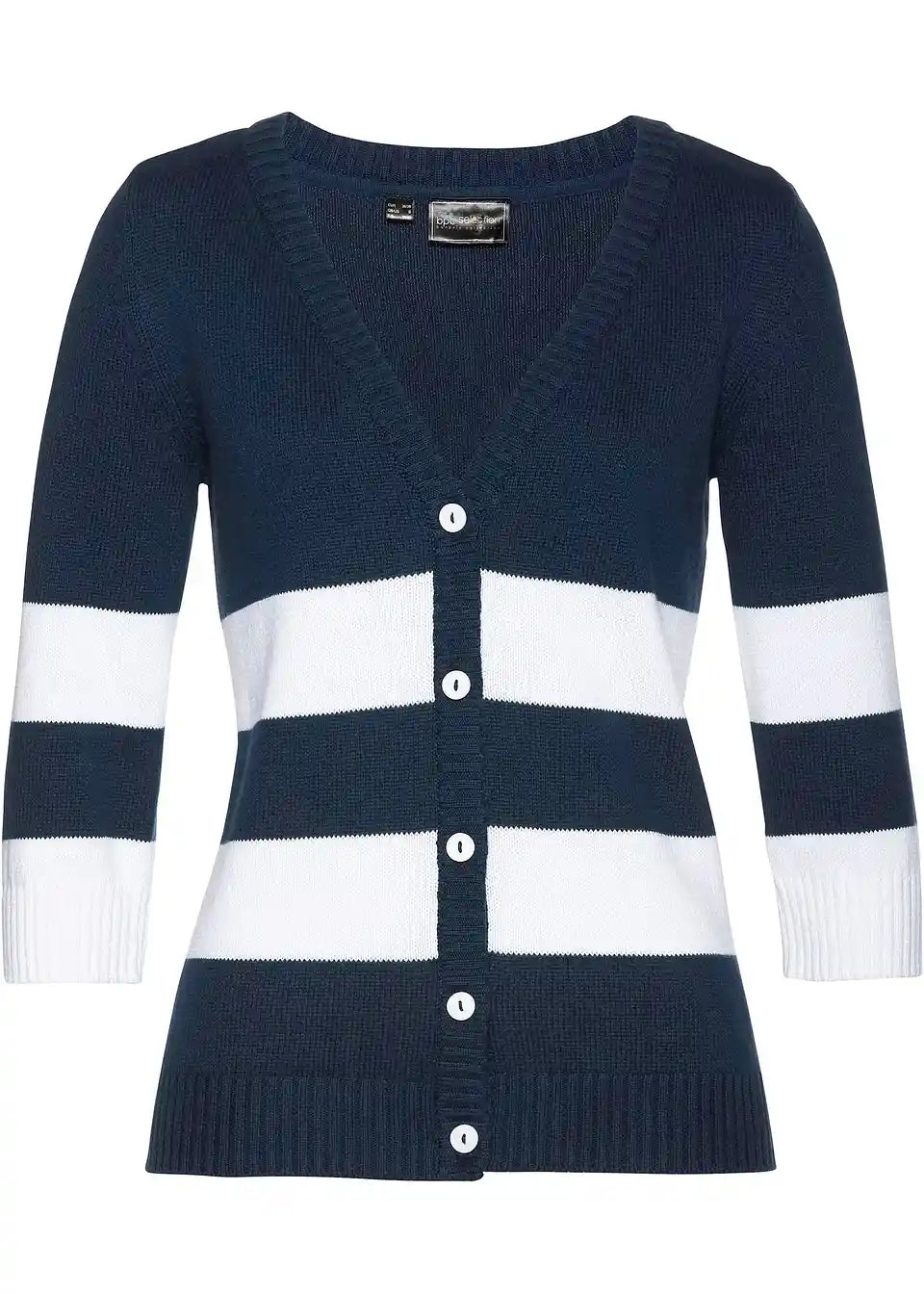 Ova prekrasna pletena jakna ističe se svojim modernim prugama. U kombinaciji s elegantnim trapericama iz bpc selection kolekcije, jednostavnom majicom i ženstvenim cipelama stvara se stilizirani outfit.