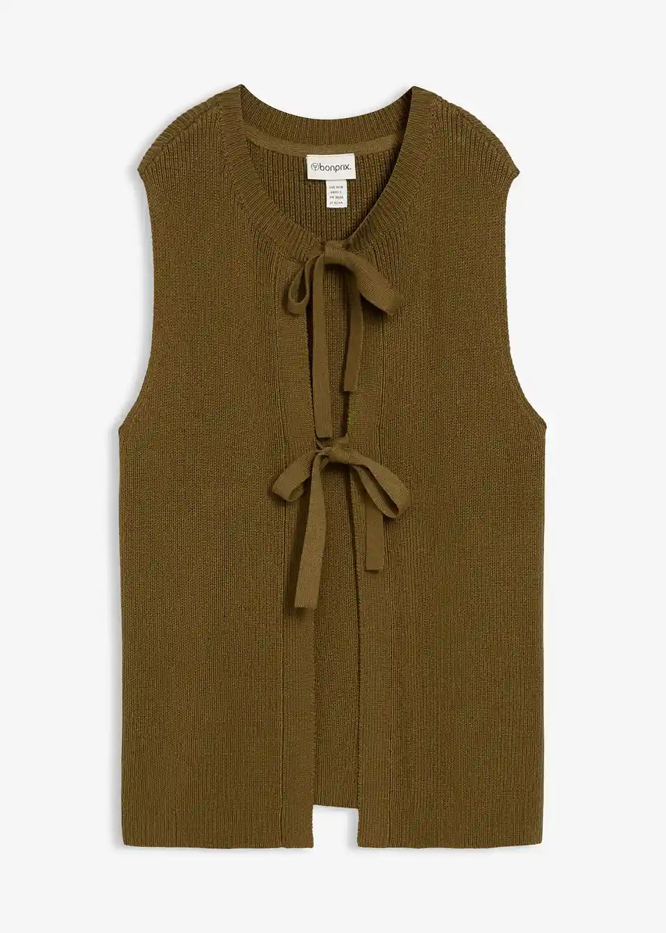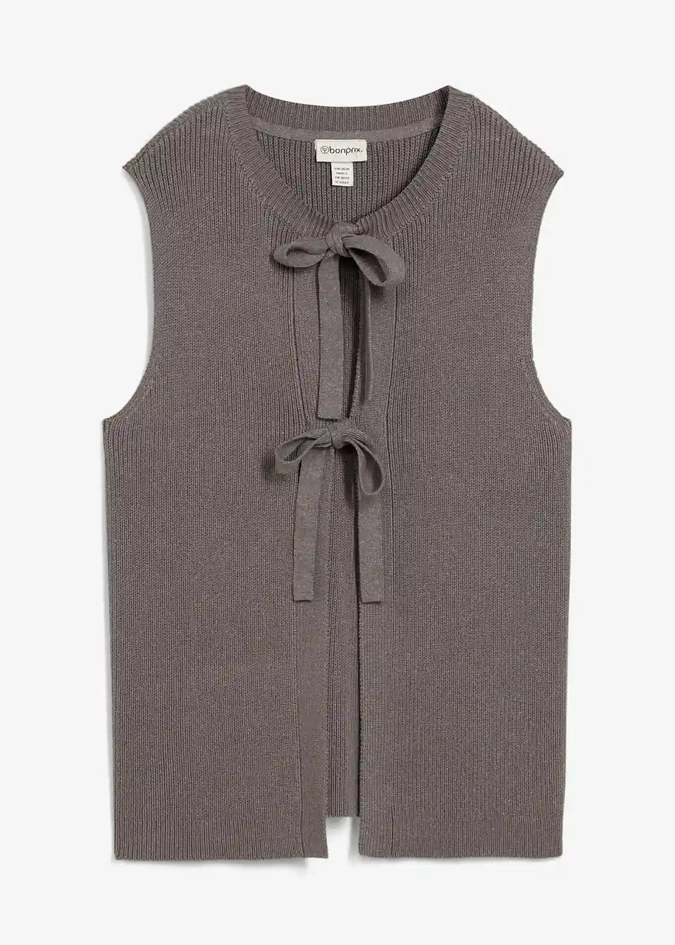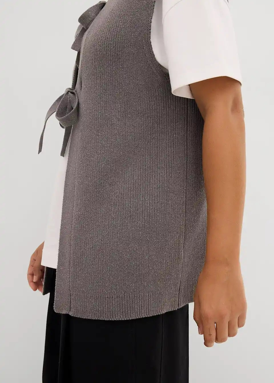 Pletena prsluk s okruglim izrezom, dva tanka para vezica i ravnim porubom.
