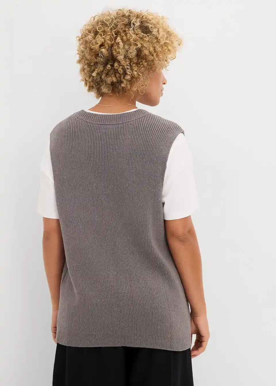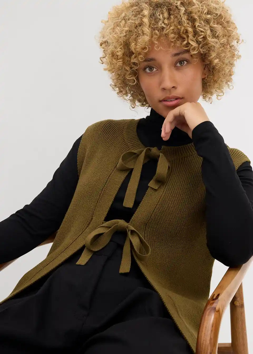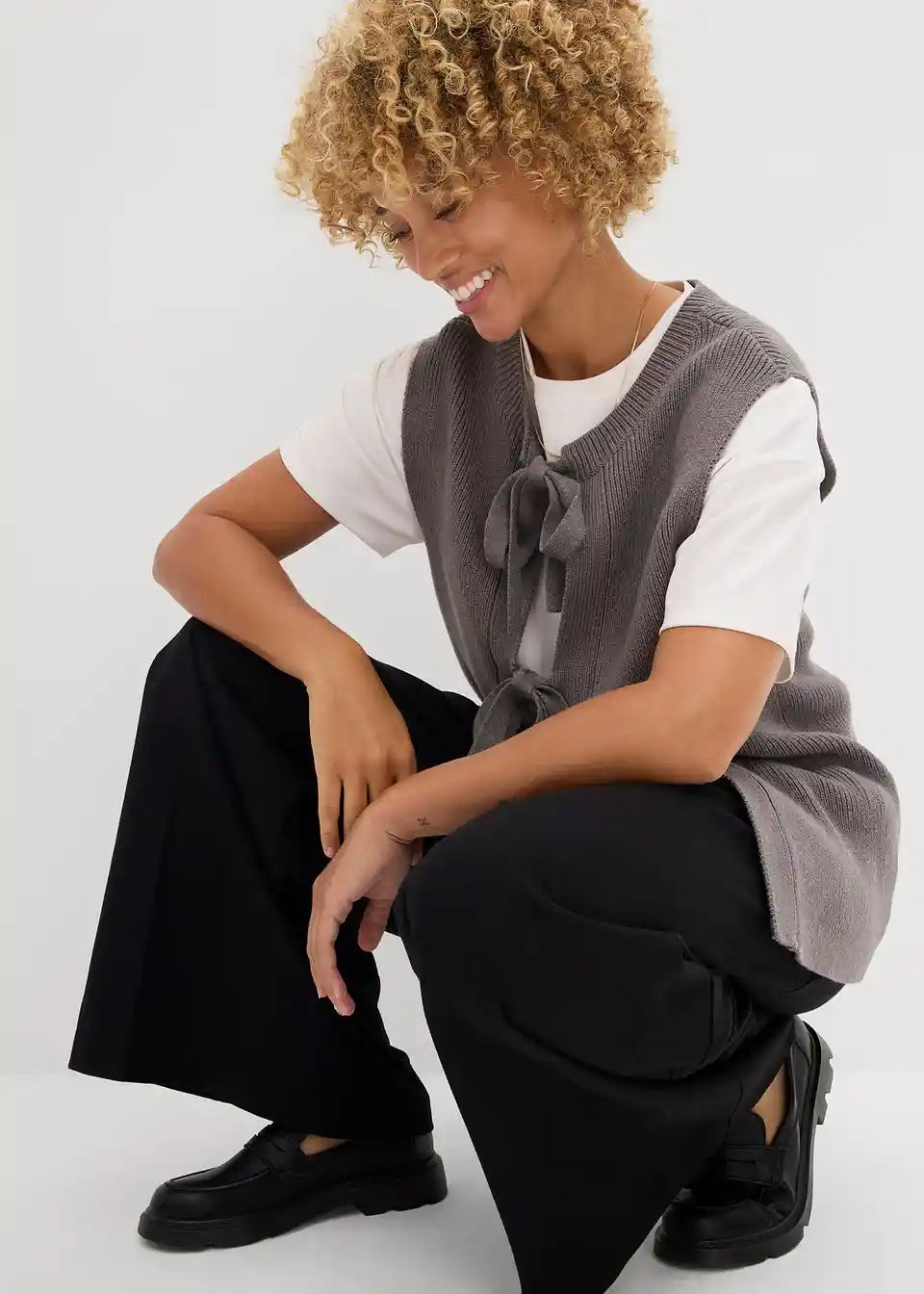 Pletena prsluk s okruglim izrezom, dva tanka para vezica i ravnim porubom.