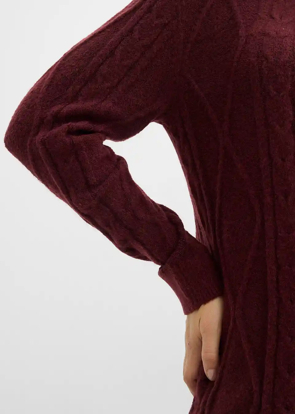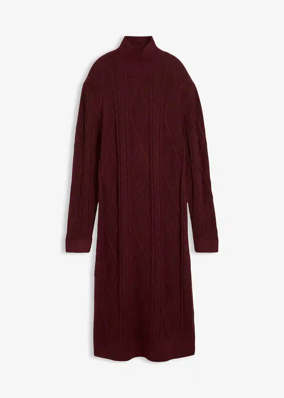 Dugačka pletena haljina širokog kroja s uzorkom pletenice. S visokim ovratnikom i spuštenim ramenima.