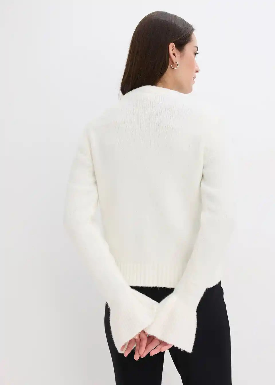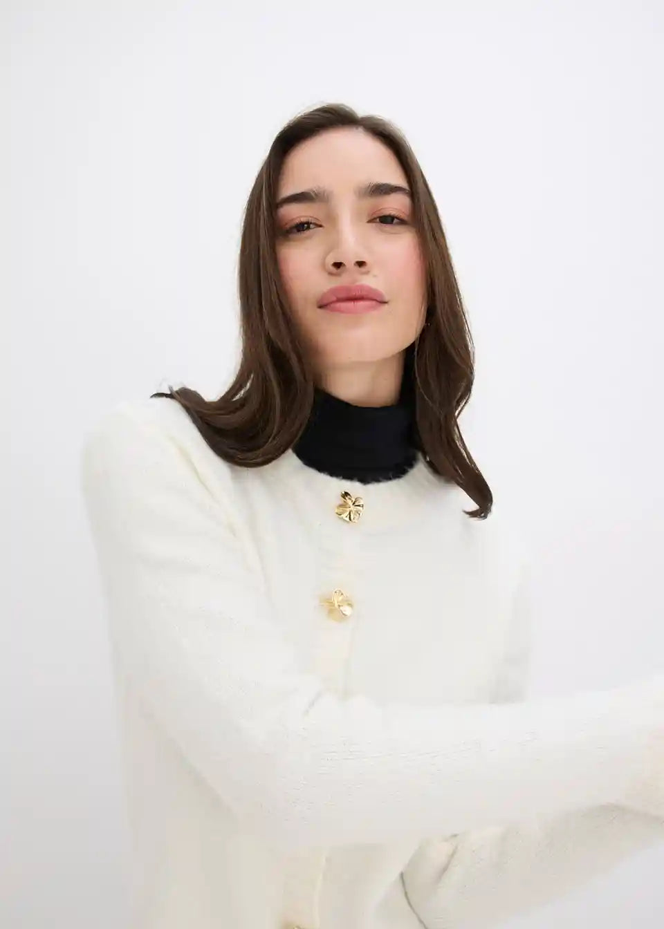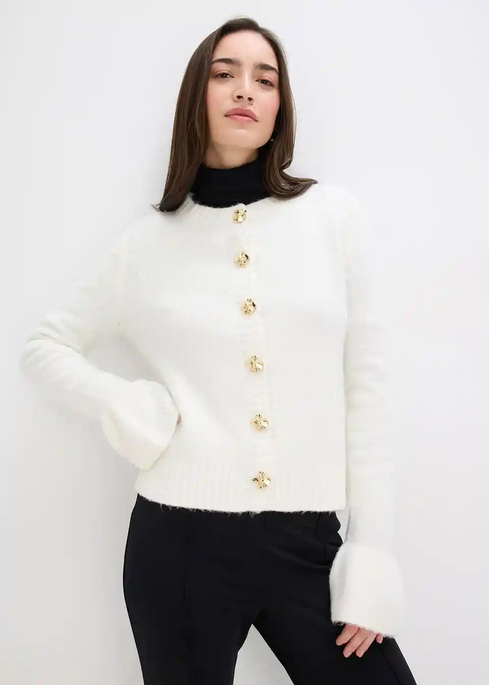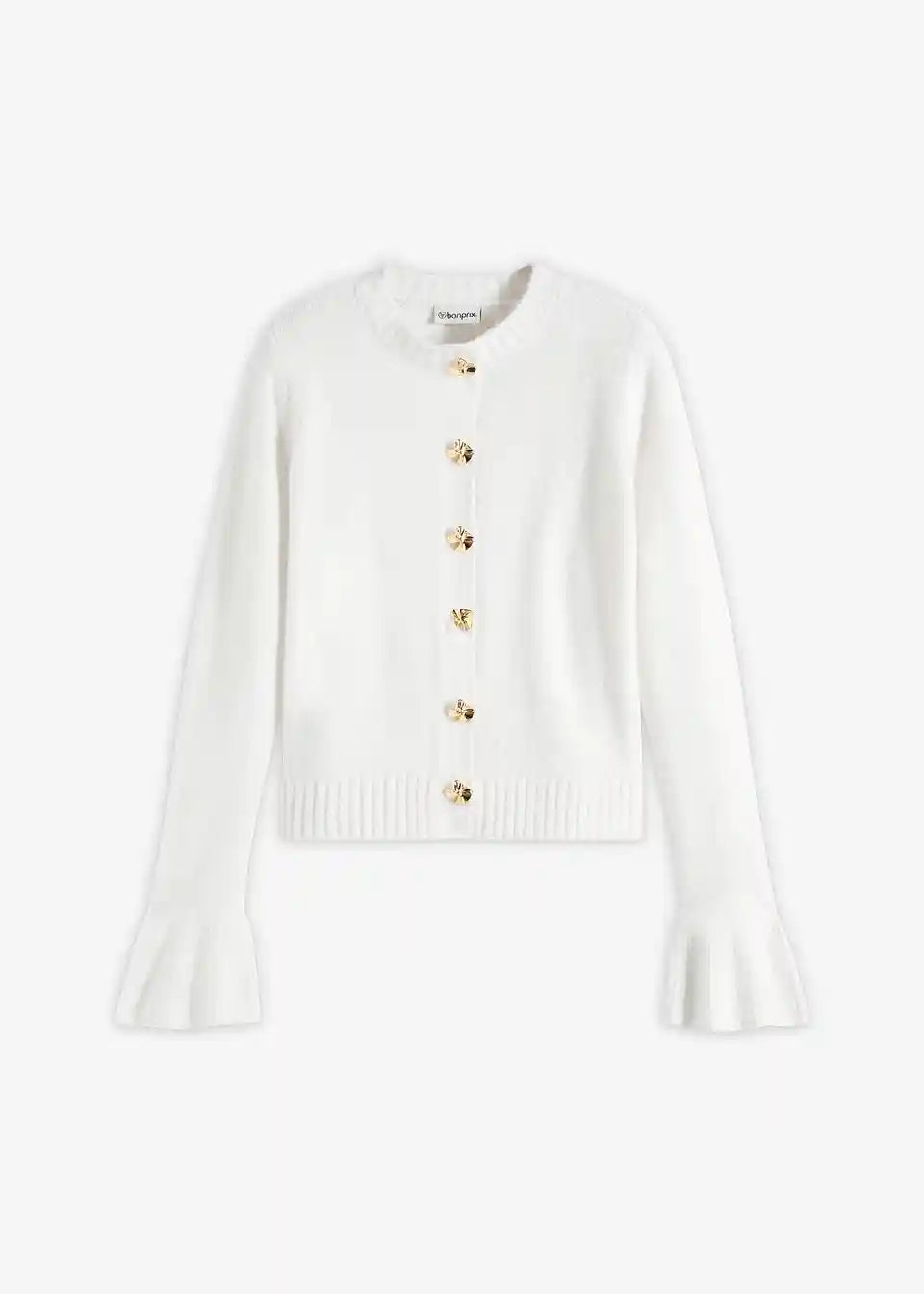 ženstveni pleteni kardigan s dekorativnim gumbima i volanima na rubu rukava