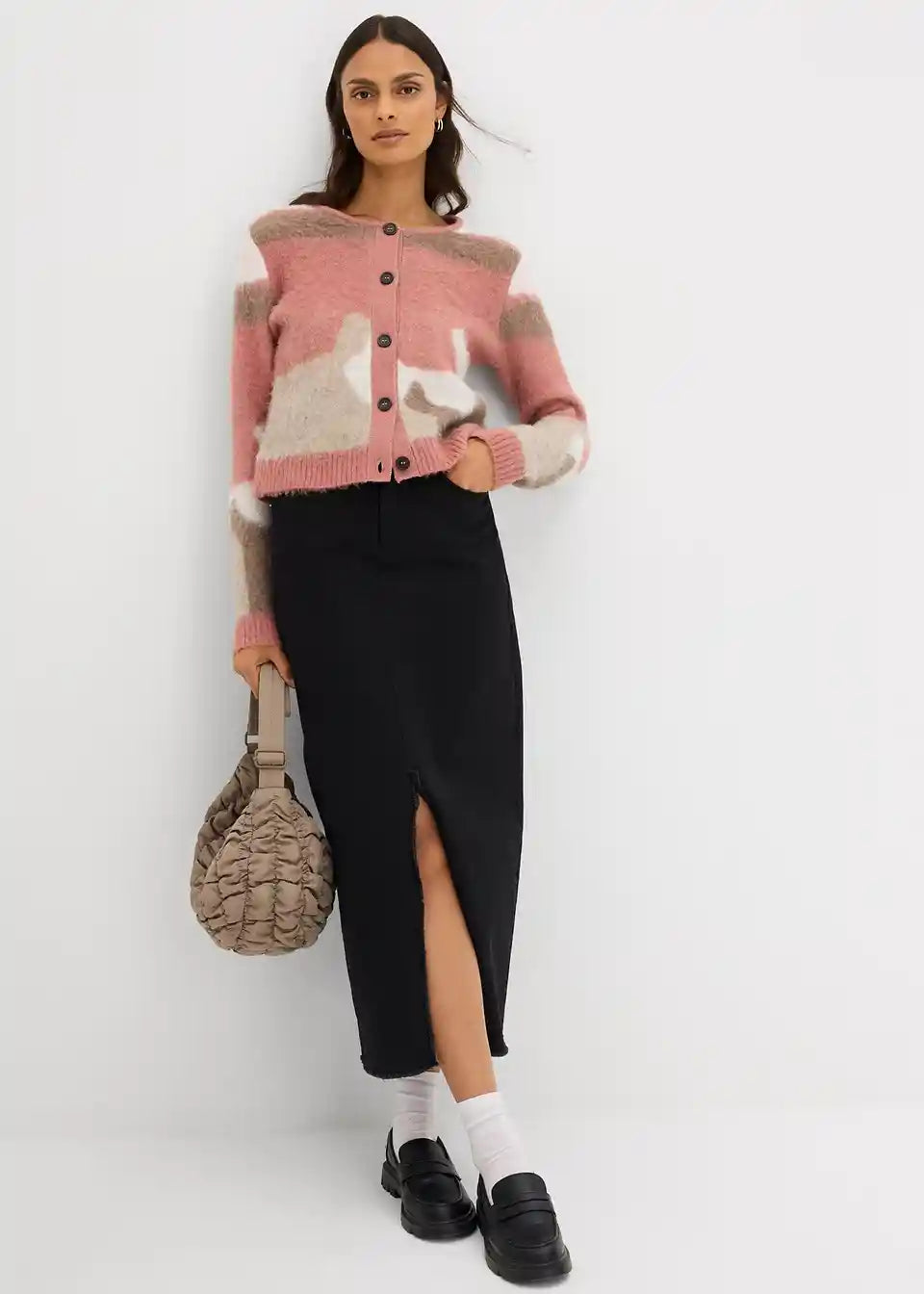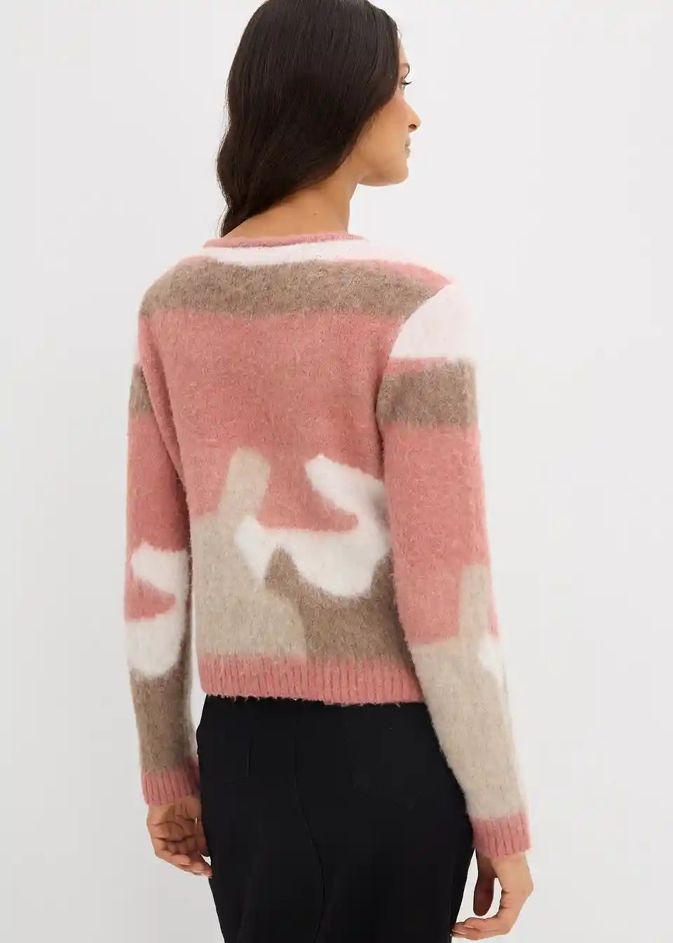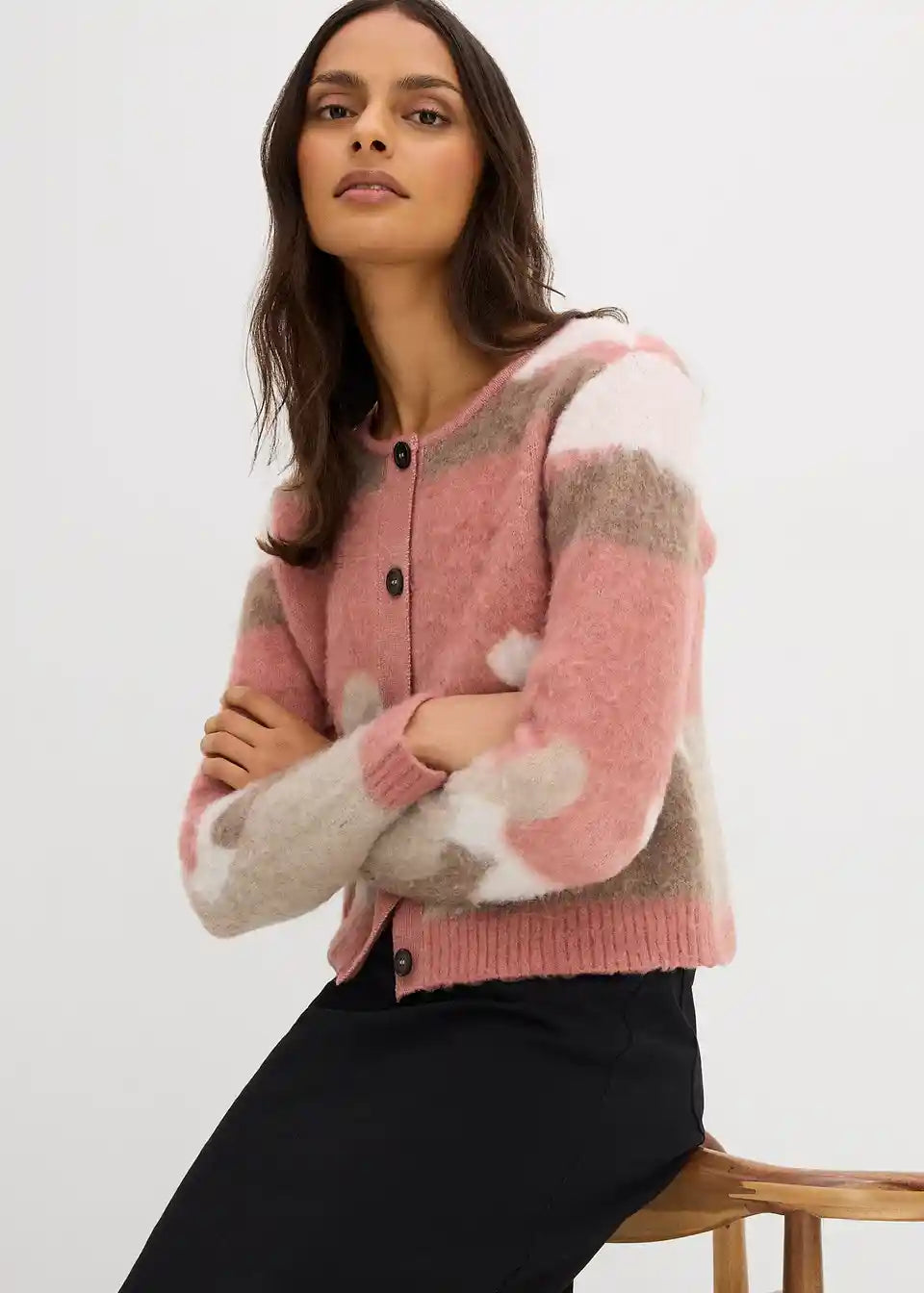 Pletena jakna s uzorkom, kopčanjem na gumbe i okruglim izrezom