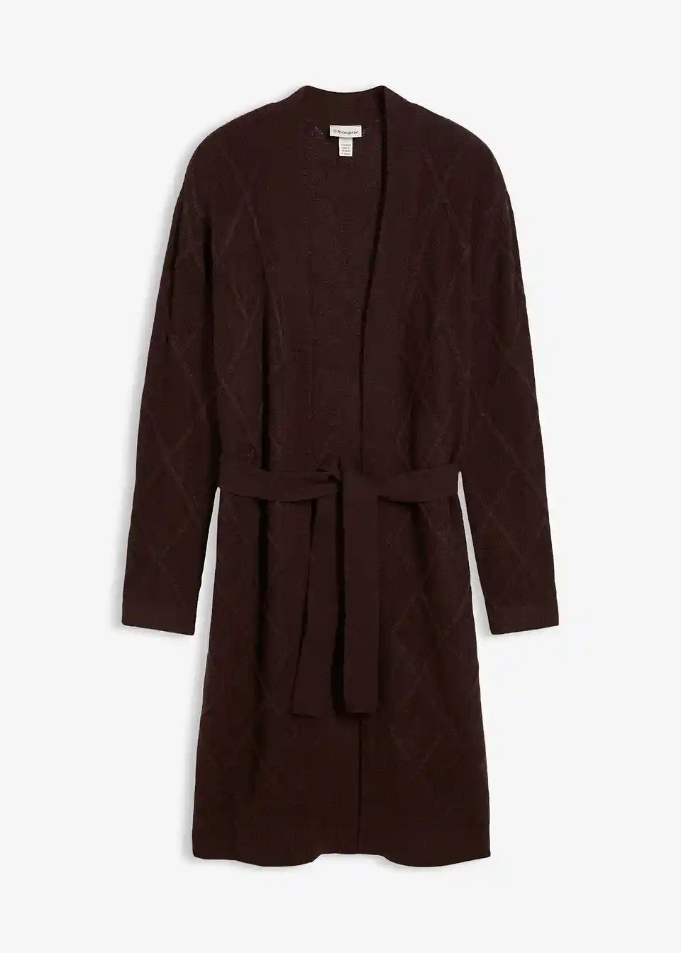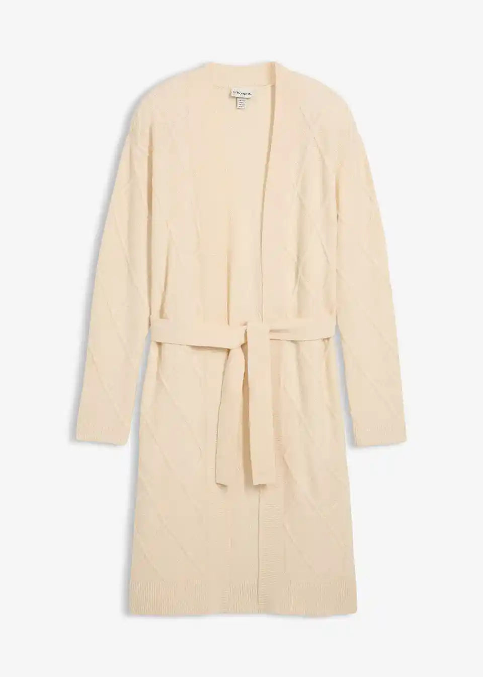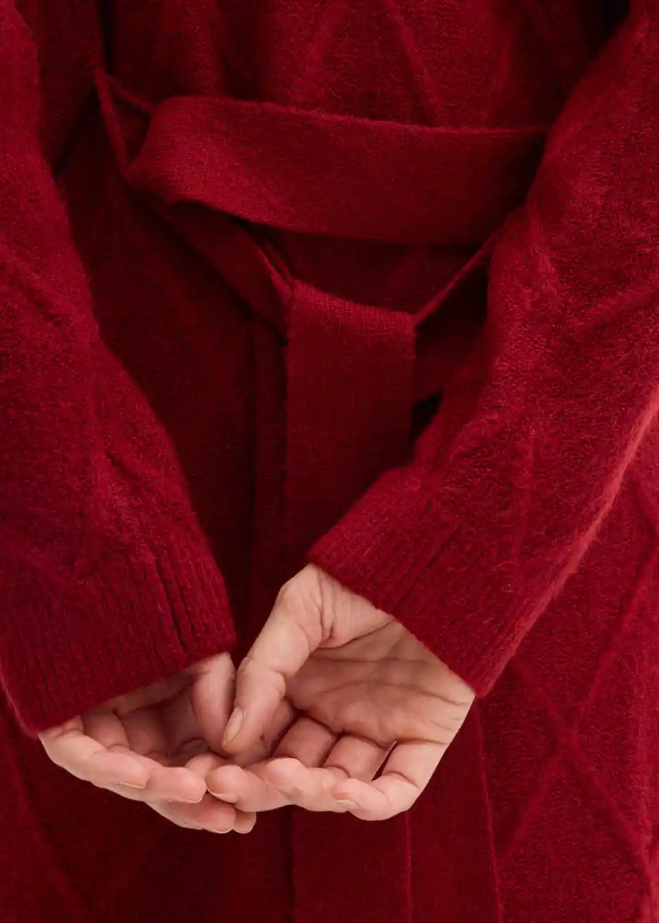 Dugi pleteni ogrtač od pletenice. Model sa spuštenim ramenima i vezanim pojasom.