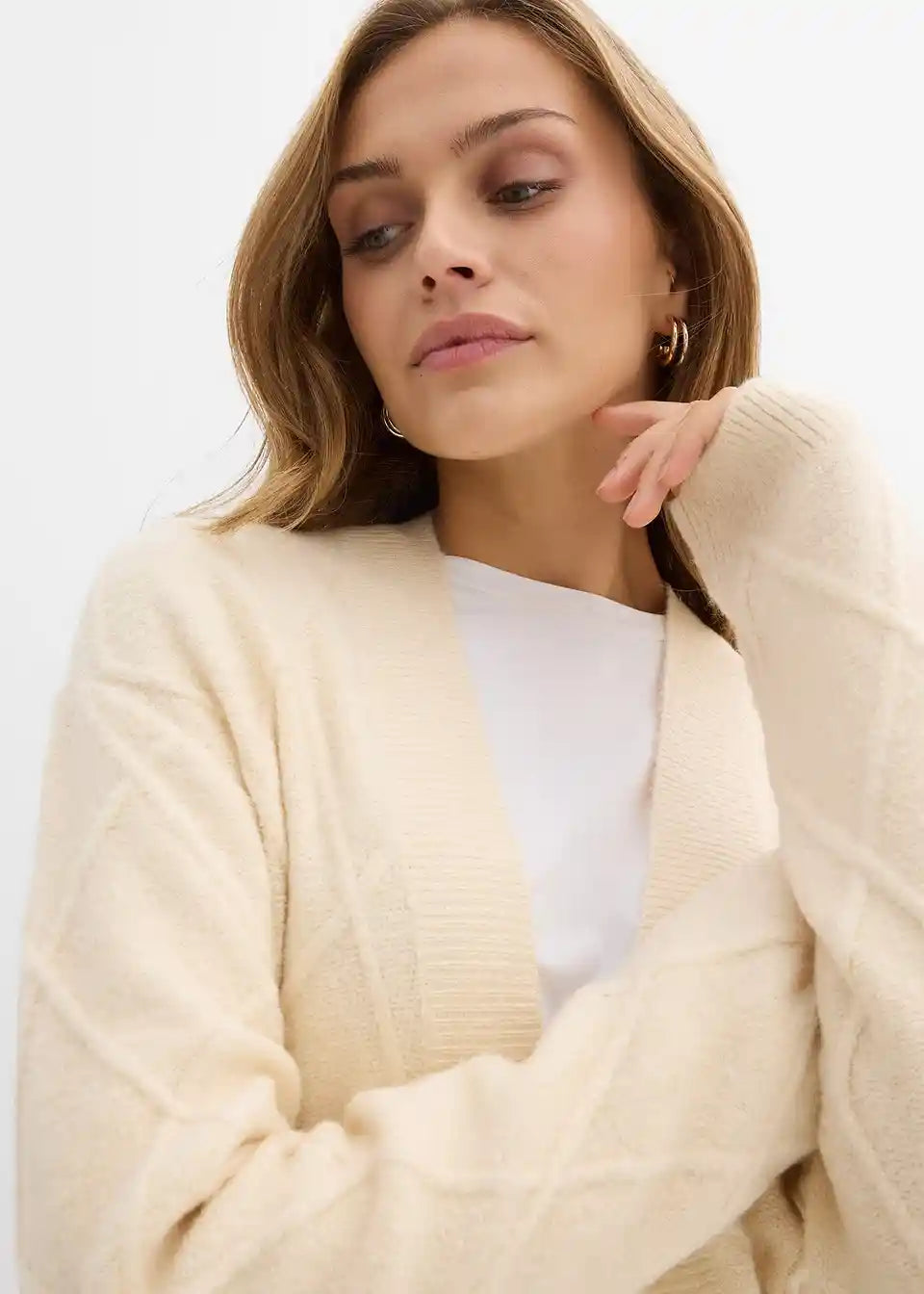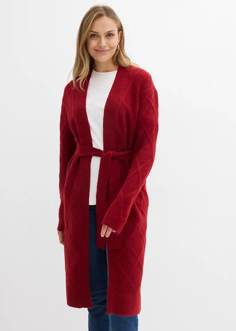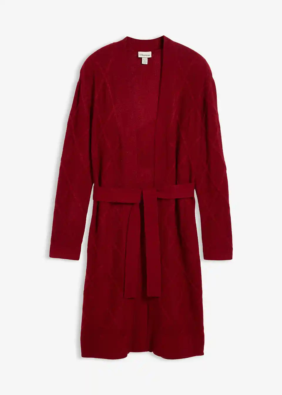 Dugi pleteni ogrtač od pletenice. Model sa spuštenim ramenima i vezanim pojasom.