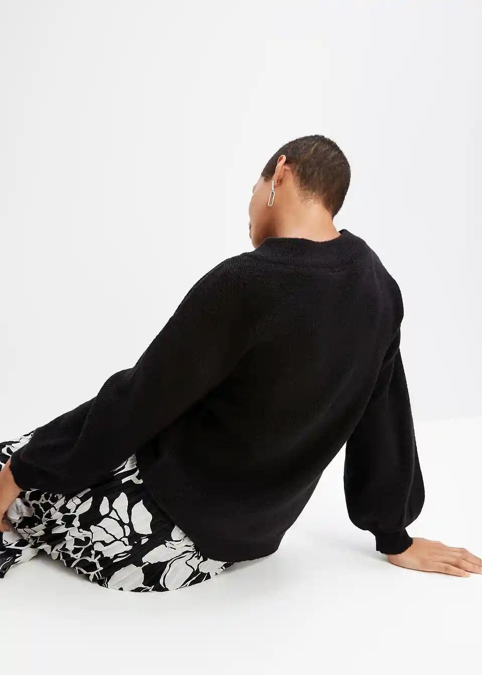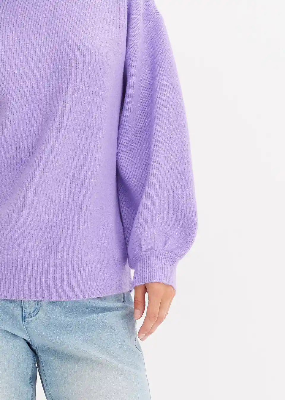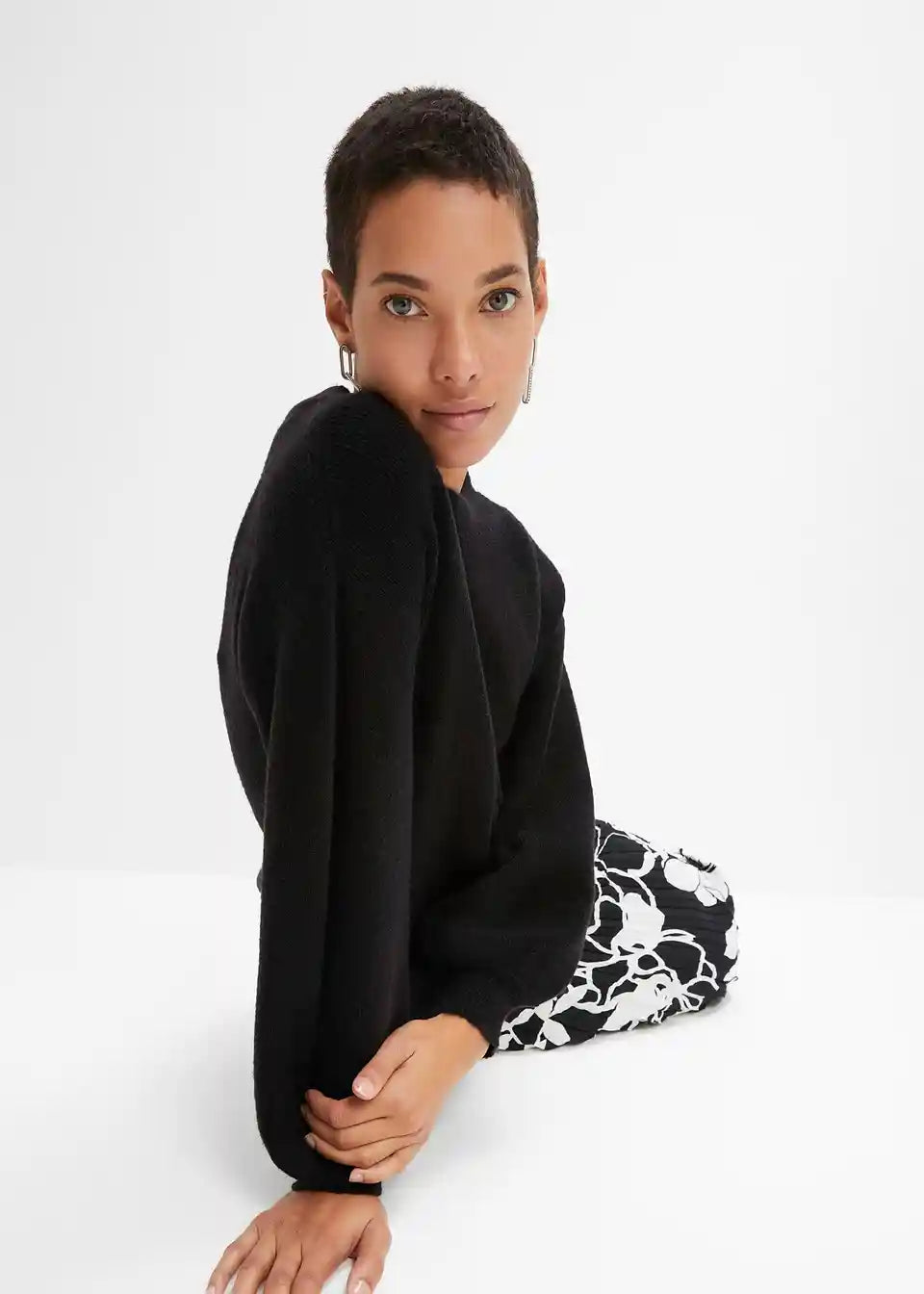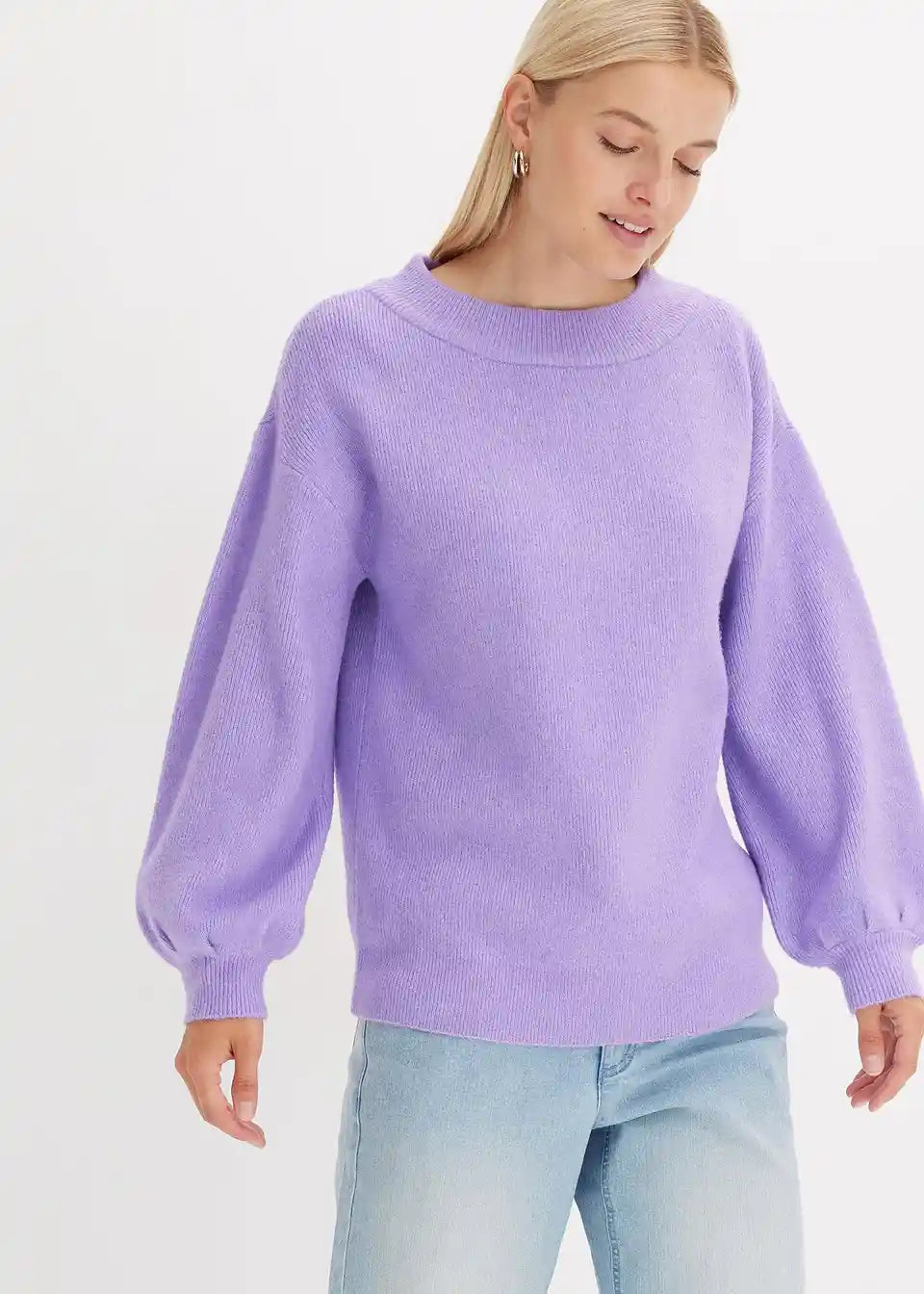 Atraktivan pletivi pulover s visokim okruglim izrezom i modernim balon rukavima