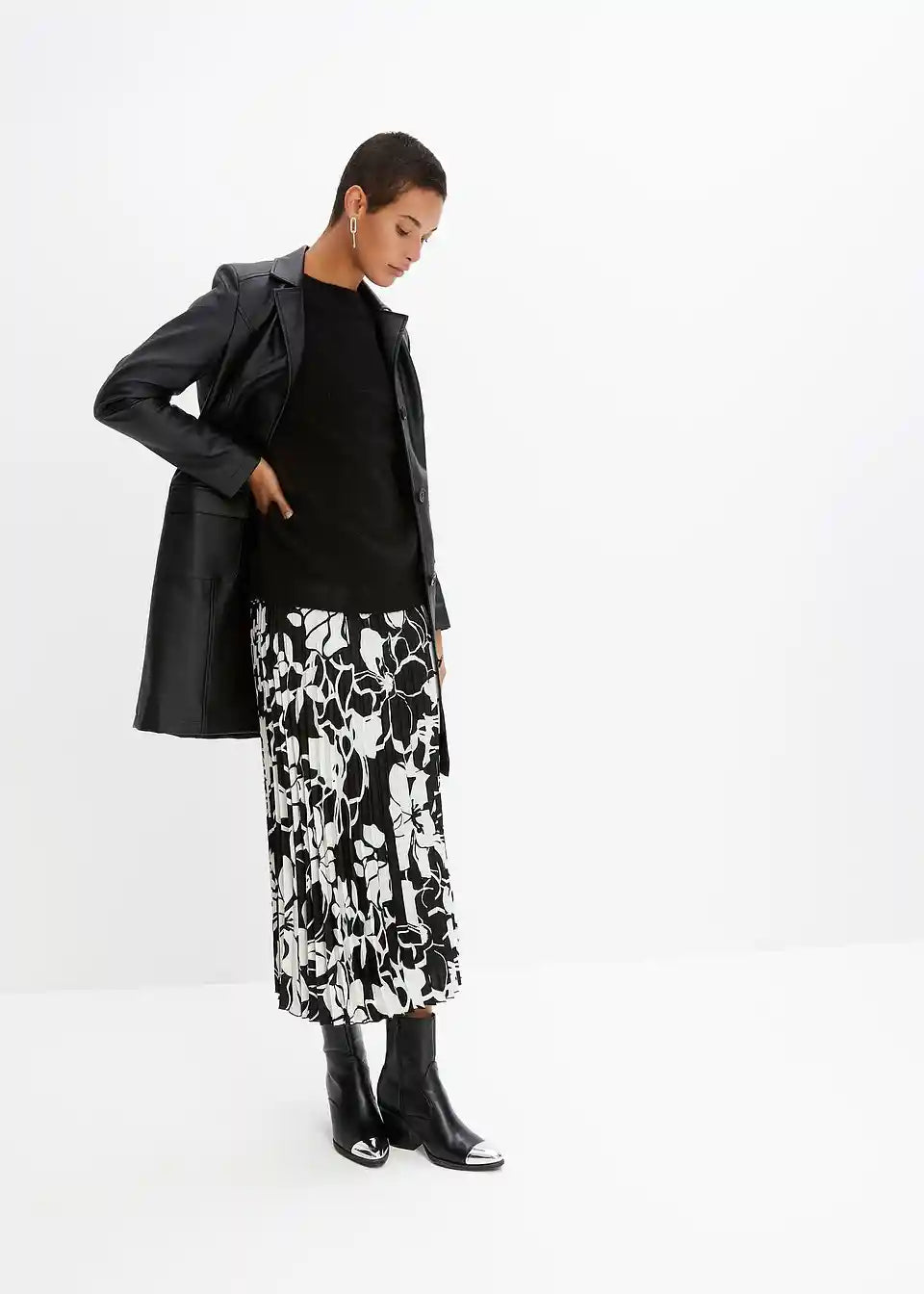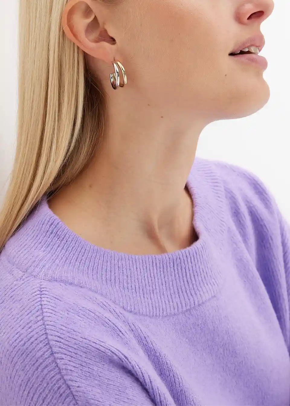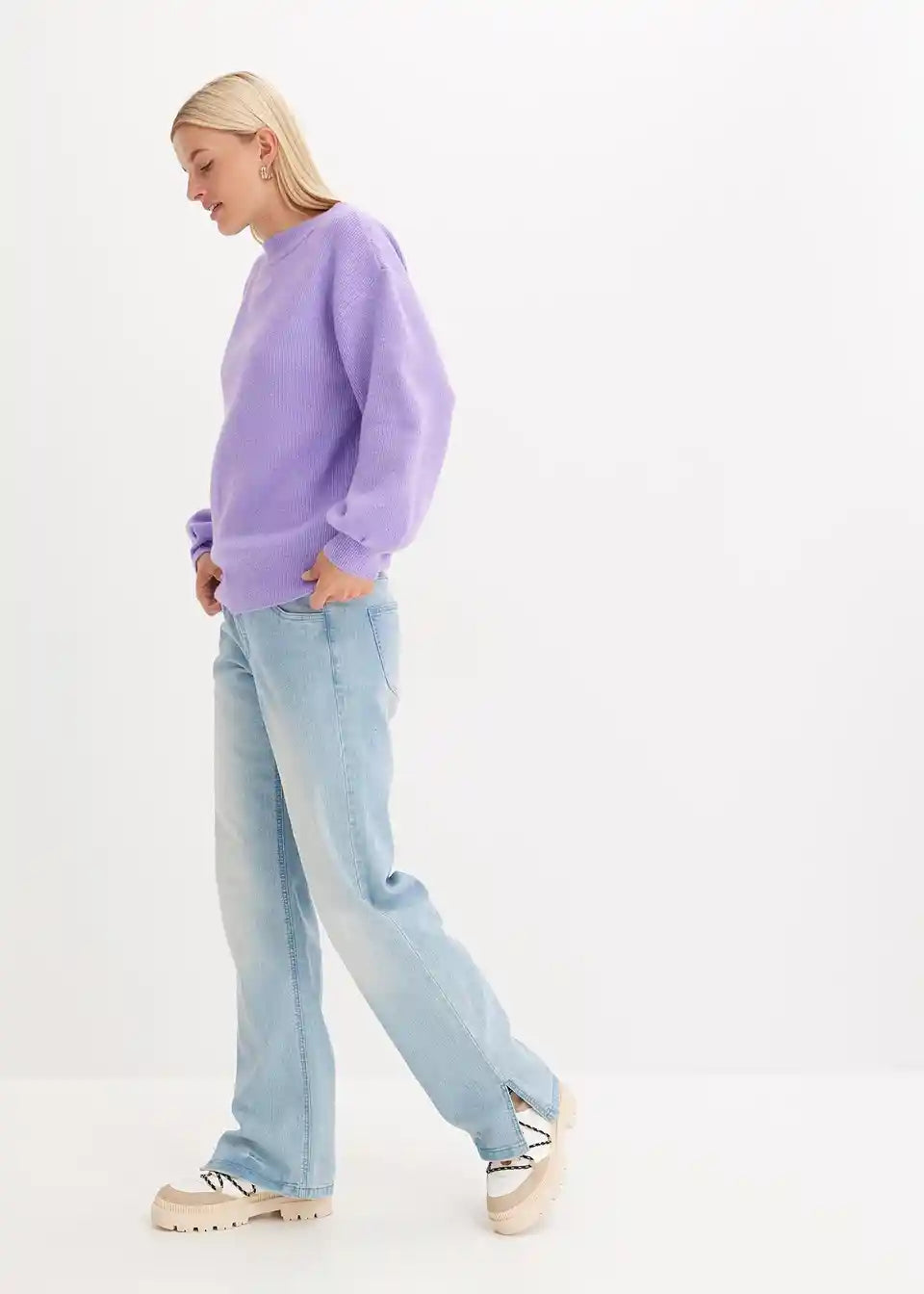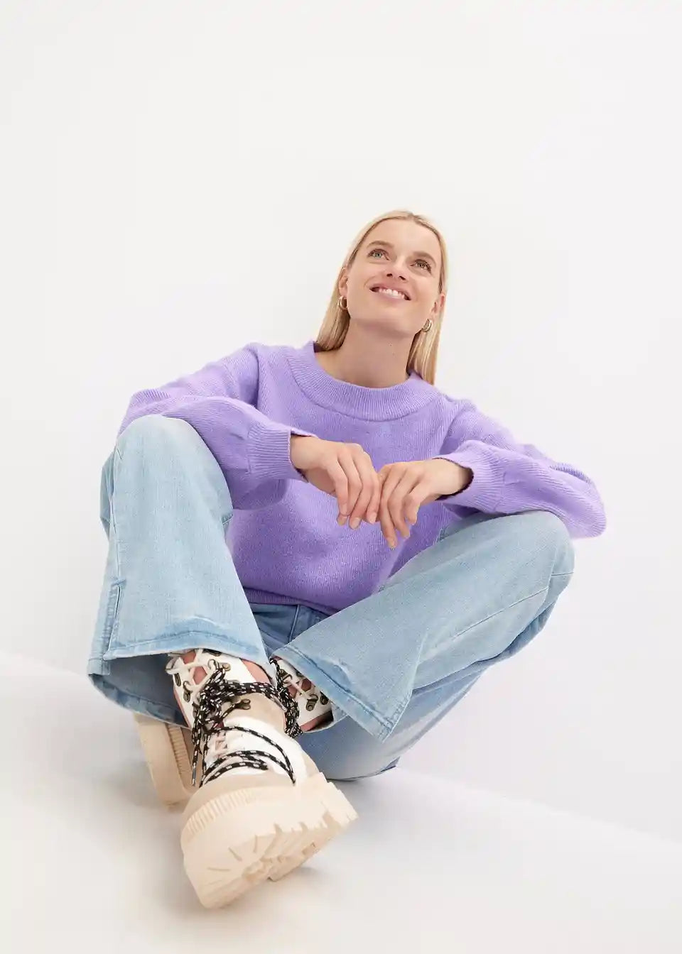 Atraktivan pletivi pulover s visokim okruglim izrezom i modernim balon rukavima