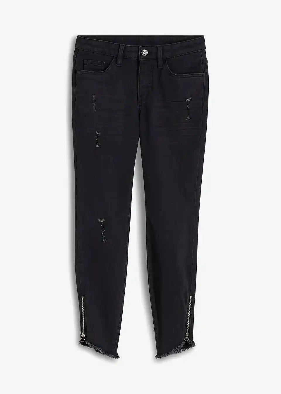 Moderne traperice od BODYFLIRT. Traperice s asimetričnim rubom ukrašene su dodatnim patentnim zatvaračem. Unutarnja duljina nogavice u vel. 38 cca 71,5 cm.