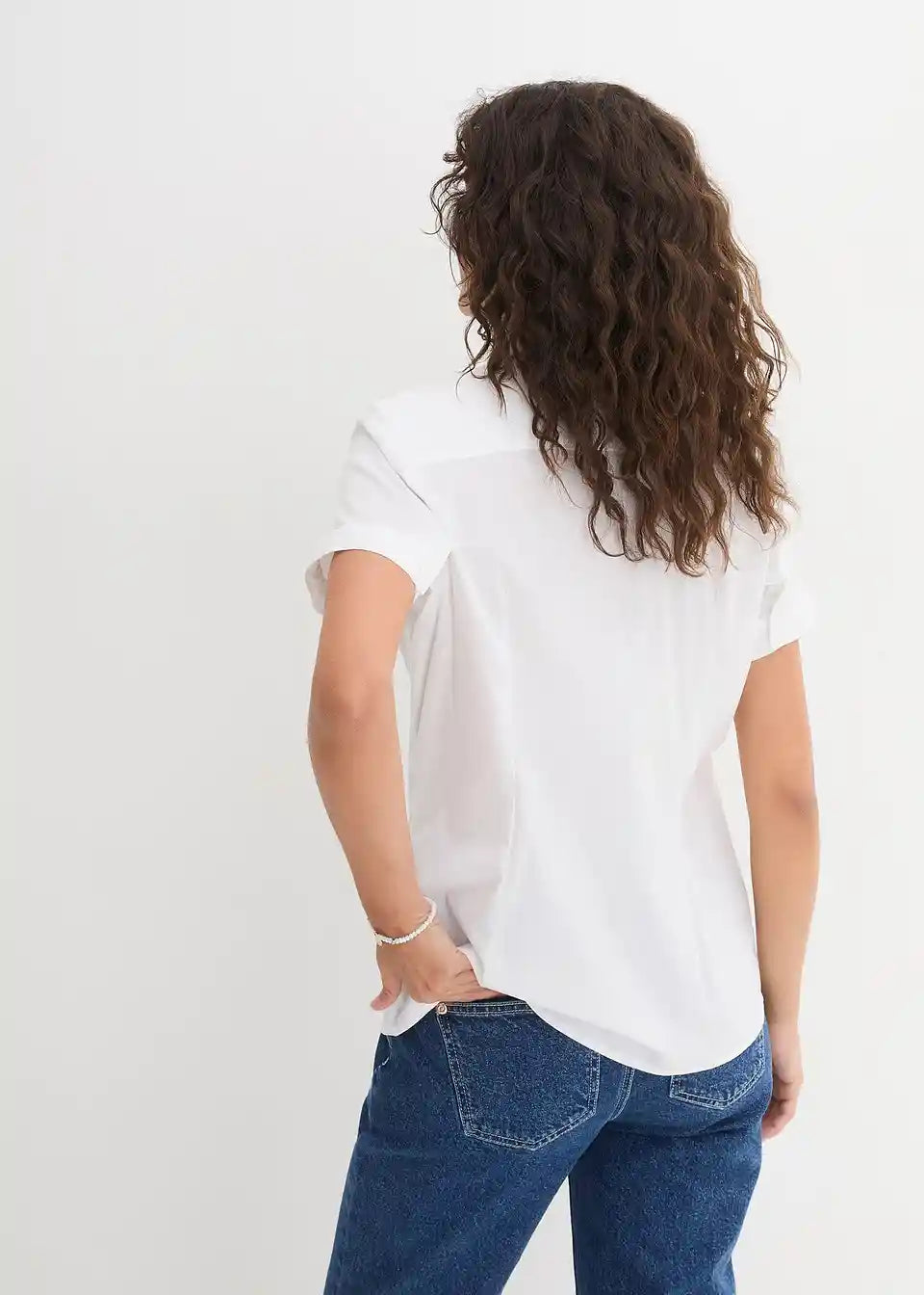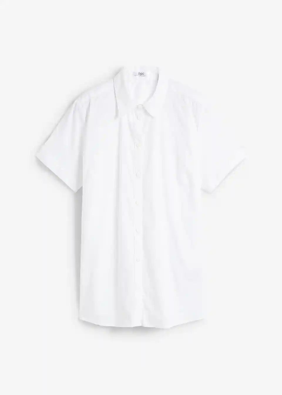 Ova kratkoročna stretch-bluza marke bpc raznovrstan je osnovni dio za mnoge prilike. Ima uski kroj i jednostavan Kent ovratnik. Prekrasan detalj je originalno rješenje za rukave: Rukavi se mogu podesiti straga s malim prorezom i dva gumba za širinu. Kratkorukavna bluza se može kombinirati na mnogo načina. Dobro pristaje uz kratke hlače, suknje olovka kroja, traperice ili chinos hlače.