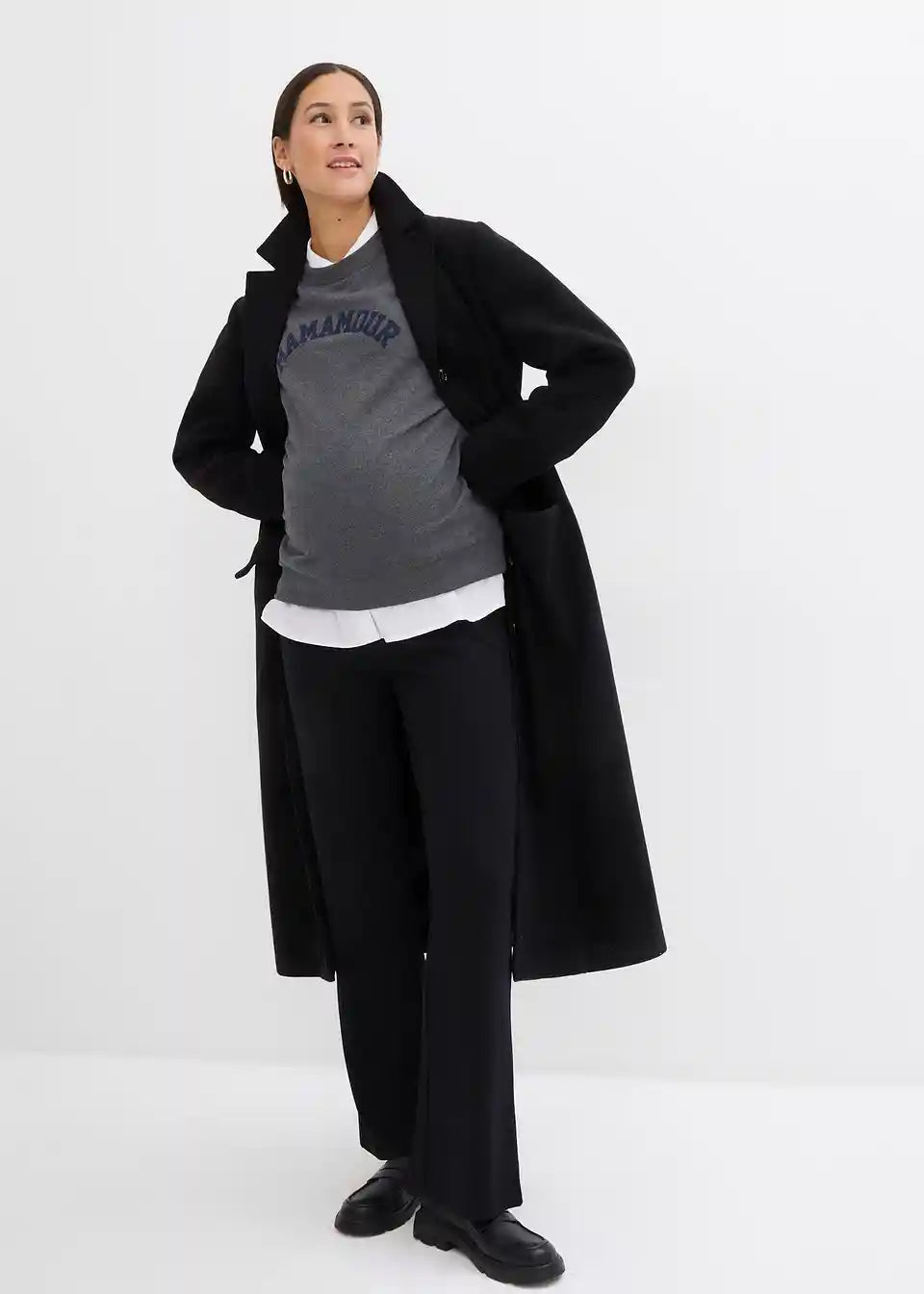 Udobne trudničke hlače s lagano trapezastim nogavicama u Slim Fit kroju kombiniraju moderan stil s visokim komforom nošenja. Uski kroj naglašava siluetu, dok lagano trapezaste nogavice osiguravaju laskavu, elegantnu formu. Elastični pojas od pamuka s elastanom prilagođava se rastućem trudničkom trbuhu i jamči udobno pristajanje. Ove hlače savršen su svakodnevni pratitelj za buduće majke koje tijekom trudnoće ne žele odustati od stila i slobode kretanja.