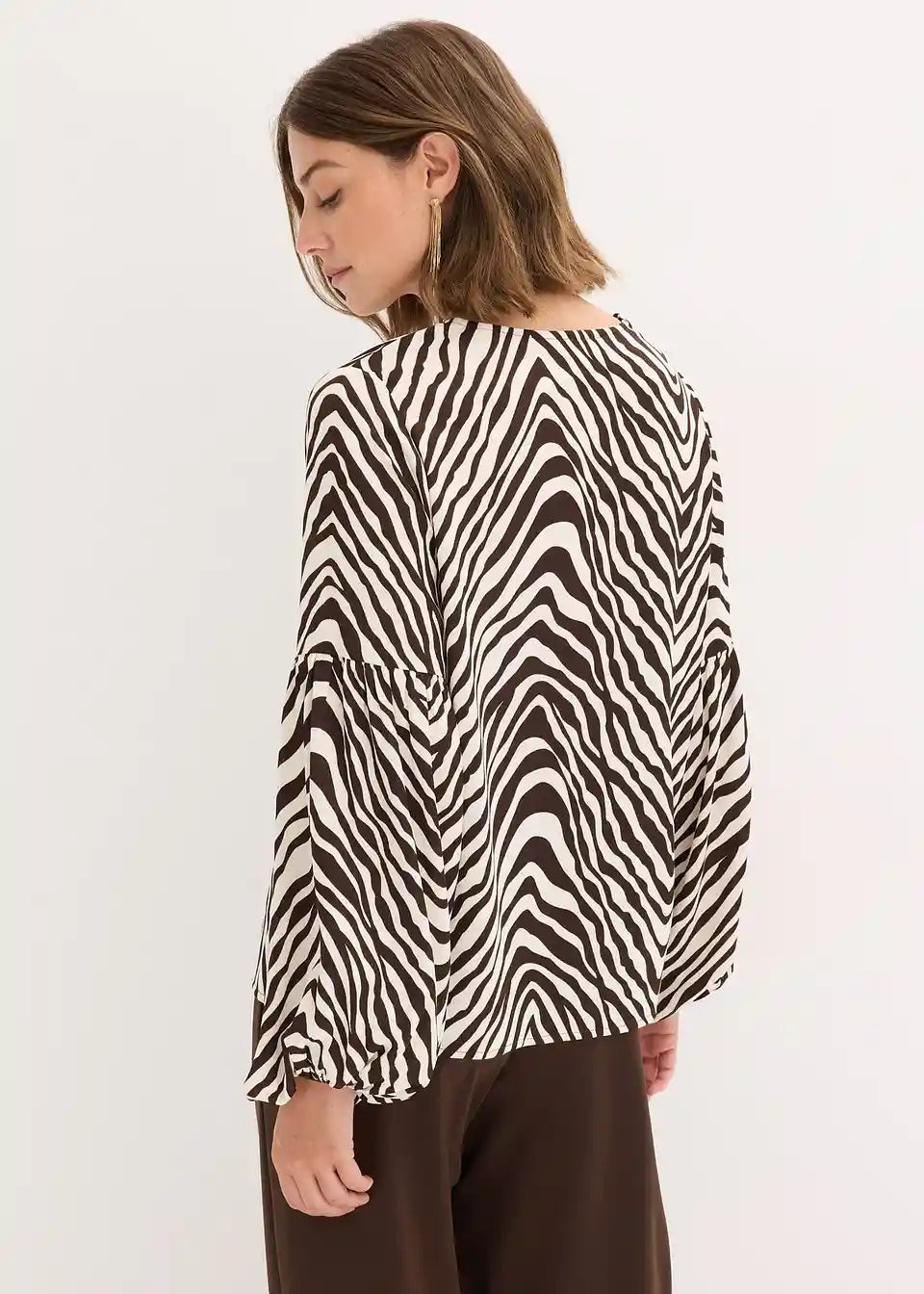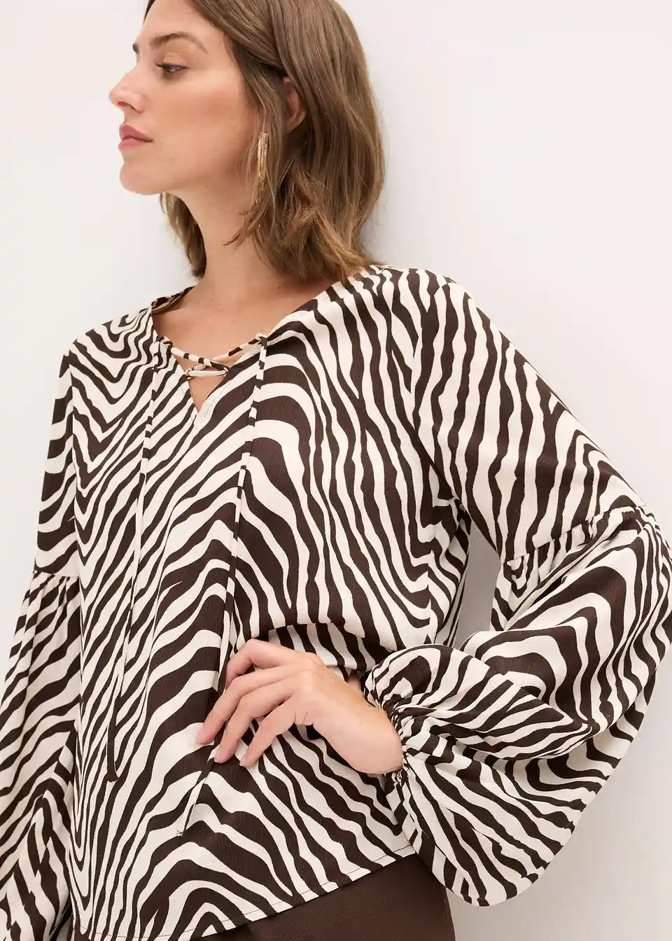 moderna, tiskana tunika bluza s voluminoznim rukavima i detaljem vezanja sprijeda na V-izrezu.