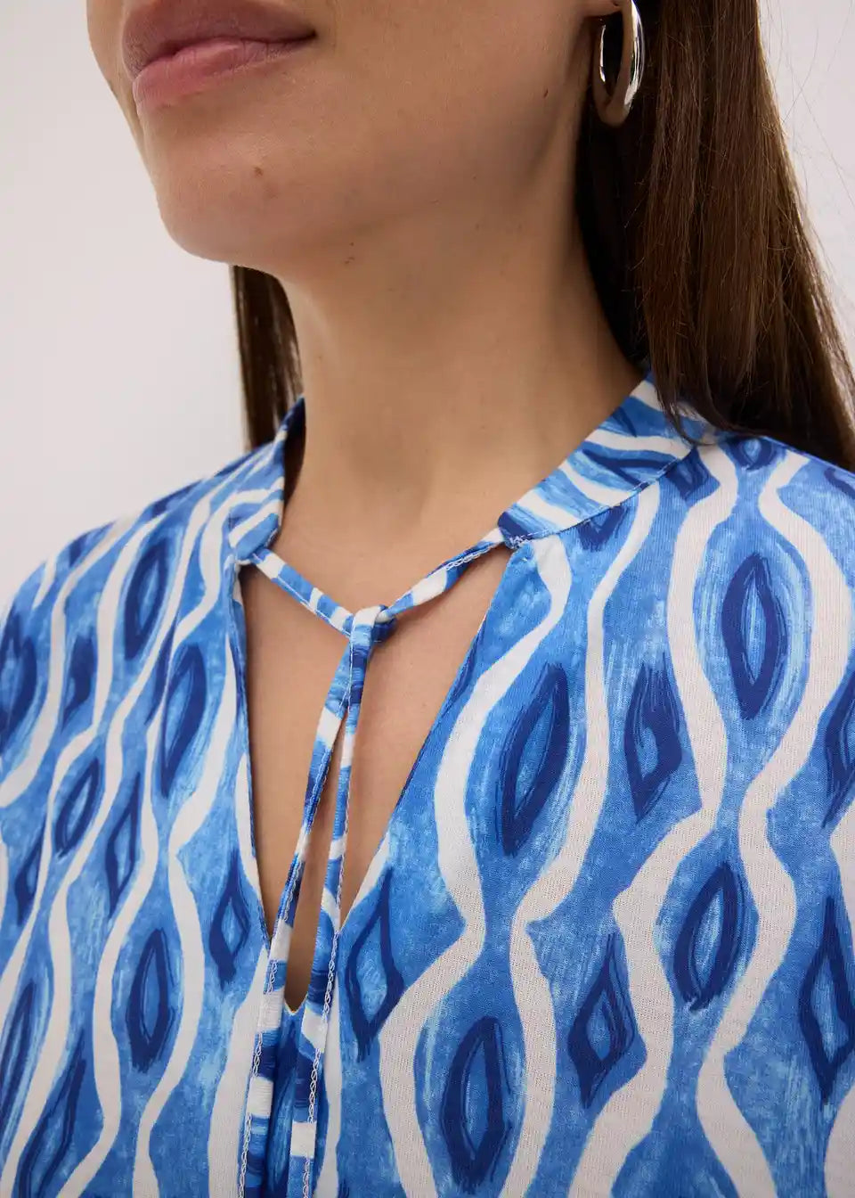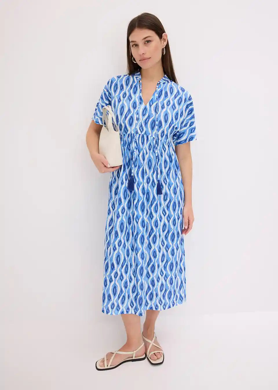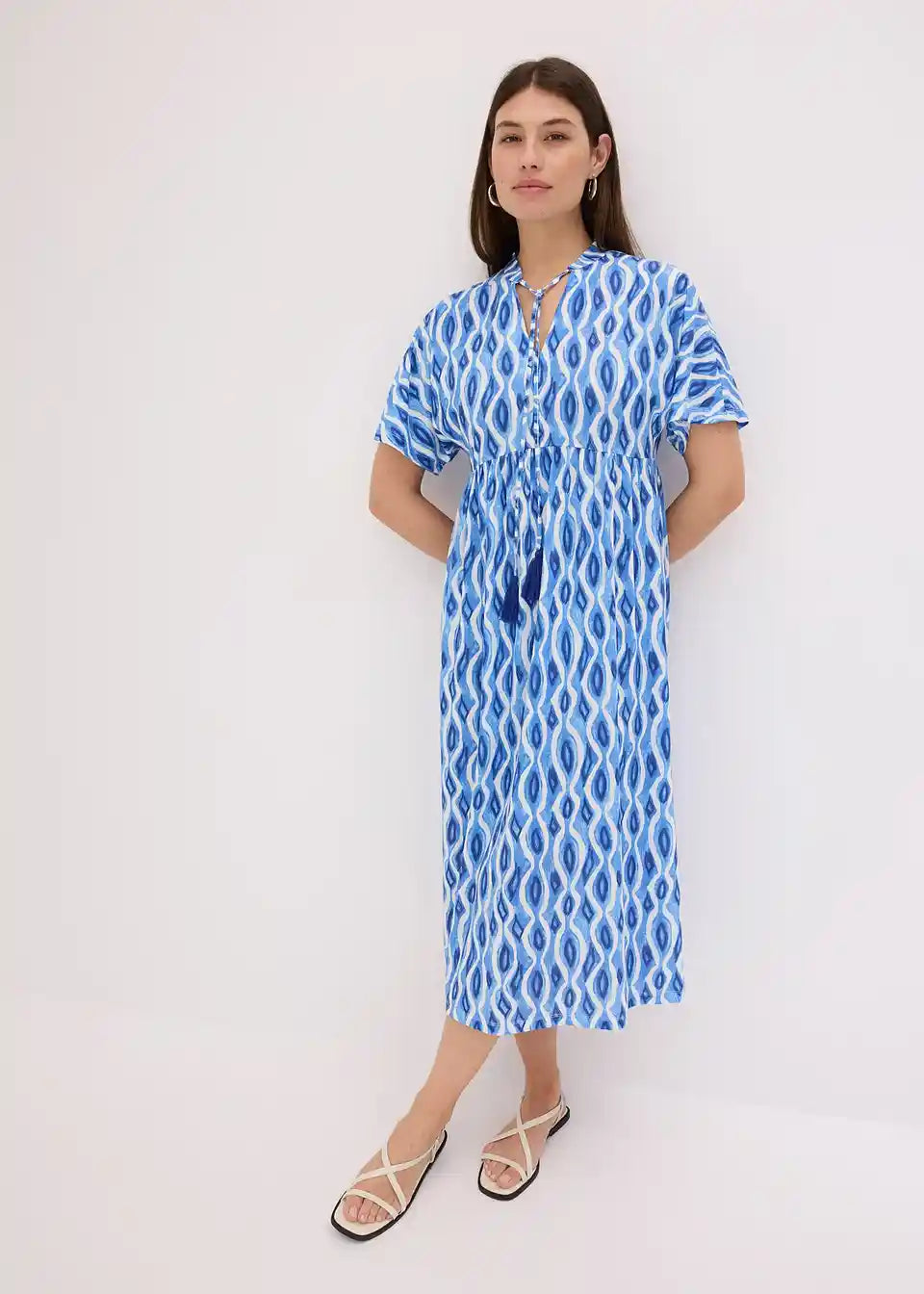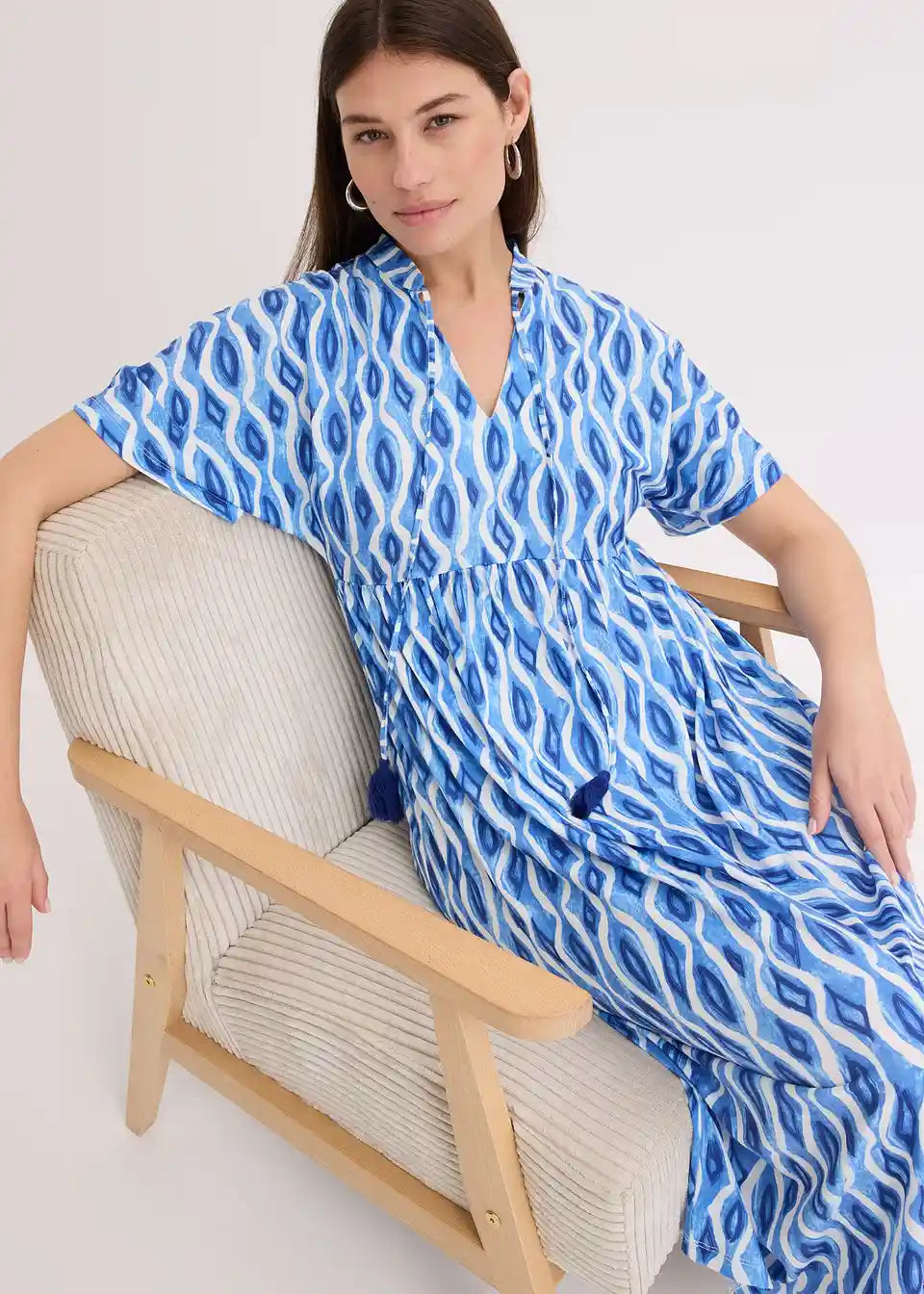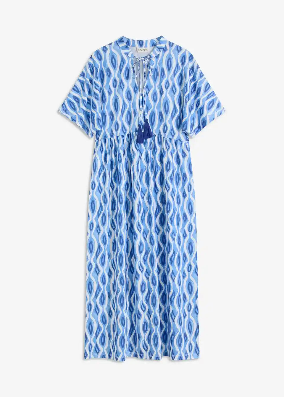 ljetna Tunika-haljina s printom u midi dužini s vezicama sprijeda na izrezu i šire krojenim rukavima.