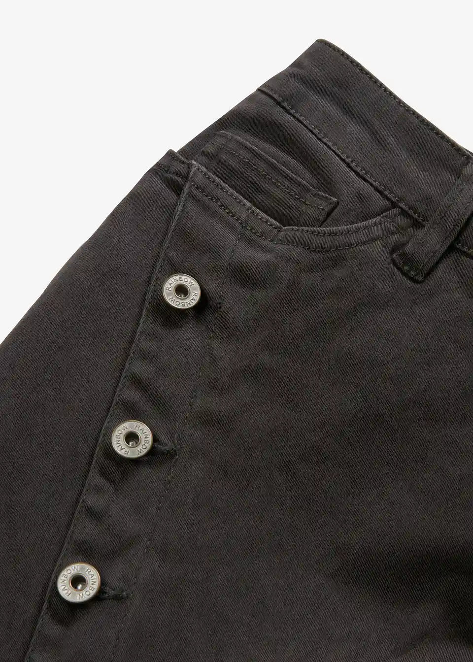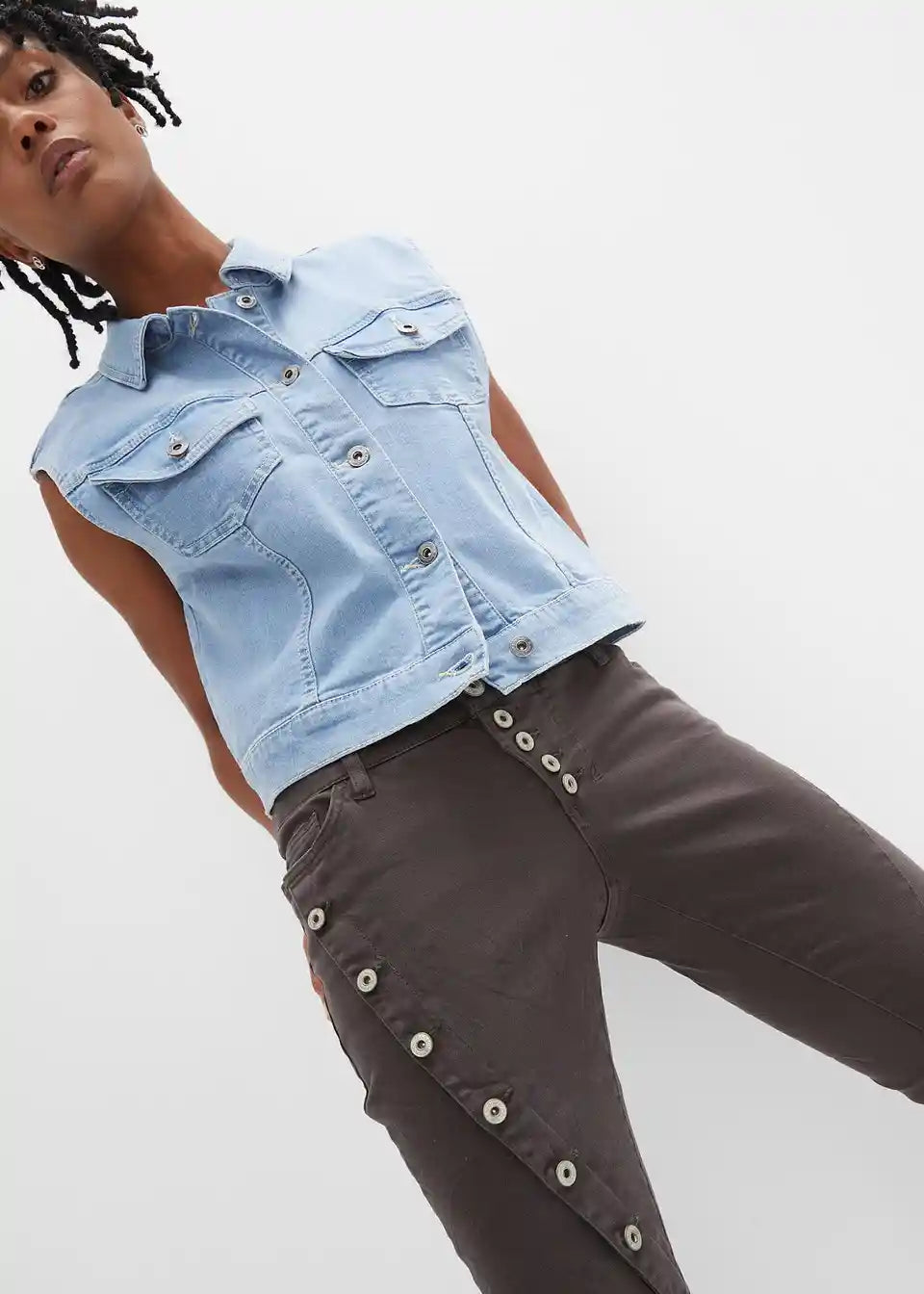 Elegantne hlače s kosim kopčanjem osiguravaju moderan izgled. Slim-fit traperice djeluju posebno moderno zahvaljujući uskom kroju. Bočni džepovi dodatno naglašavaju trendovski izgled modela u efektu mekanog pranja. Kosi šavovi sprijeda i ukrasni gumbi na bedru čine hlače s pojasnim petljama nevjerojatno privlačnim. Još jedan upečatljiv detalj je asimetrično kopčanje na gumbe.