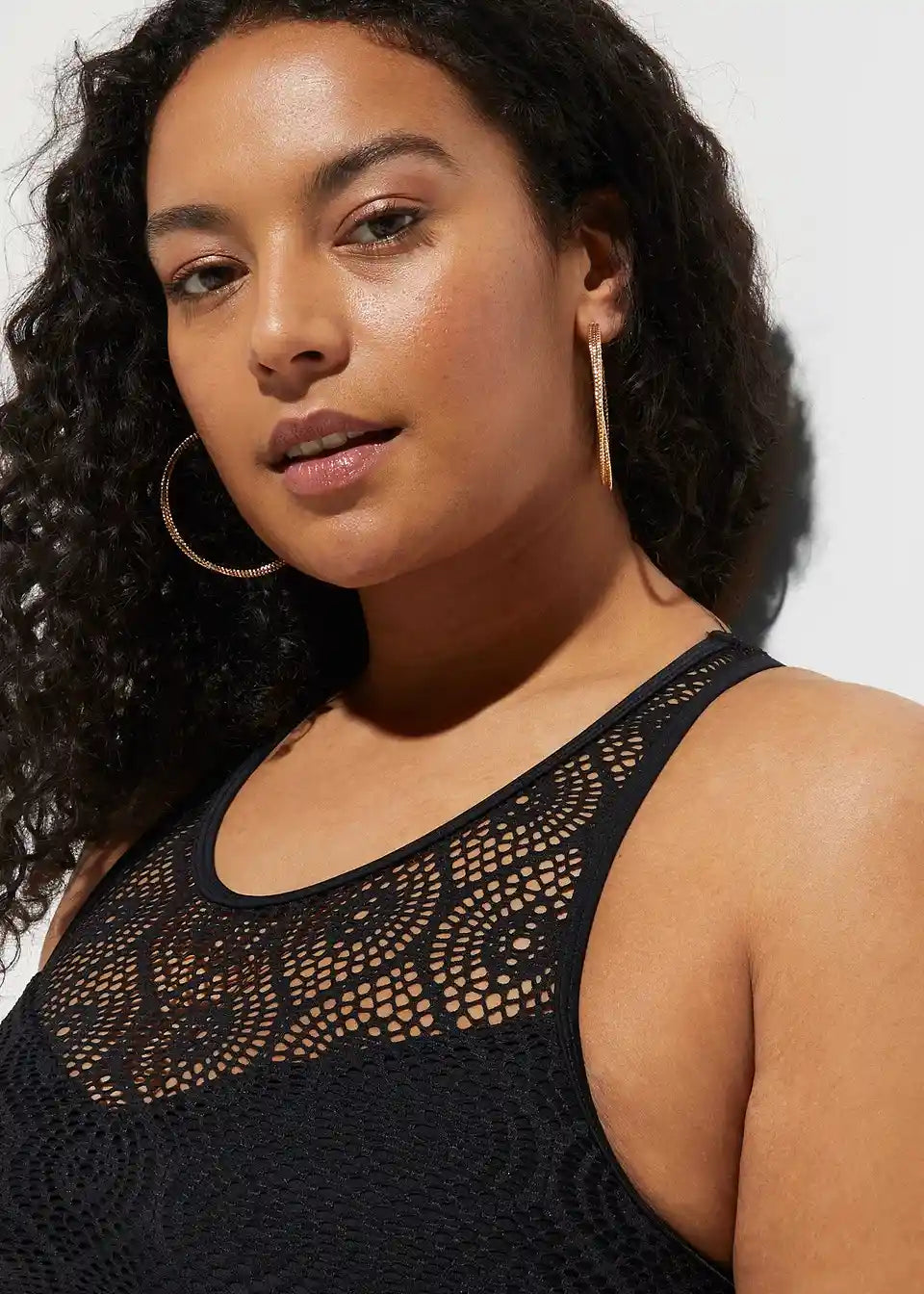 Ovaj Bustier bikini gornji dio savršen je za moderan izgled na plaži. Bikini gornji dio izrađen je s elastičnom trakom ispod grudi. Ističe se modernim mrežastim materijalom i na stražnjoj strani ima atraktivnu leđa u sportskom stilu. Bez obzira na to kombinira li se s bikini gaćicama, boksericama ili kupaćim hlačicama - ovaj bikini gornji dio u obliku bandeaua lako se slaže s raznim donjima bikini hlačica.