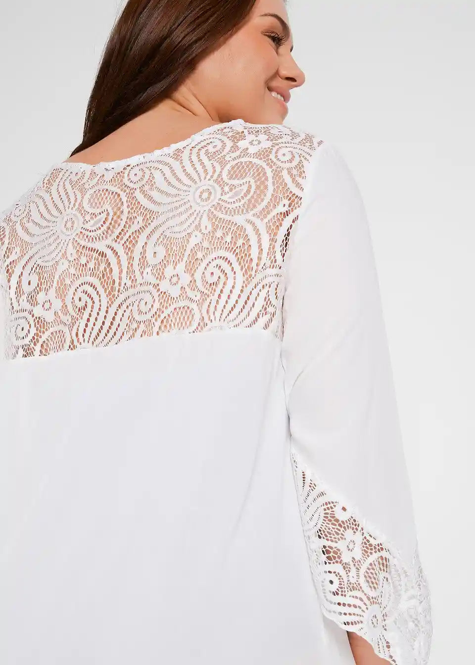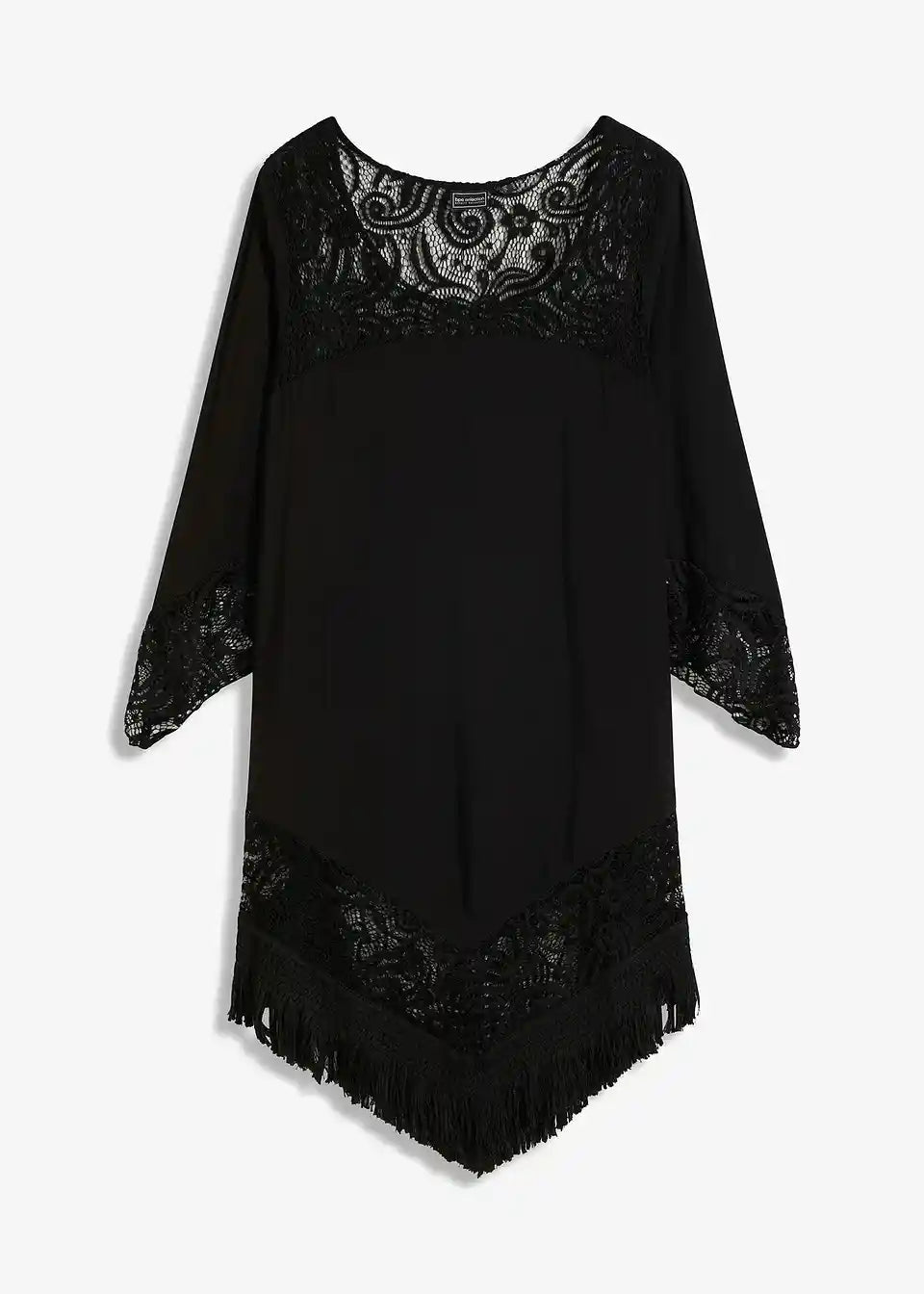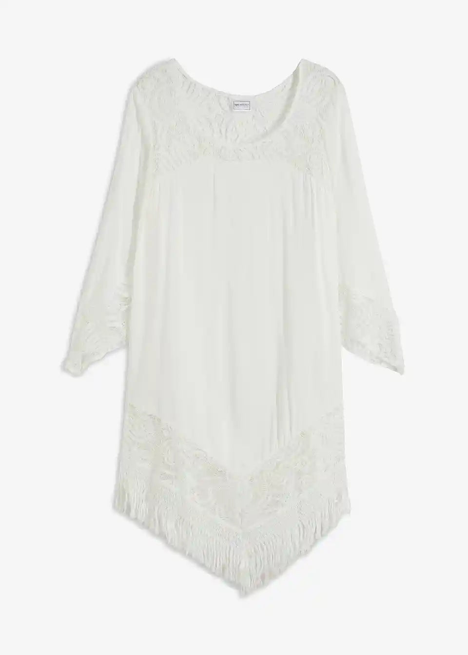 Lagano prozirna plažna tunika marke bpc selection očarava finom čipkom i atraktivnim dizajnom. Kukičani čipkani umetci na izrezu, rubu i rukavima daju tuniki elegantan šik i omogućuju da osunčana koža zasja. Koso krojen rub s ukrasnim resicama dodatno naglašava ženstveni izgled. Na plaži se tunika savršeno kombinira s elegantnim kupaćim kostimima.