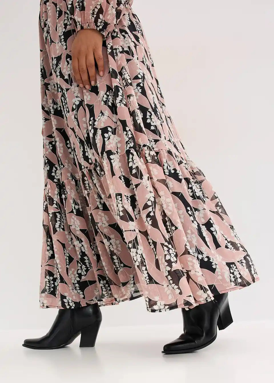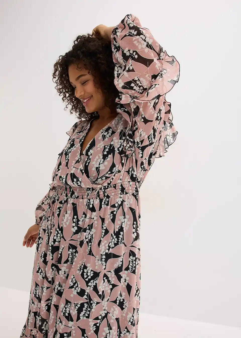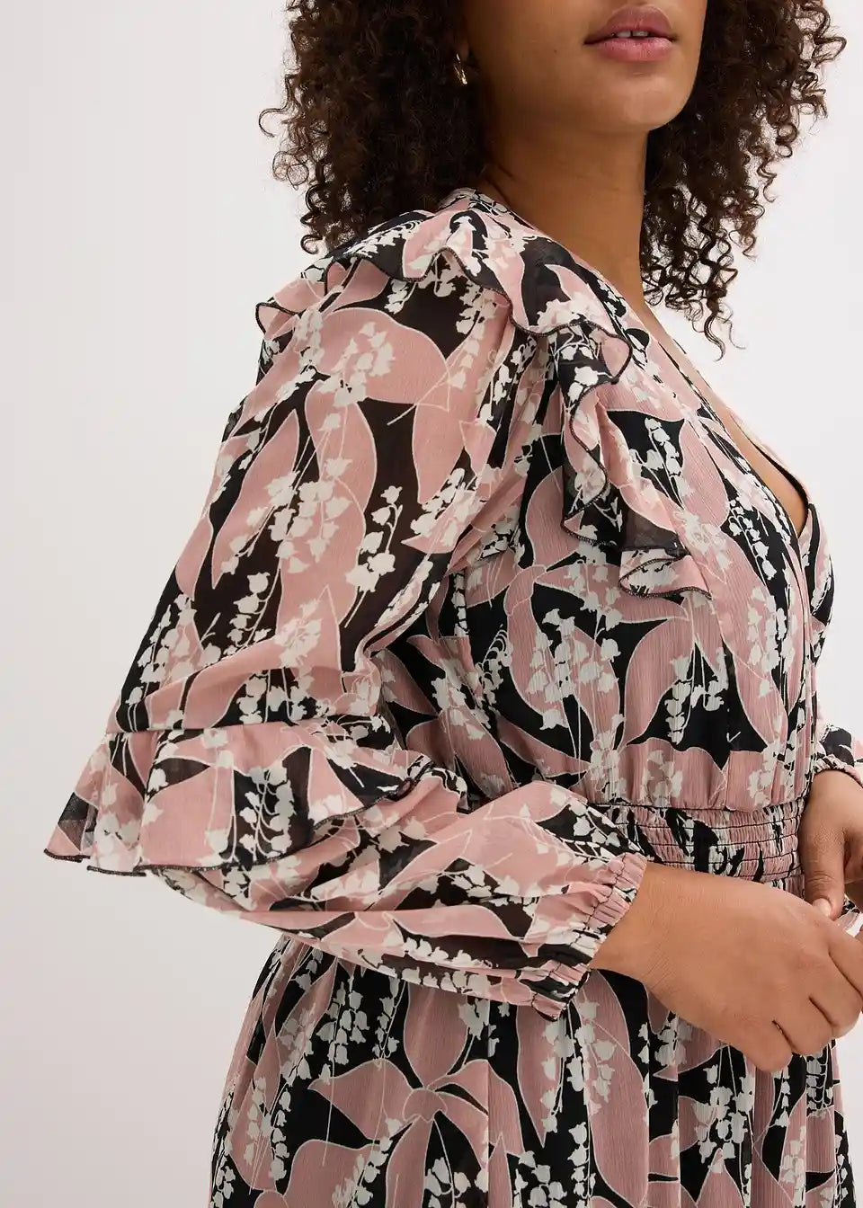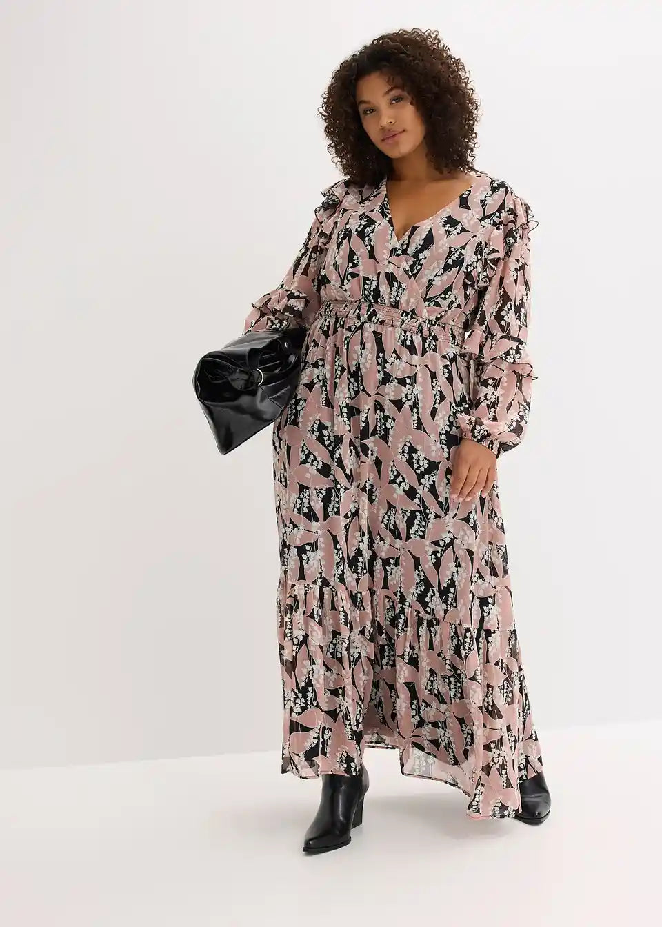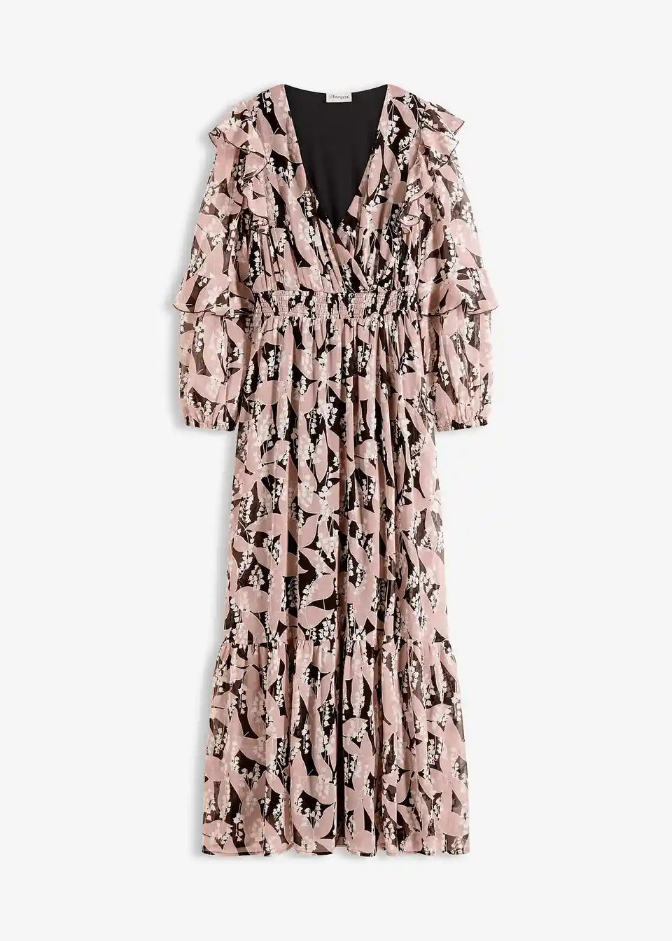 Chiffon haljina maksi dužine s modernim volanima sprijeda na gornjem dijelu i na šire krojenim rukavima