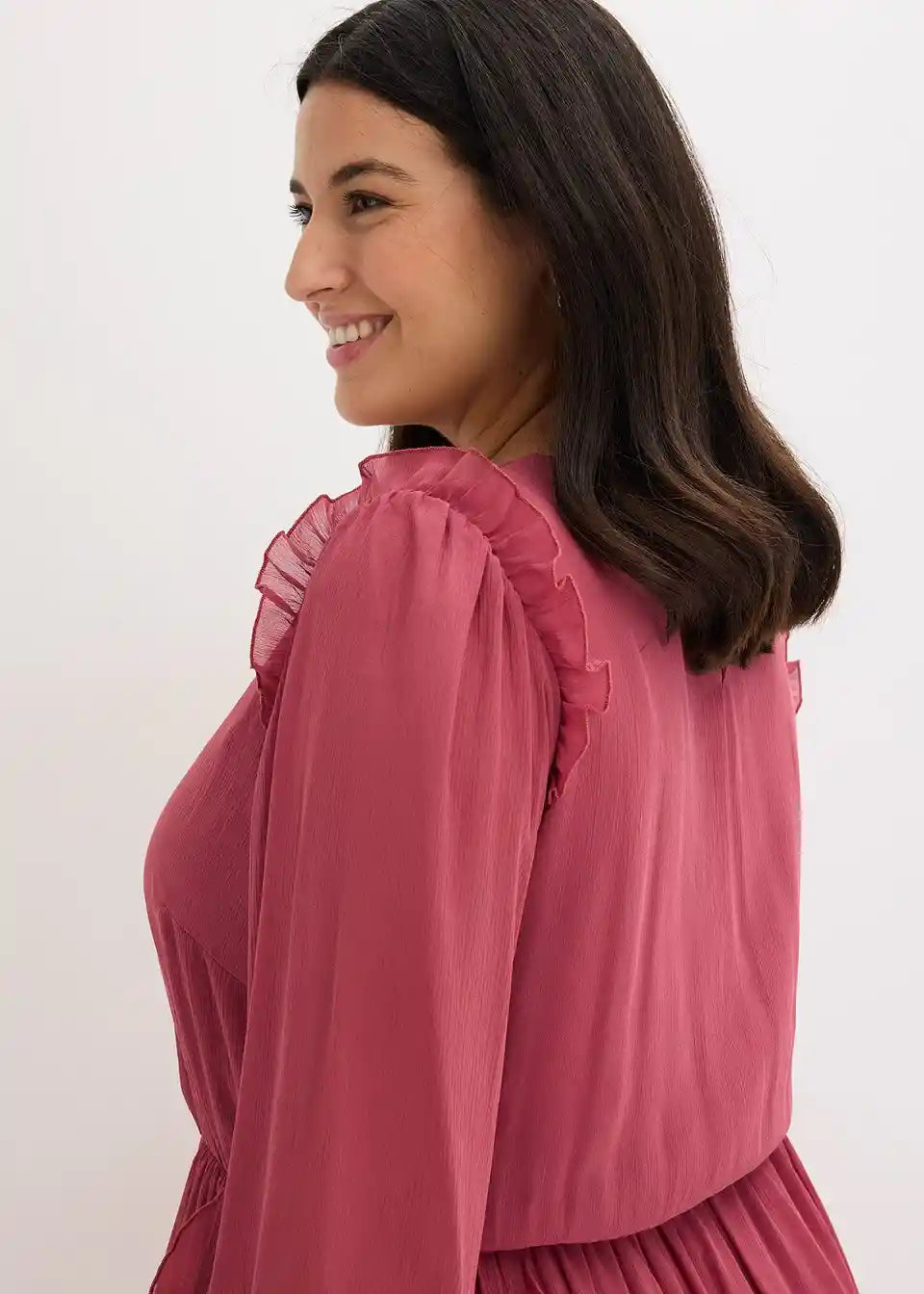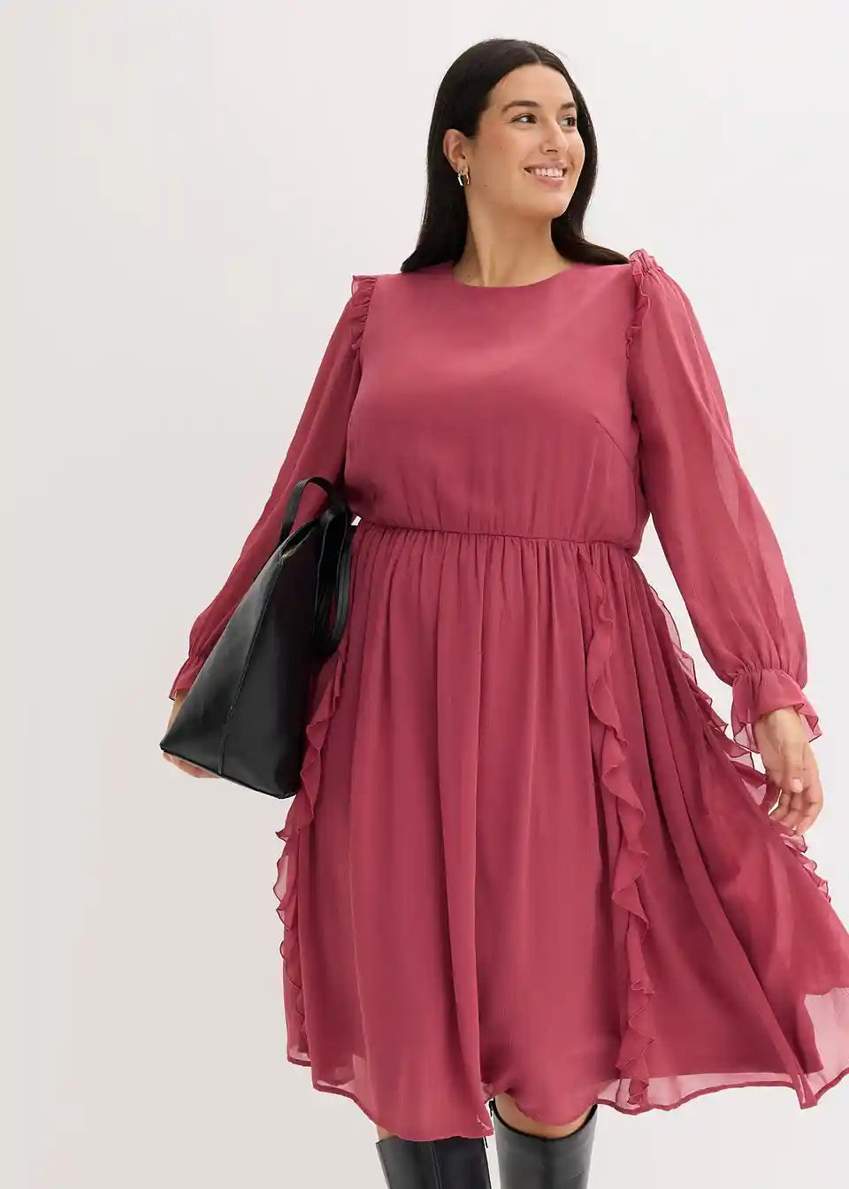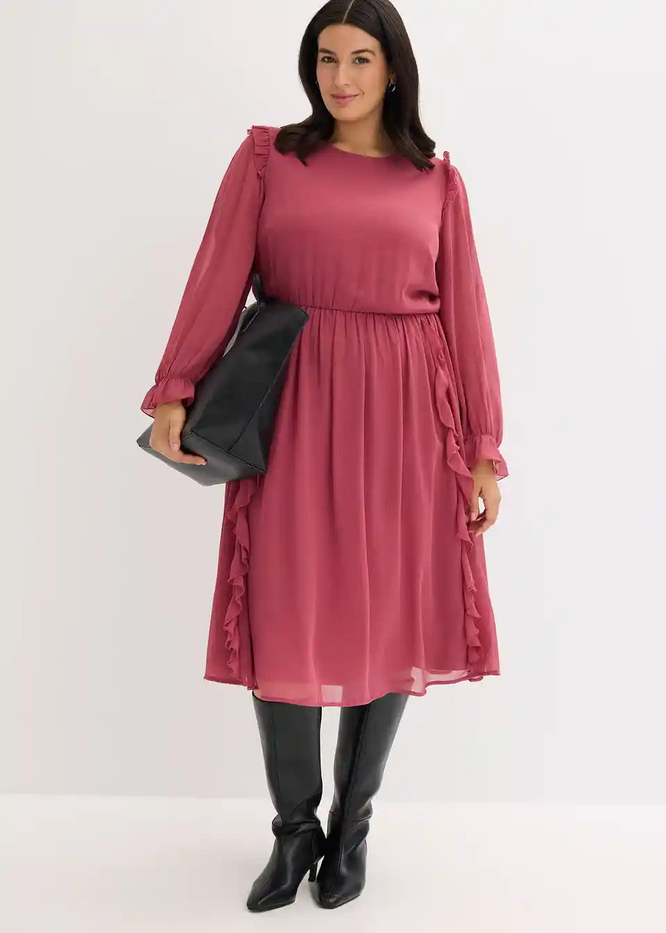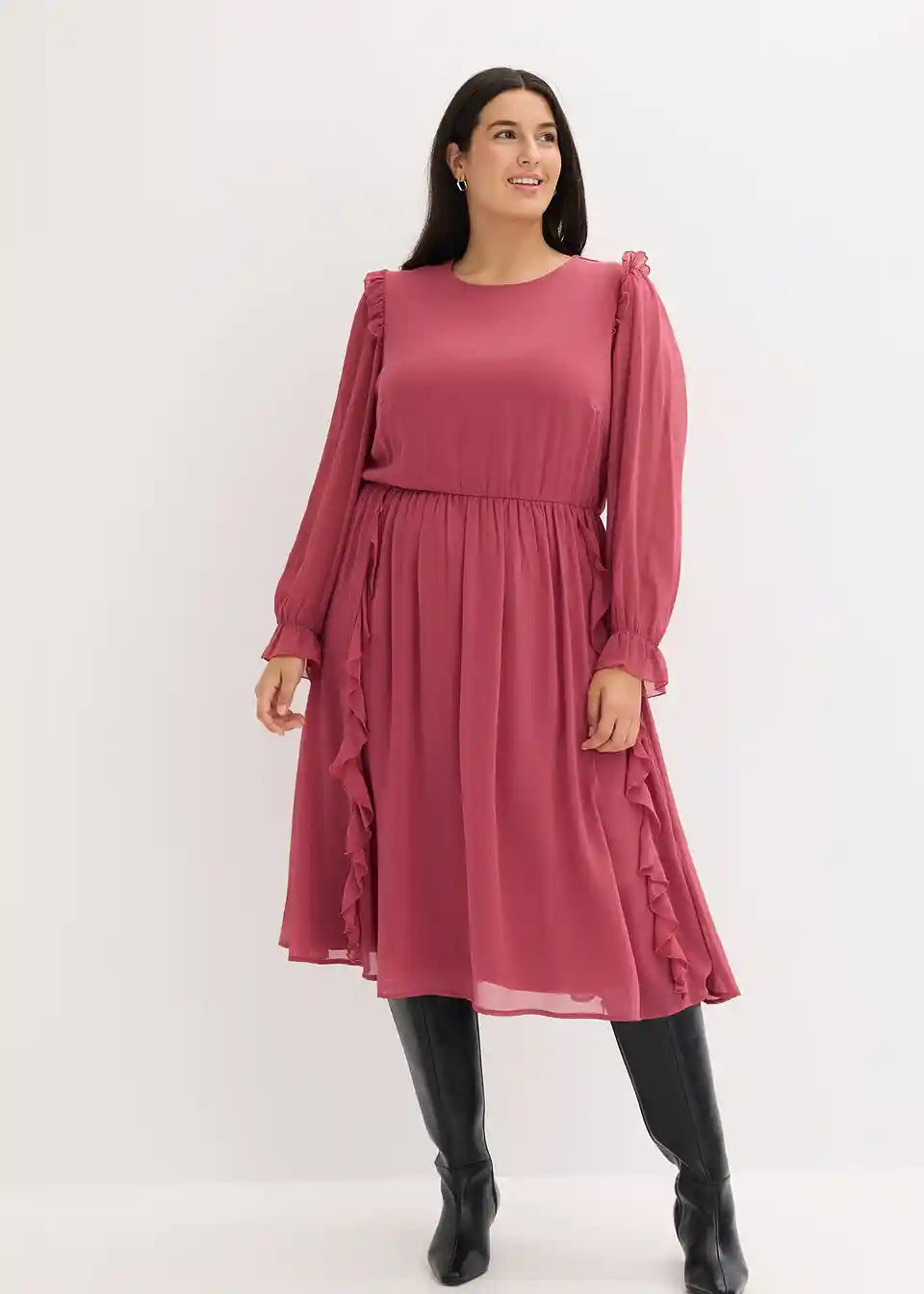 ženska šifonska haljina midi duljine s modernim volanima na ramenima, na rubovima rukava i na donjem dijelu suknje