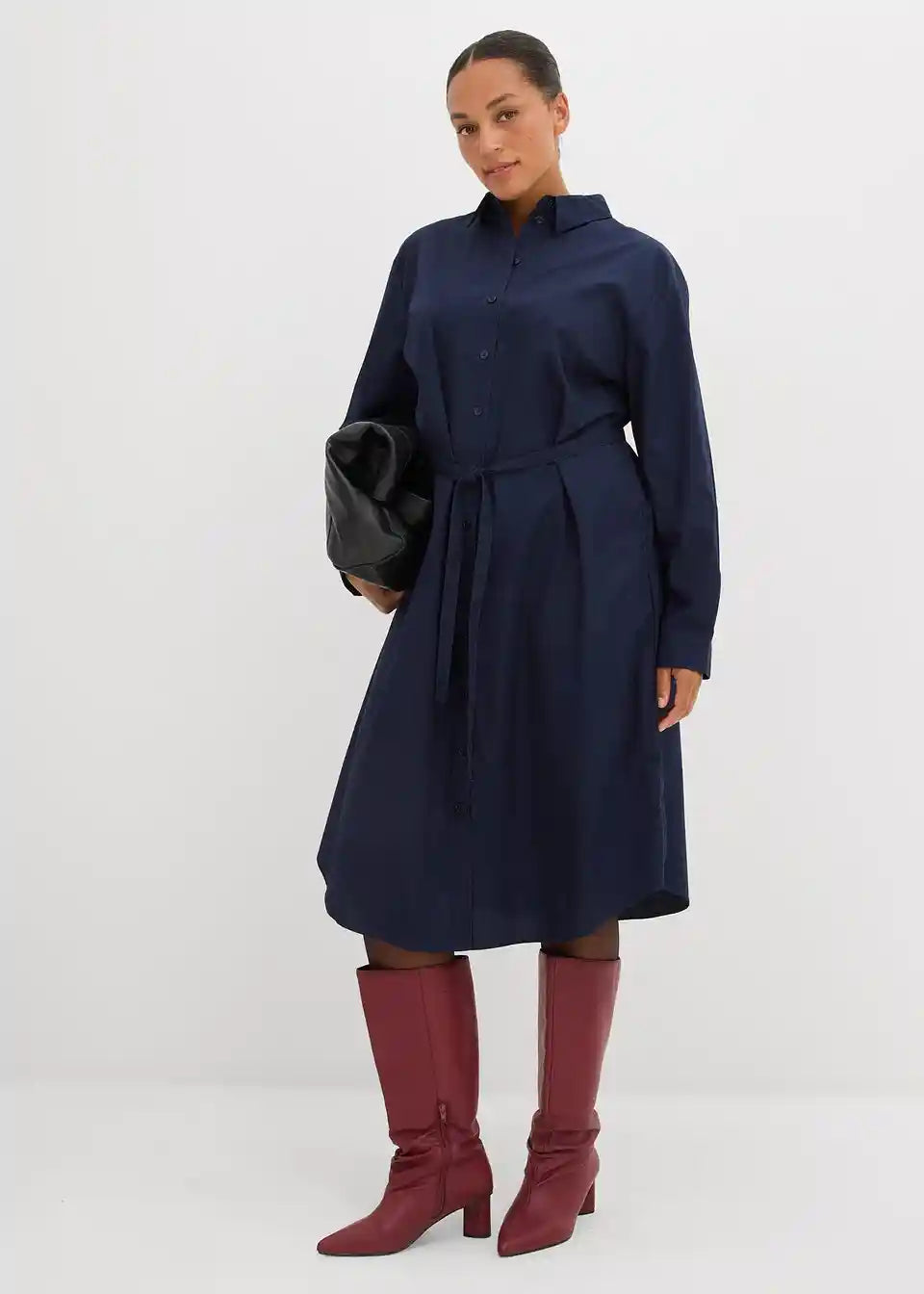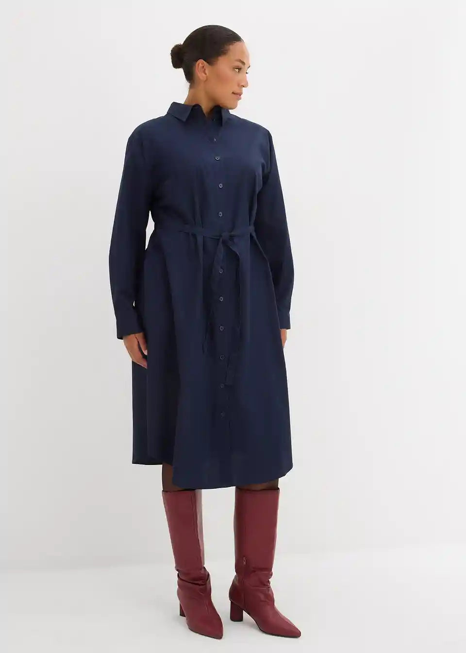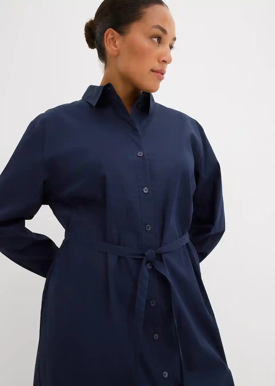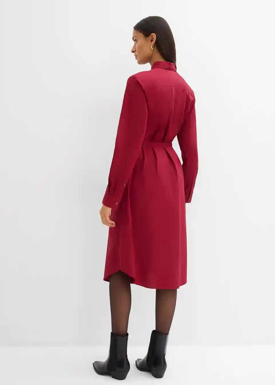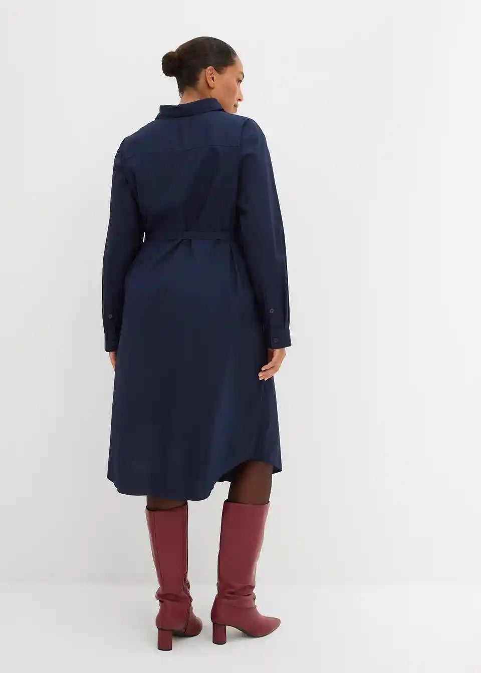 Košulja-haljina midi duljine sa šiljastim ovratnikom, manžetama s gumbima i zaobljenim rubom. Prednje kopčanje na gumbe.