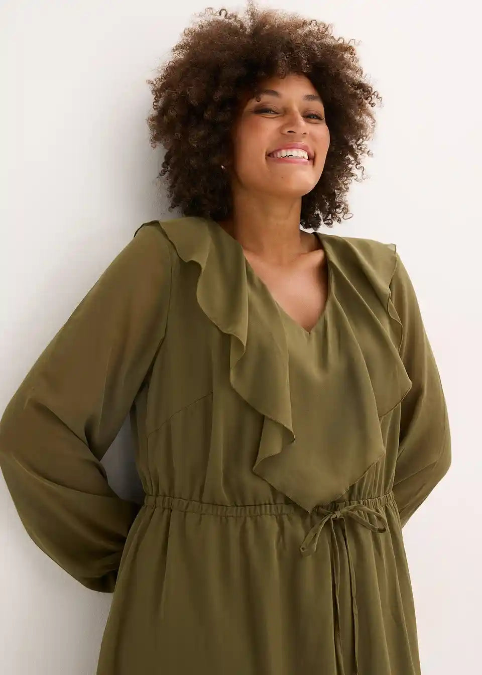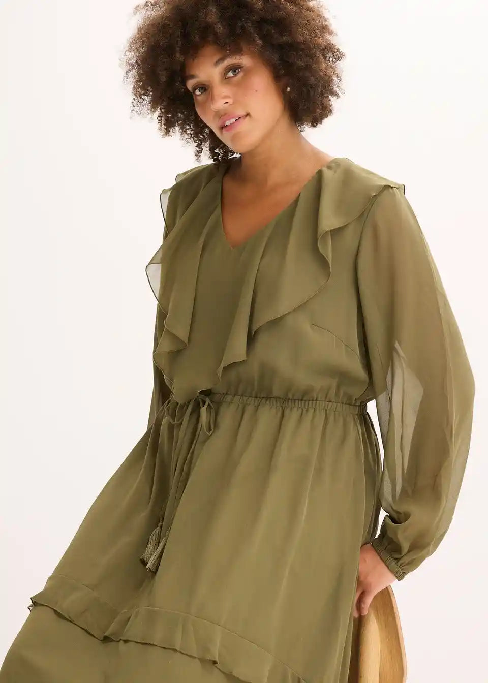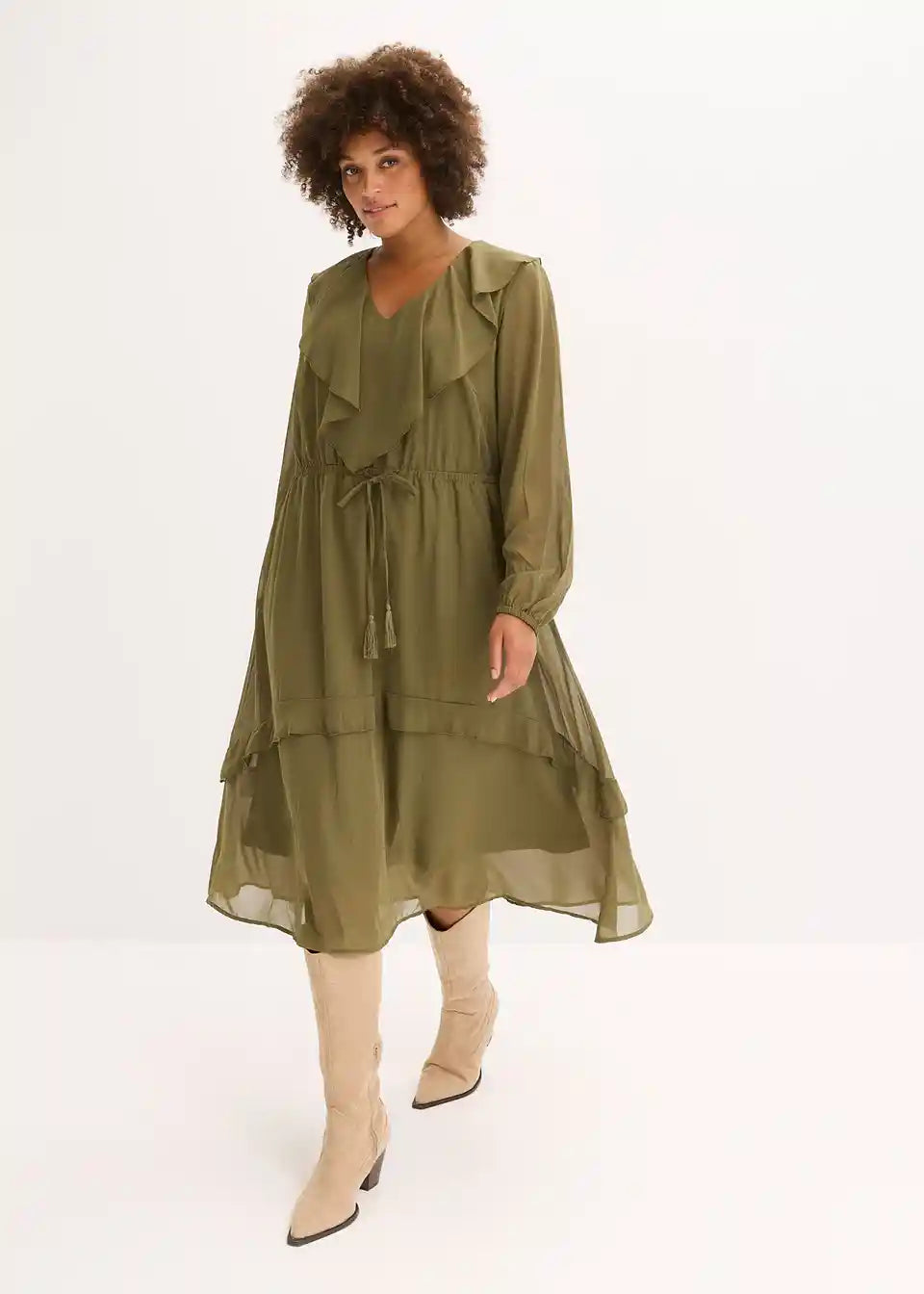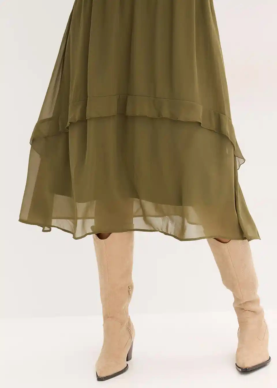 Srednje duga haljina s volanima na izrezu i rubu