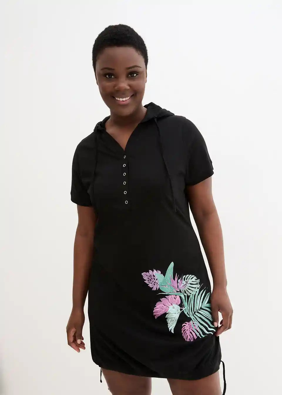 Shirt haljina s redom gumba i funkcijom vezanja, cvjetni print, bočni ušiveni džepovi i kapuljača s vezicom