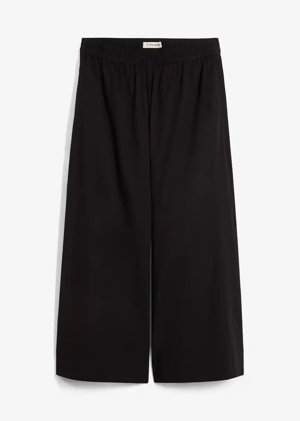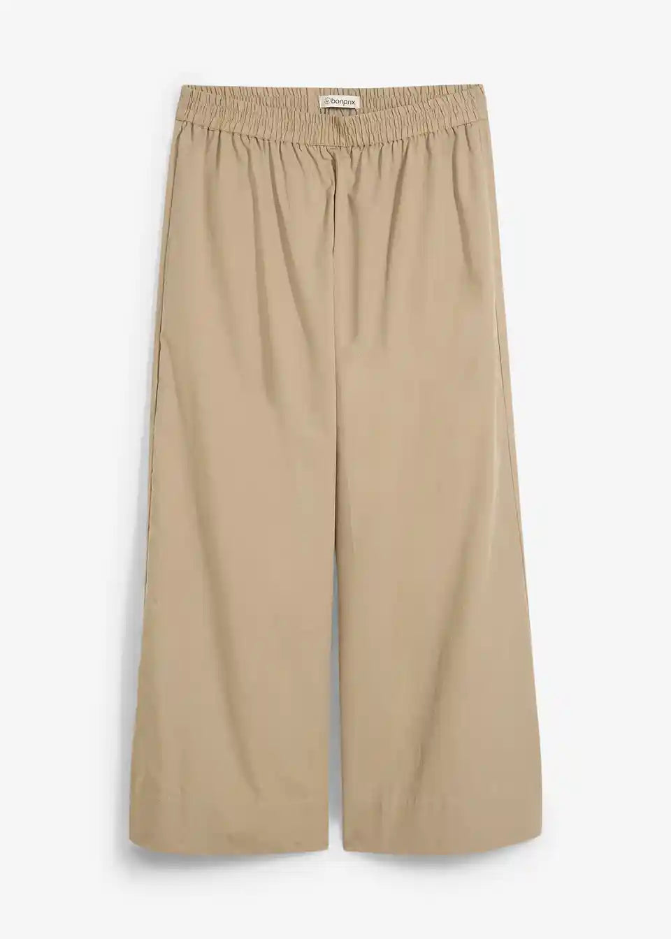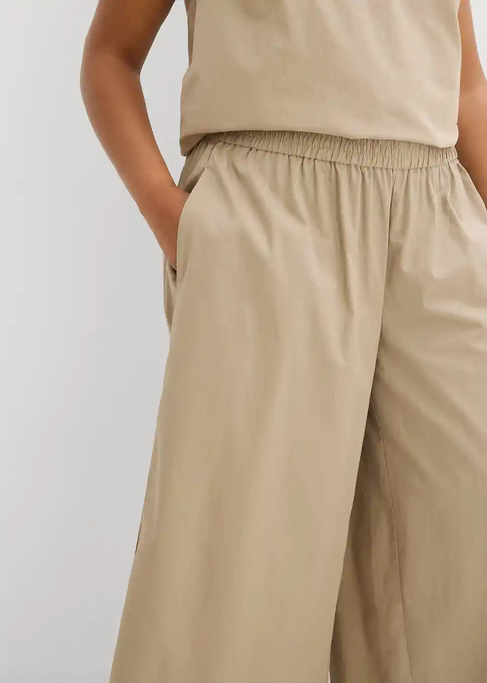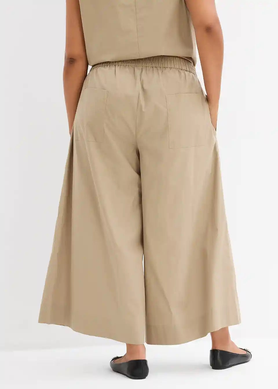 Culotte hlače s posebno širokim nogavicama, udobnom elastičnom pasicom, prednjim džepovima u bočnom šavu i našivenim stražnjim džepovima