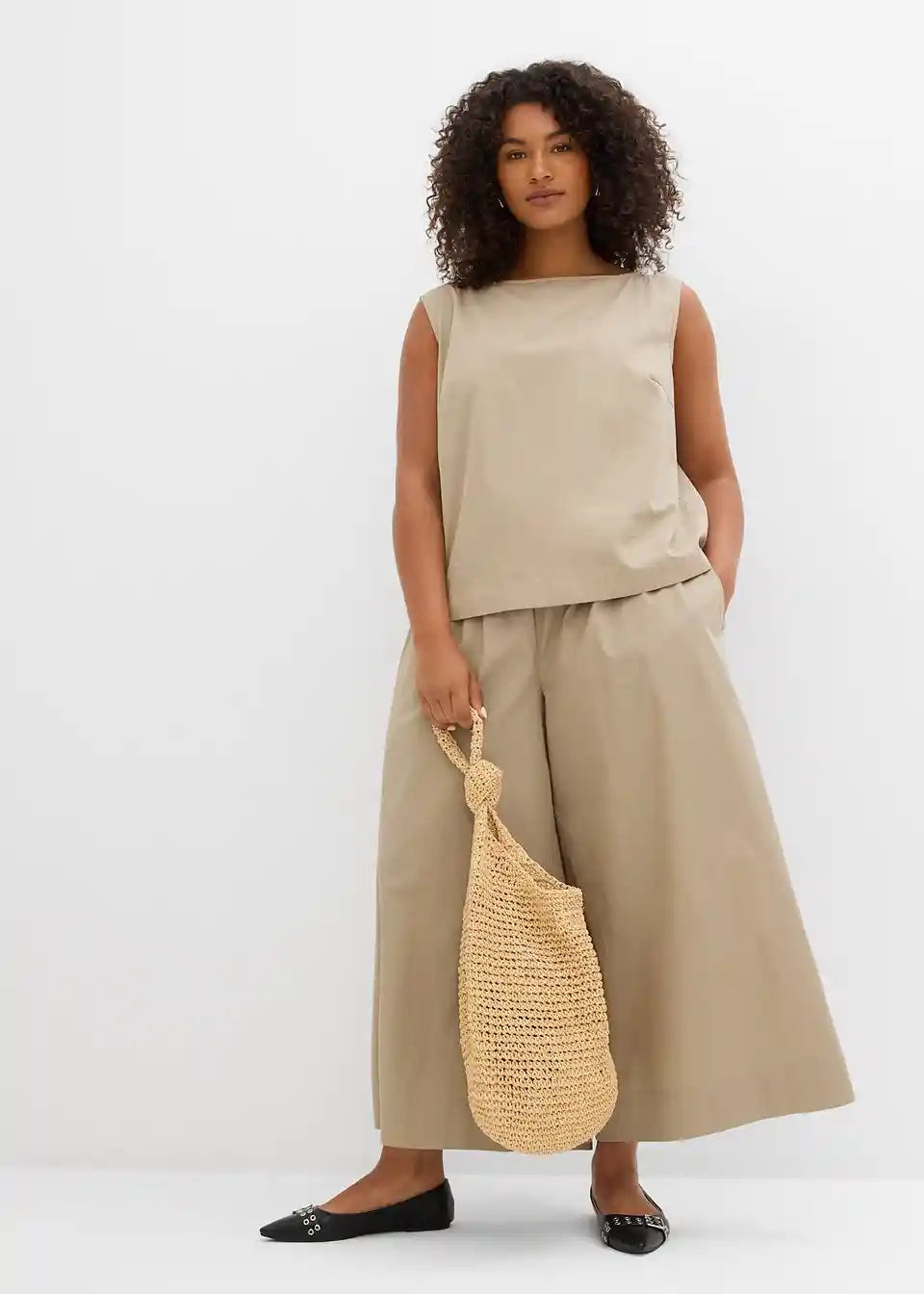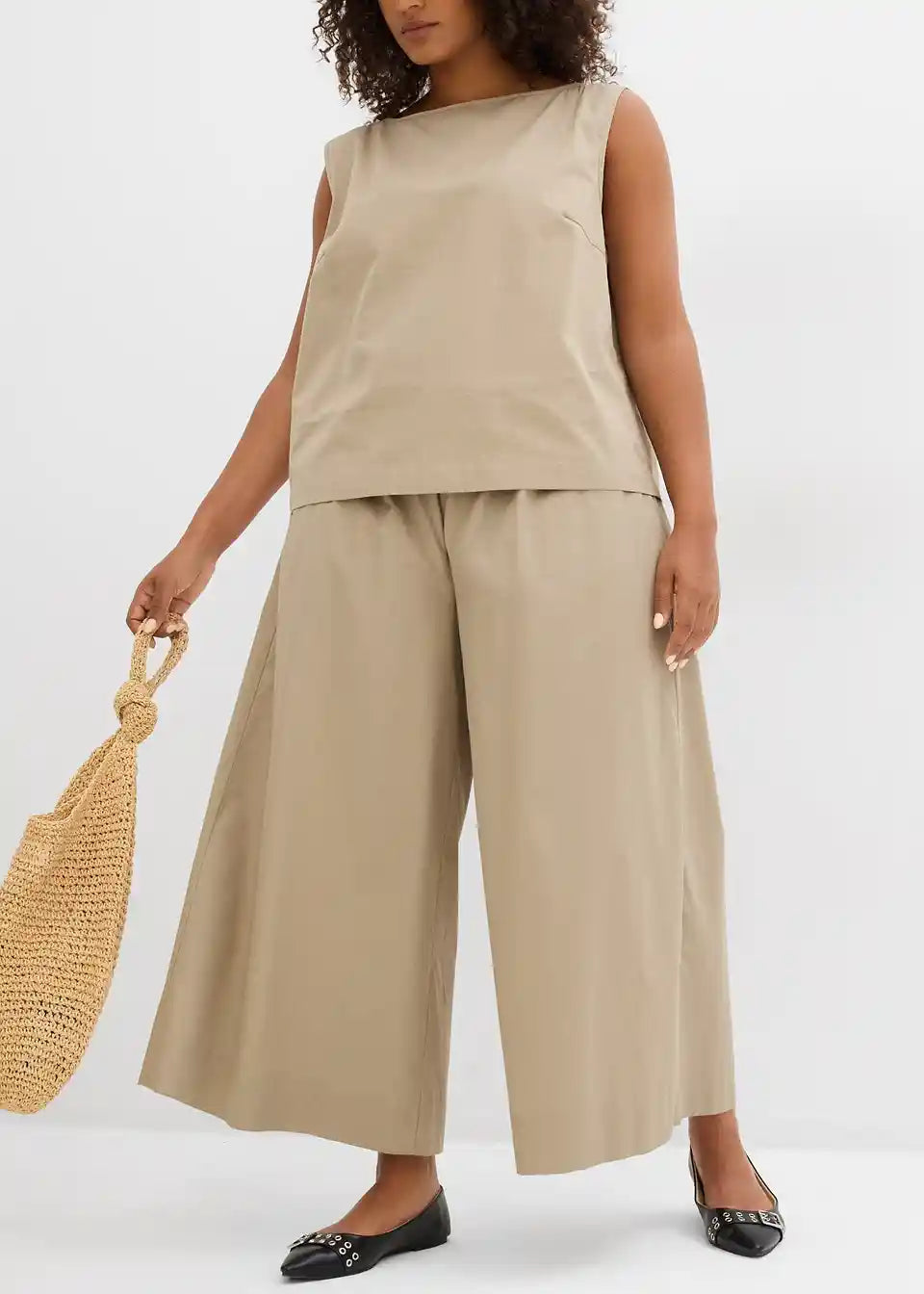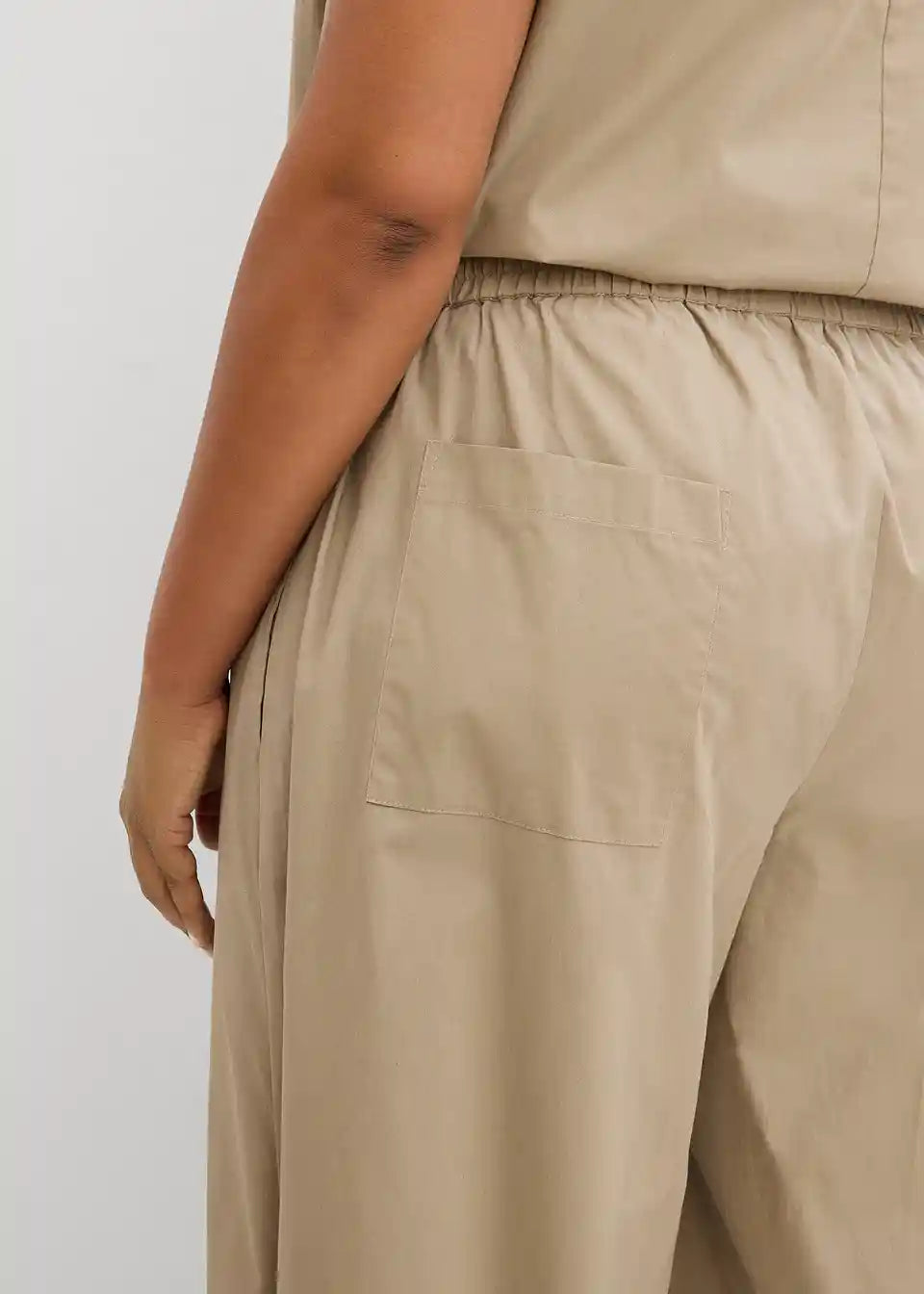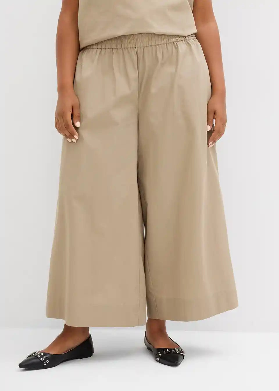 Culotte hlače s posebno širokim nogavicama, udobnom elastičnom pasicom, prednjim džepovima u bočnom šavu i našivenim stražnjim džepovima