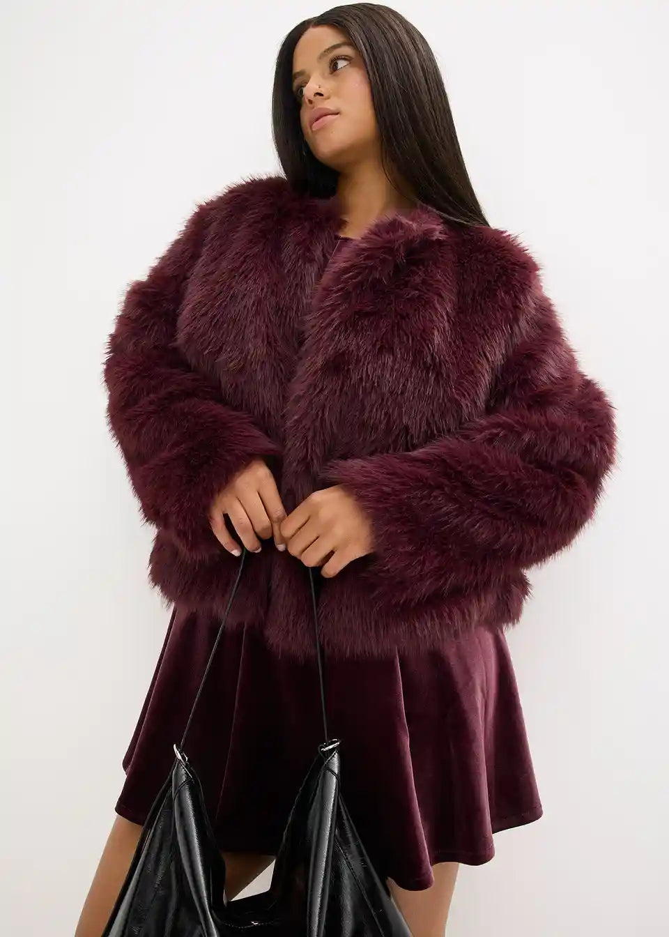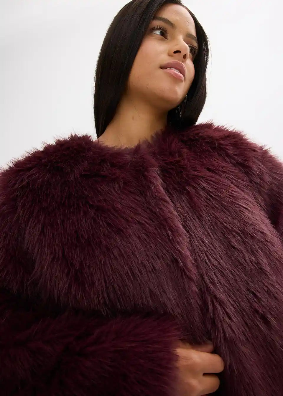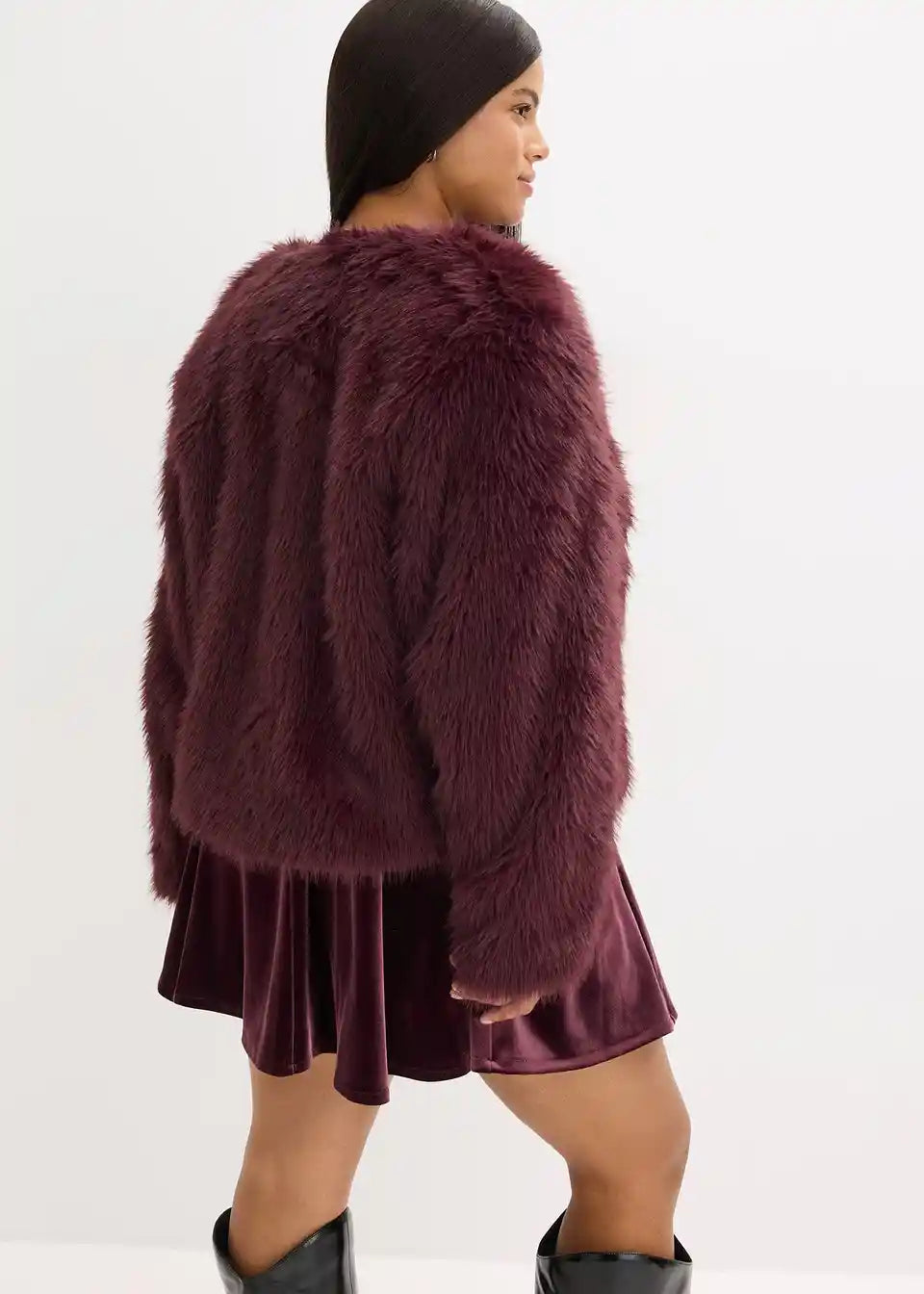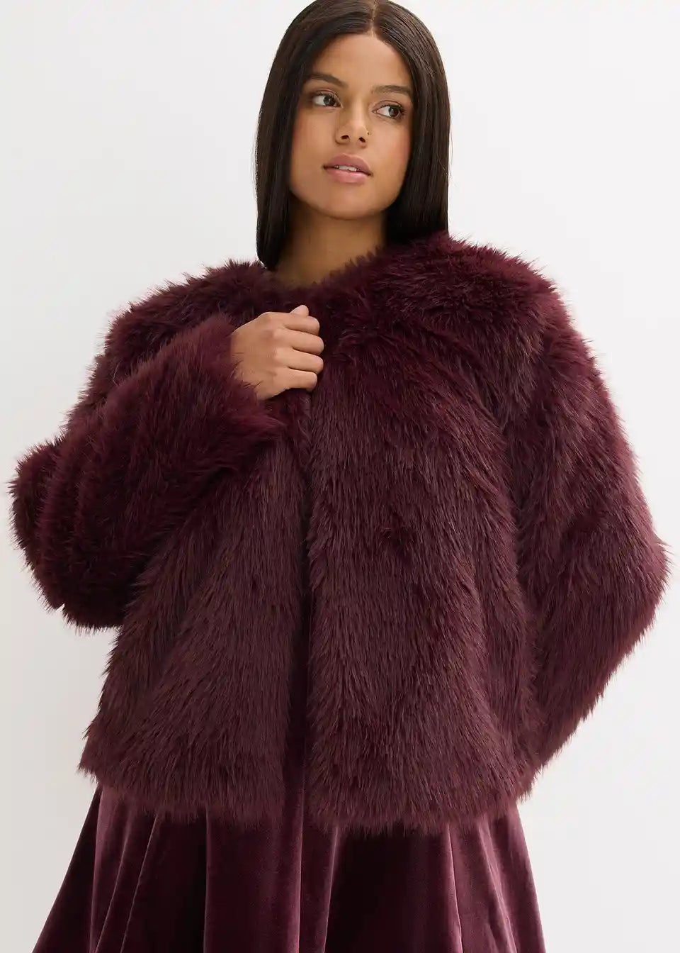 moderna kratka jakna od umjetnog krzna s okruglim izrezom i kopčanjem sprijeda na kopče i kukice