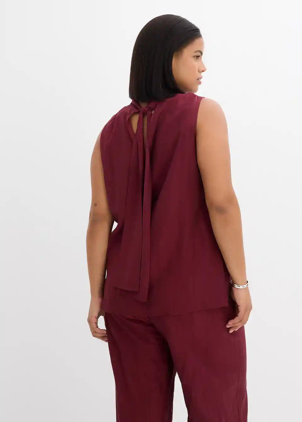 Dugi top od strukturirane tkanine, s dubljim izrezom na leđima i vezicom straga