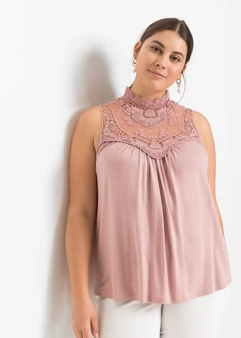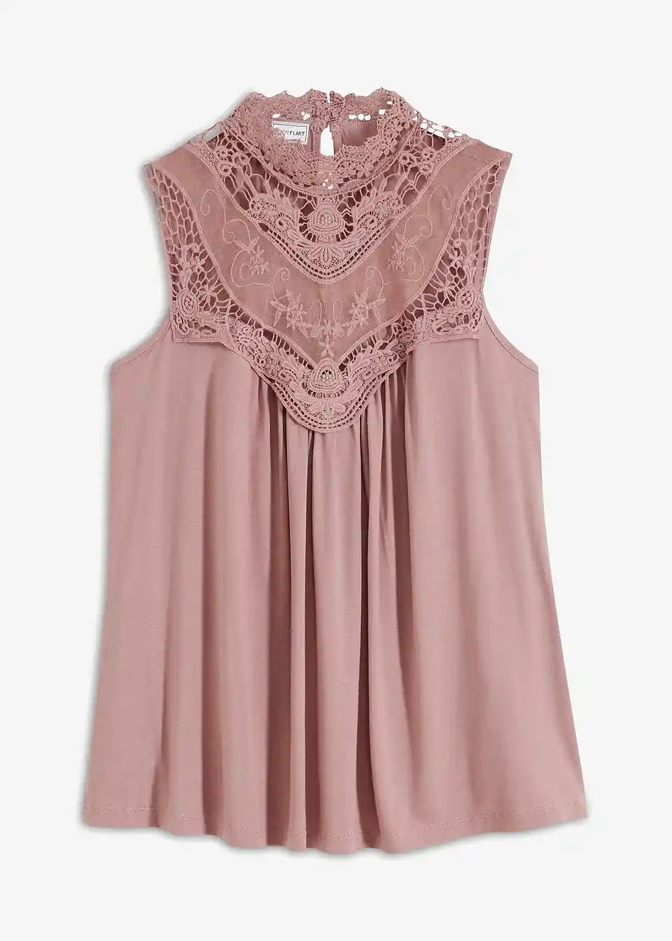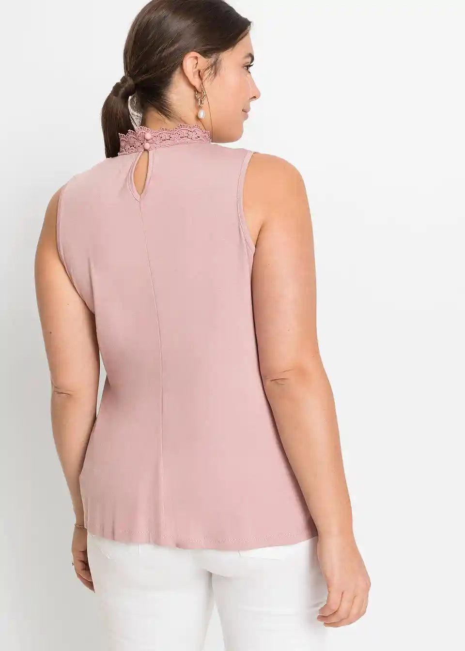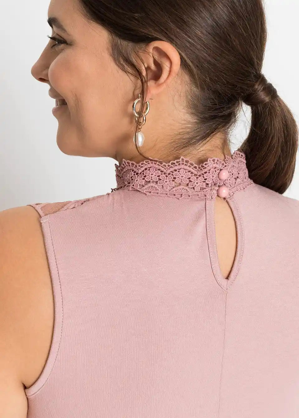 Ova bezrukavna košulja-bluza marke BODYFLIRT oduševljava svojim elegantnim dizajnom. Karakterizirana je mekom, lepršavom tkaninom s opuštenim krojem. Dekolte je ukrašen sofisticiranim čipkastim detaljem koji bluzu čini romantičnom. Posebnu pažnju privlači mali stojeći ovratnik, koji se na zatiljku zatvara gumbom.