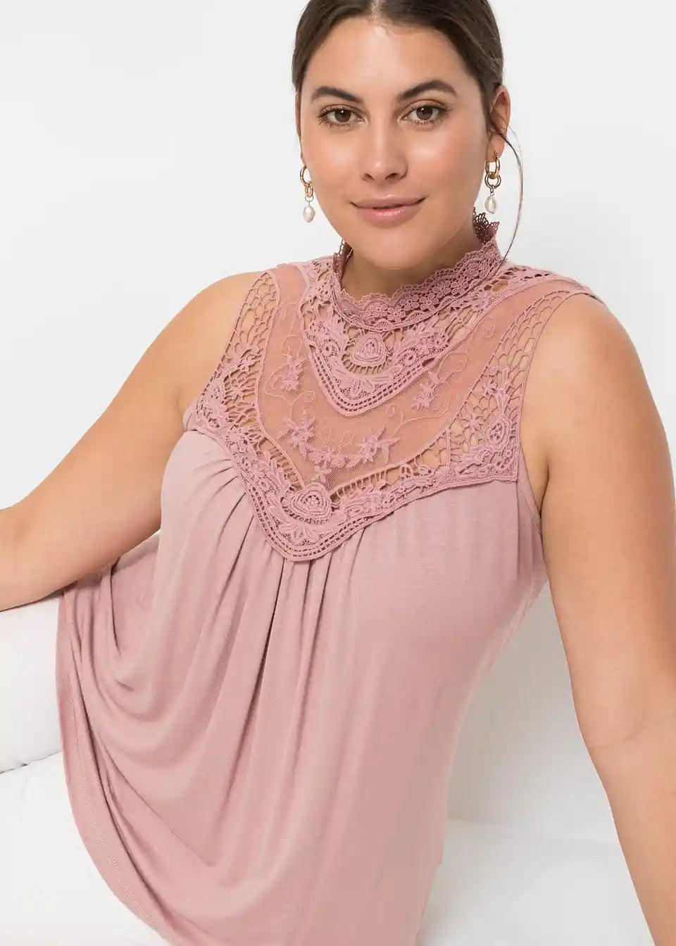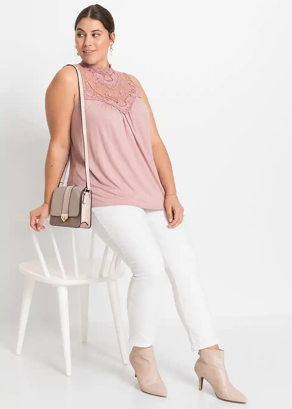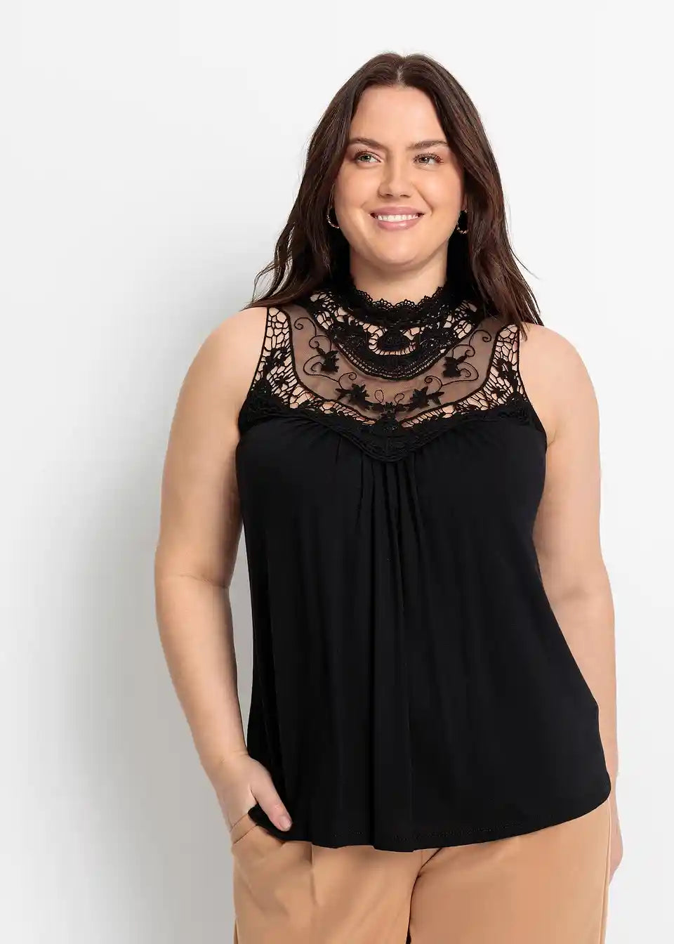 Ova bezrukavna košulja-bluza marke BODYFLIRT oduševljava svojim elegantnim dizajnom. Karakterizirana je mekom, lepršavom tkaninom s opuštenim krojem. Dekolte je ukrašen sofisticiranim čipkastim detaljem koji bluzu čini romantičnom. Posebnu pažnju privlači mali stojeći ovratnik, koji se na zatiljku zatvara gumbom.