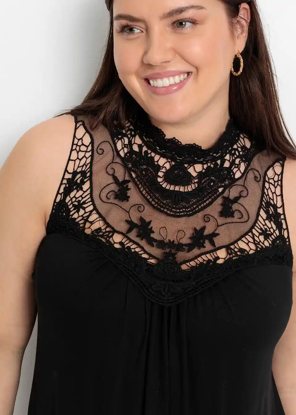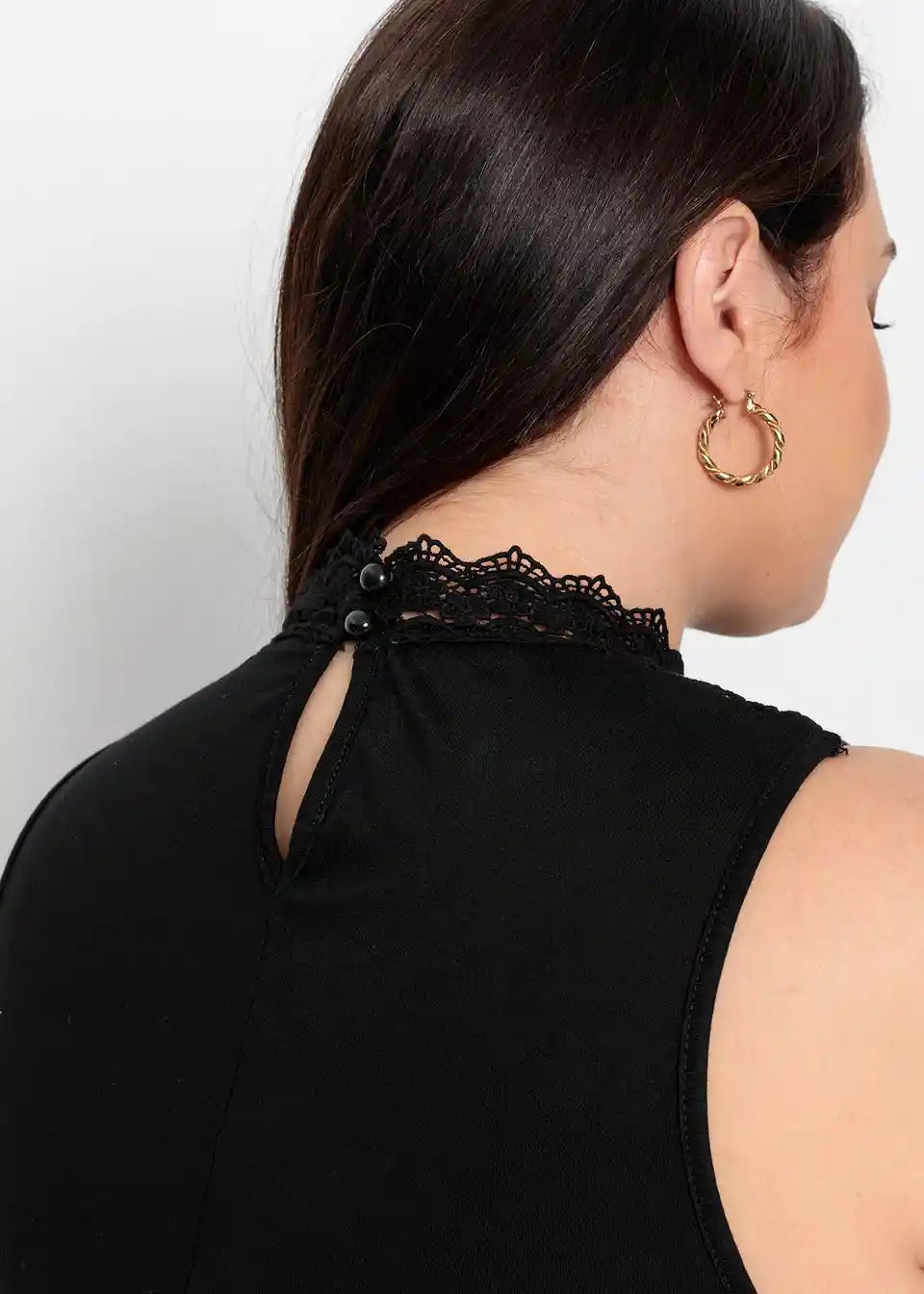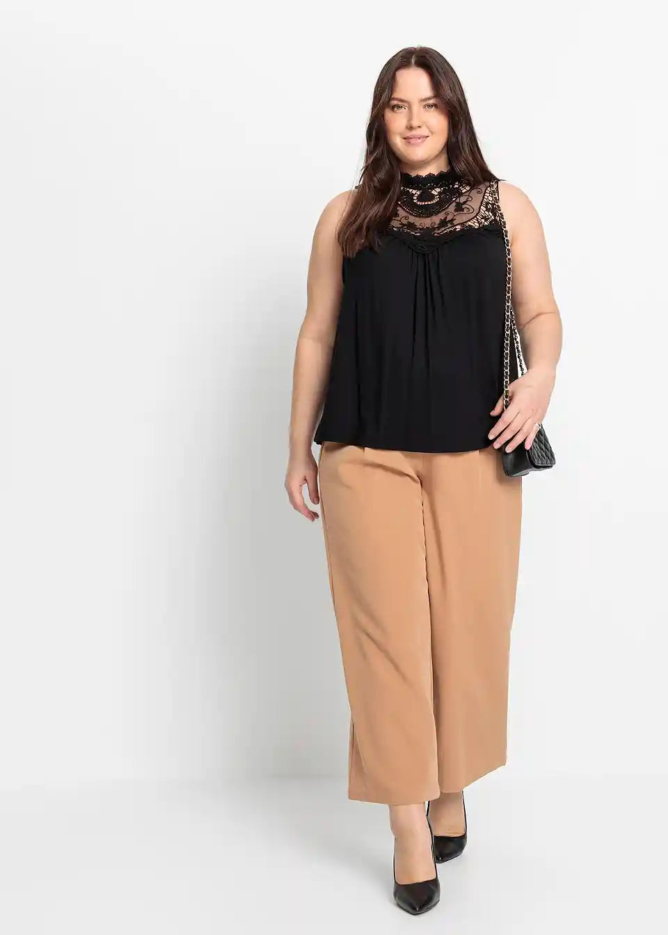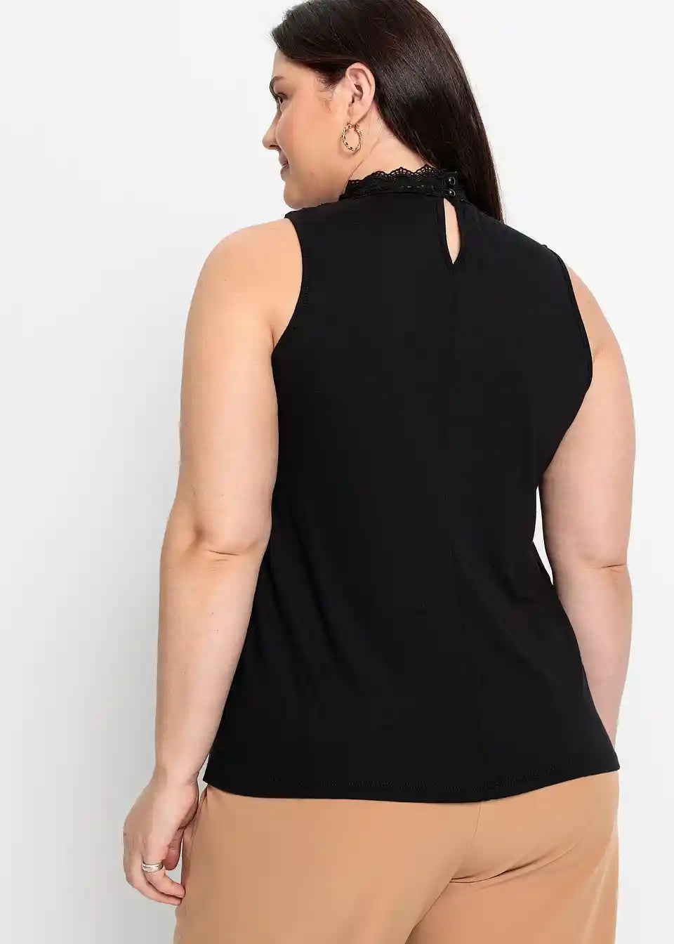 Ova bezrukavna košulja-bluza marke BODYFLIRT oduševljava svojim elegantnim dizajnom. Karakterizirana je mekom, lepršavom tkaninom s opuštenim krojem. Dekolte je ukrašen sofisticiranim čipkastim detaljem koji bluzu čini romantičnom. Posebnu pažnju privlači mali stojeći ovratnik, koji se na zatiljku zatvara gumbom.