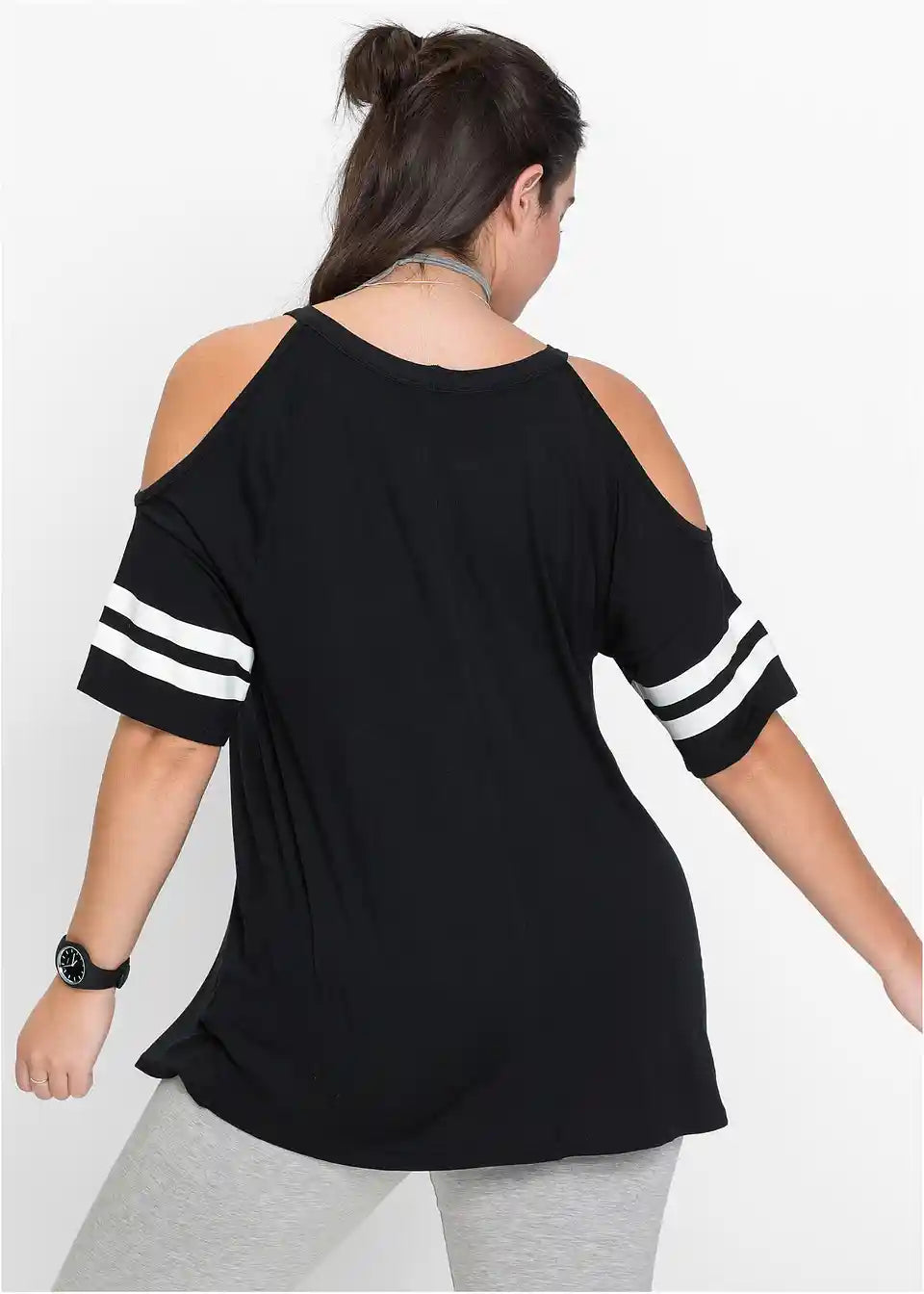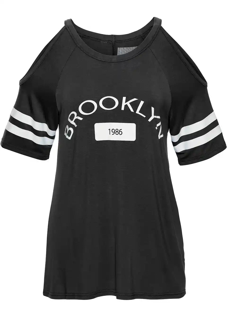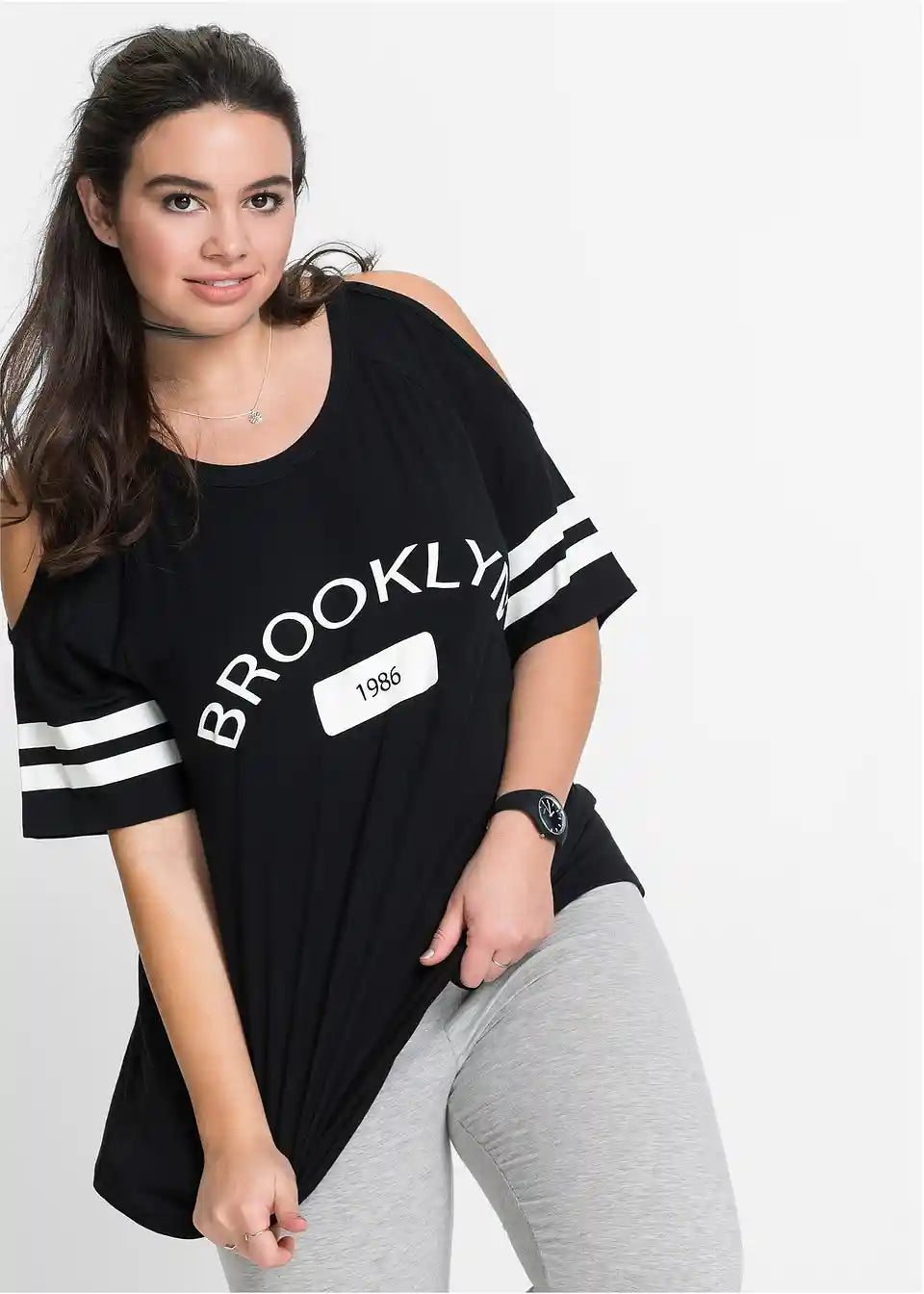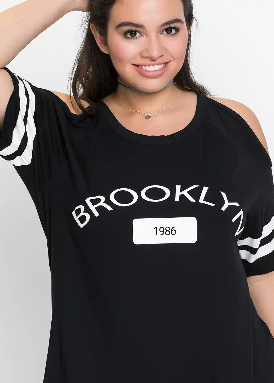 Ova ležerna košulja s izrezima spaja moderan college-look s profinjenim otvorima koji naglašavaju ramena. Kontrastne pruge na završecima rukava i upečatljiv print na prednjoj strani zaokružuju trendi dizajn. Ležerno krojena majica s kratkim rukavima i okruglim izrezom posebno dobro izgleda uz uske hlače poput tajica ili skinny traperica. Šarene tenisice upotpunjuju izgled.