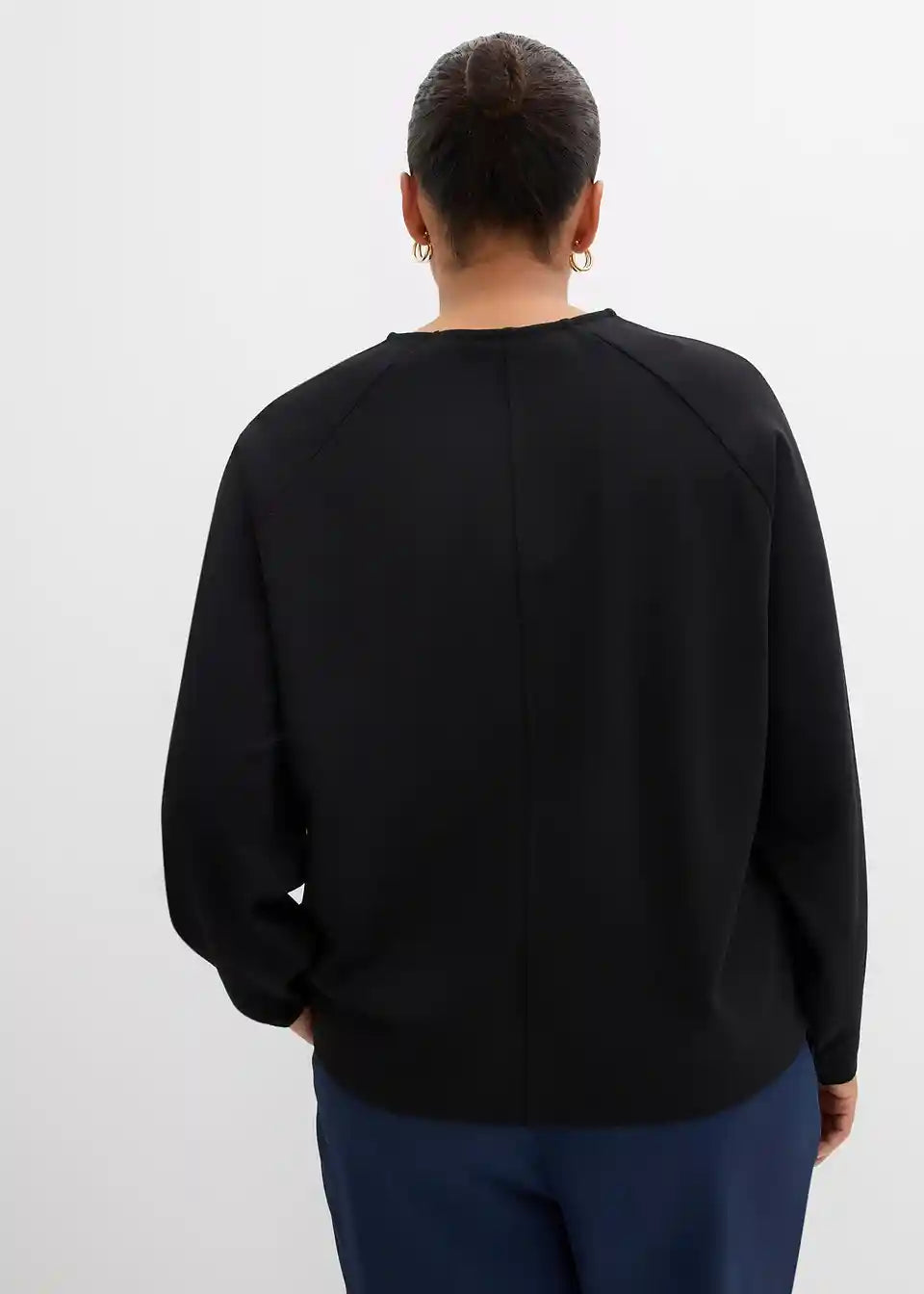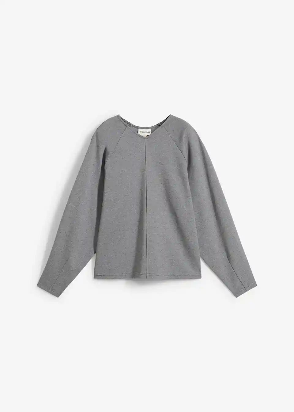 Ravno krojena majica dugih rukava s obrubljenim V-izrezom te podjeljenim šavom sprijeda i straga