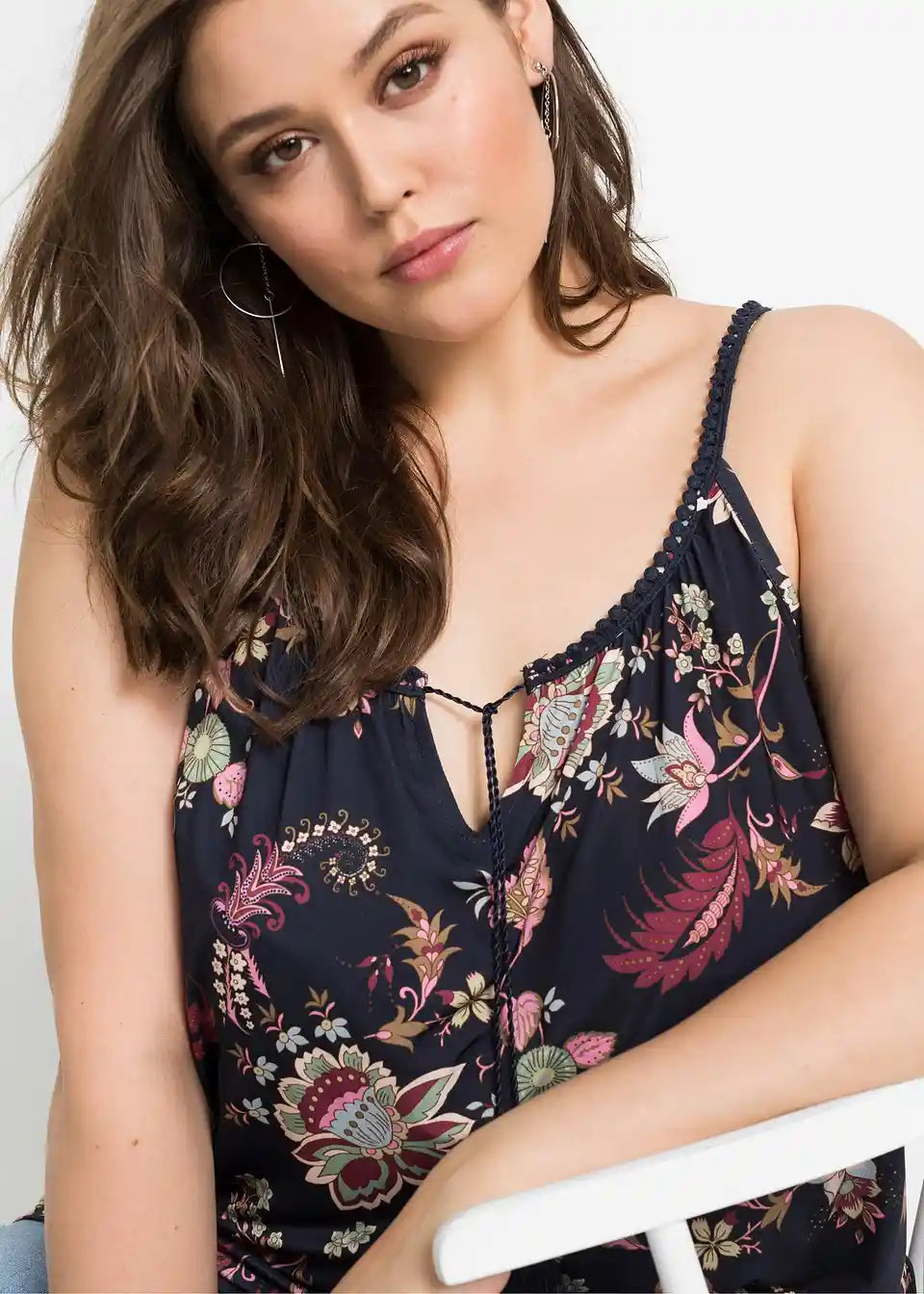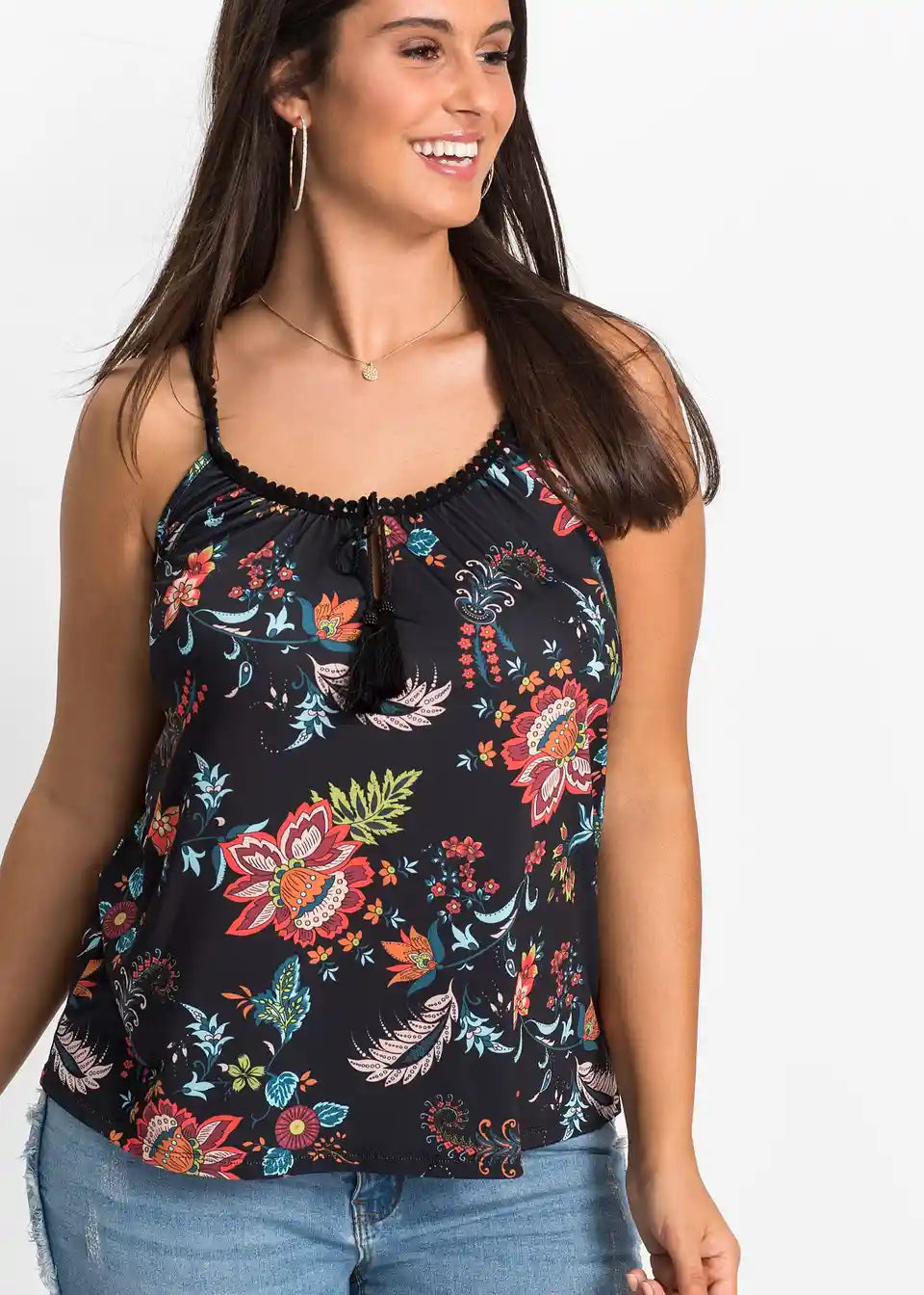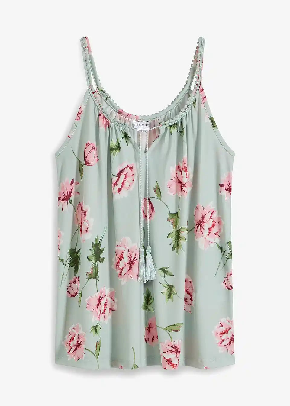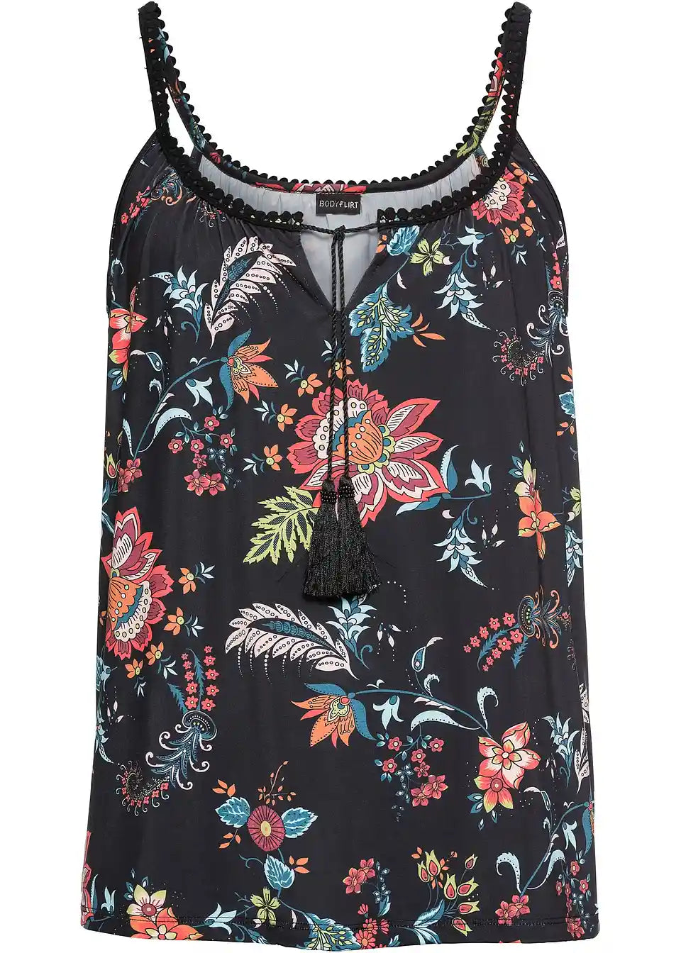 Zahvaljujući materijalu koji nježno pada i cvjetnim uzorcima, Jerseytop s cvjetnim printom marke BODYFLIRT djeluje posebno romantično. Labavi kroj pruža laskav i udoban oblik. Atraktivni model oduševljava širokim okruglim izrezom s kratkim prorezom. Uski naramenice ukrašene delikatnim obrubom predstavljaju poseban detalj. Vrpce za vezanje s velikim resicama na izrezu dodaju razigrani naglasak.