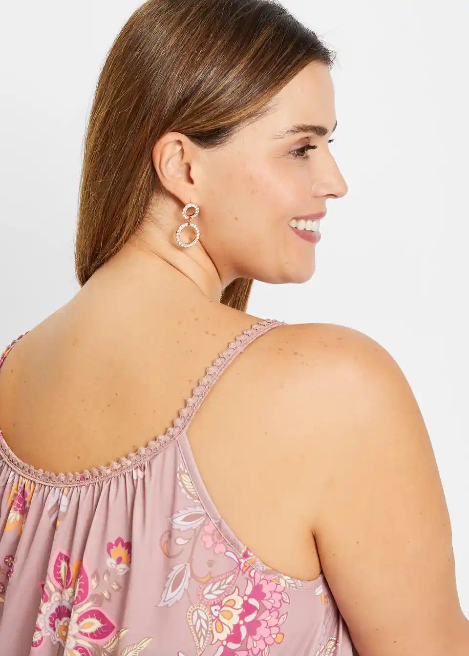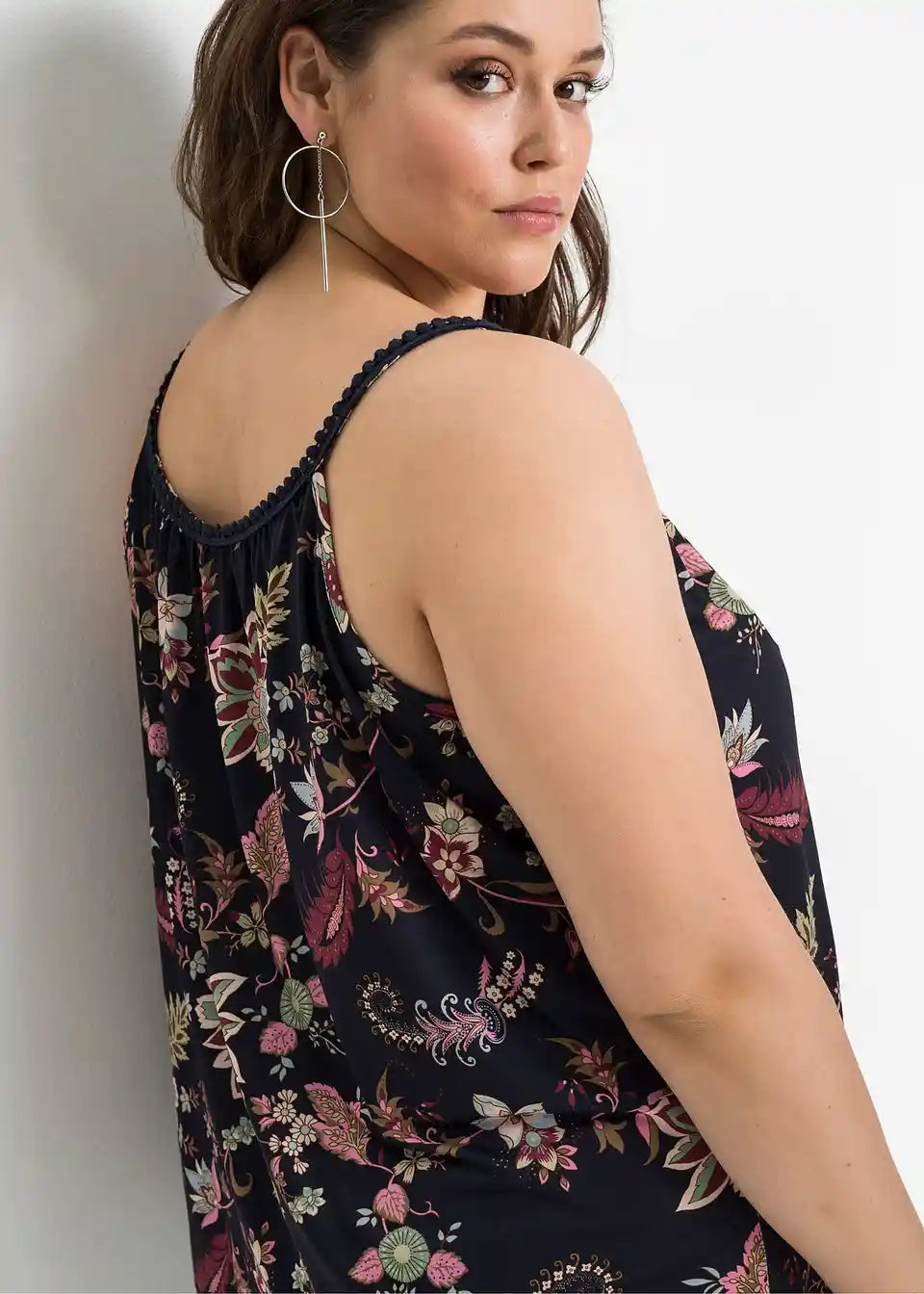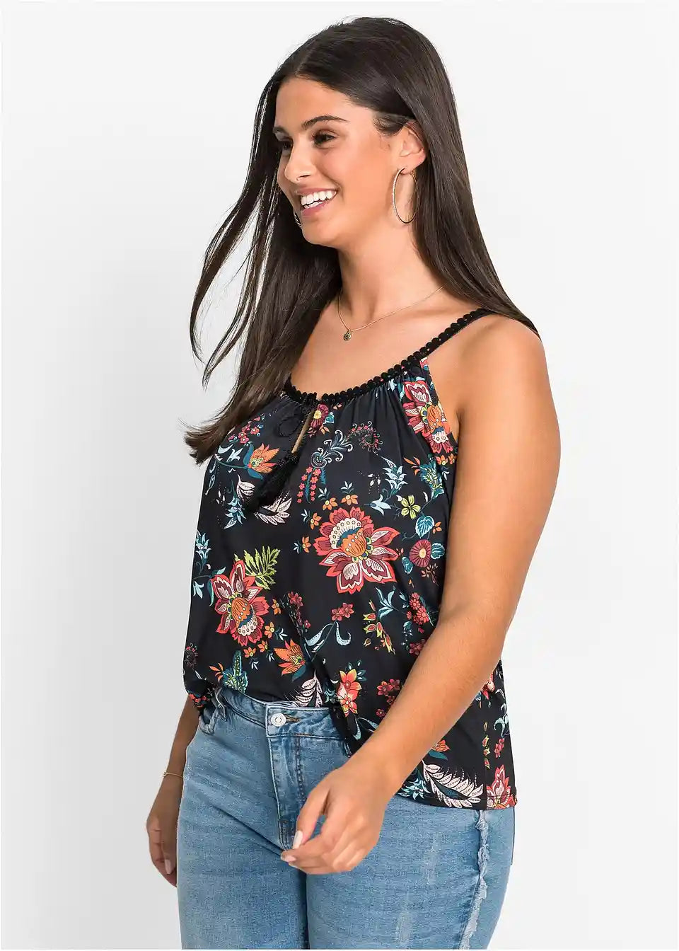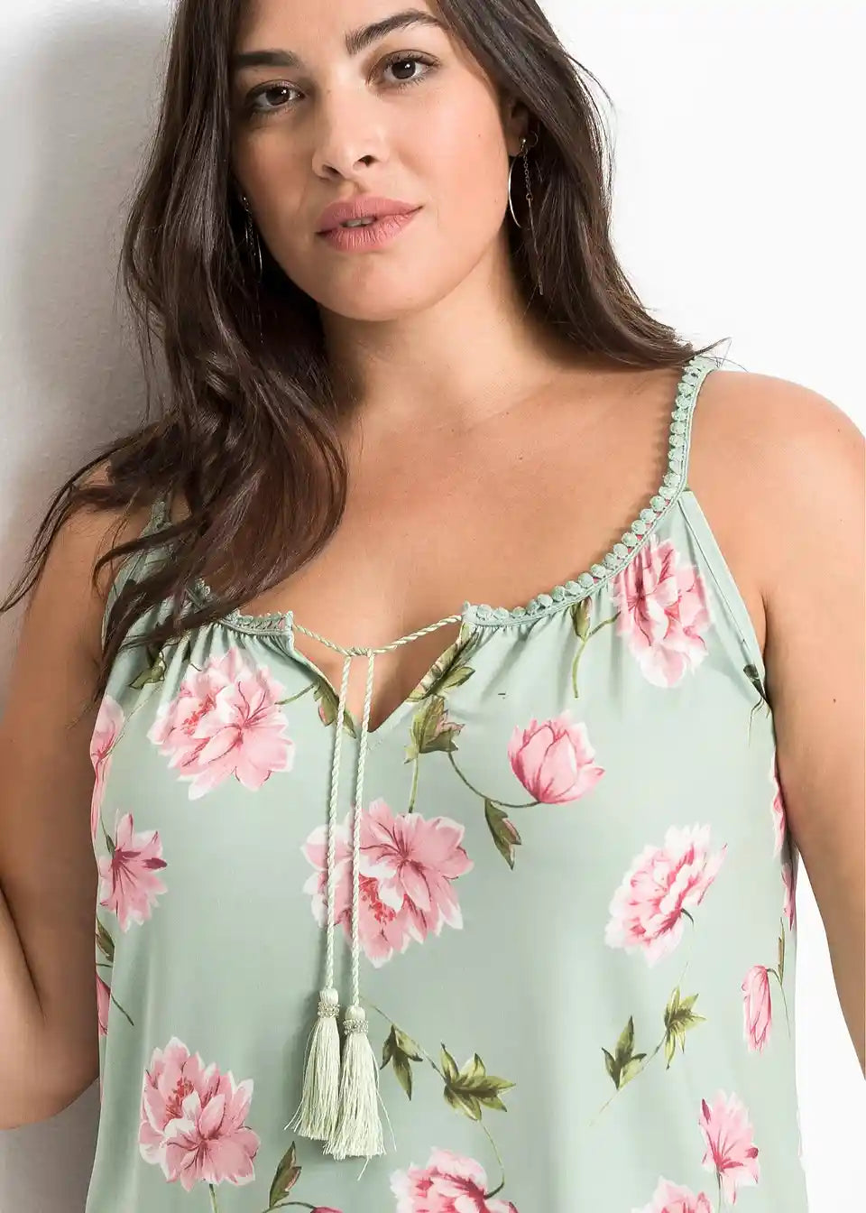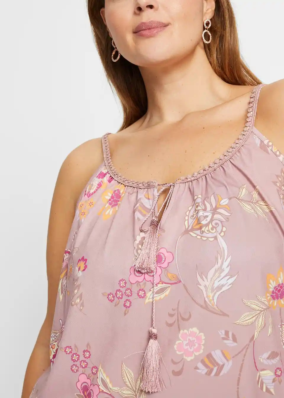 Zahvaljujući materijalu koji nježno pada i cvjetnim uzorcima, Jerseytop s cvjetnim printom marke BODYFLIRT djeluje posebno romantično. Labavi kroj pruža laskav i udoban oblik. Atraktivni model oduševljava širokim okruglim izrezom s kratkim prorezom. Uski naramenice ukrašene delikatnim obrubom predstavljaju poseban detalj. Vrpce za vezanje s velikim resicama na izrezu dodaju razigrani naglasak.