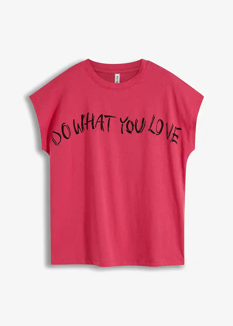 Spuštena ramena i ležeran kroj daju ovoj majici oversize efekt. Cool natpis u visini prsa savršeno odgovara ovom dizajnu. Trendovski šorcevi s izlizanim rubom ili skinny traperice s poderanim efektom naglašavaju ležernost ovog modernog modela. Oversized majica posebno je efektna u kombinaciji s mini suknjom i sandalama s drvenom platformom.