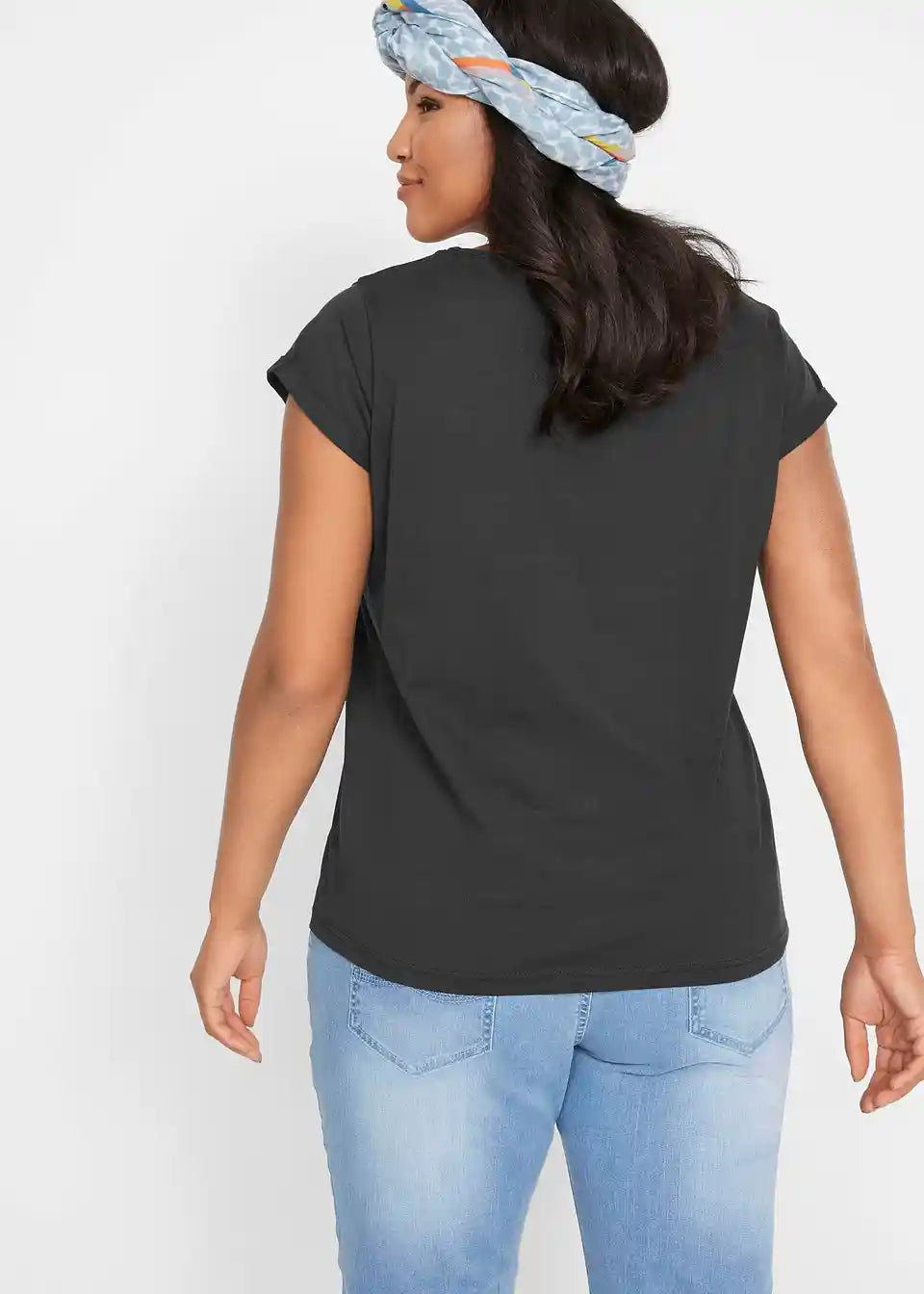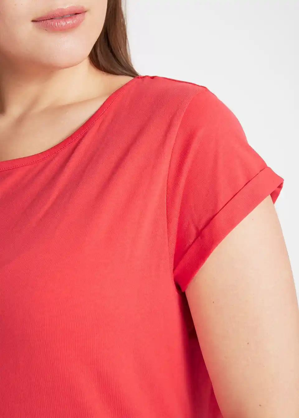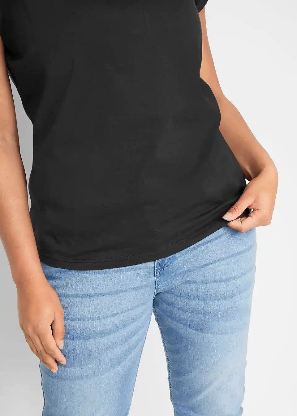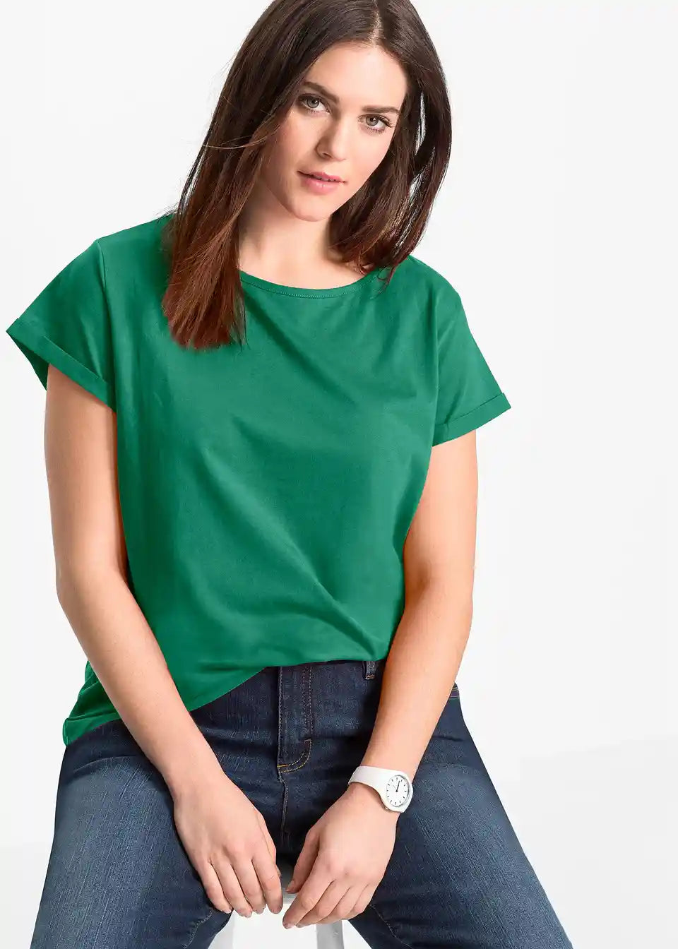 Modni T-Shirt kratkih rukava marke John Baner je upečatljiv osnovni komad za modno osviještene žene. Kul boxy kroj privlači pažnju dok istovremeno laskavo pristaje oblinama. Vrlo udoban T-Shirt s okruglim izrezom dodatno je ukrašen atraktivnim zavrtnjem na rukavima. Osobito je lijep u kombinaciji s jednostavnim trapericama i balerinkama.