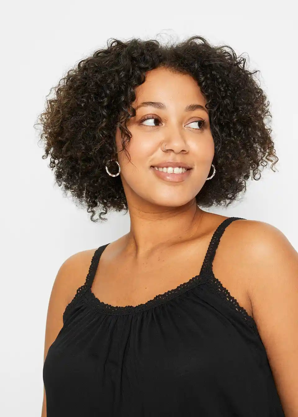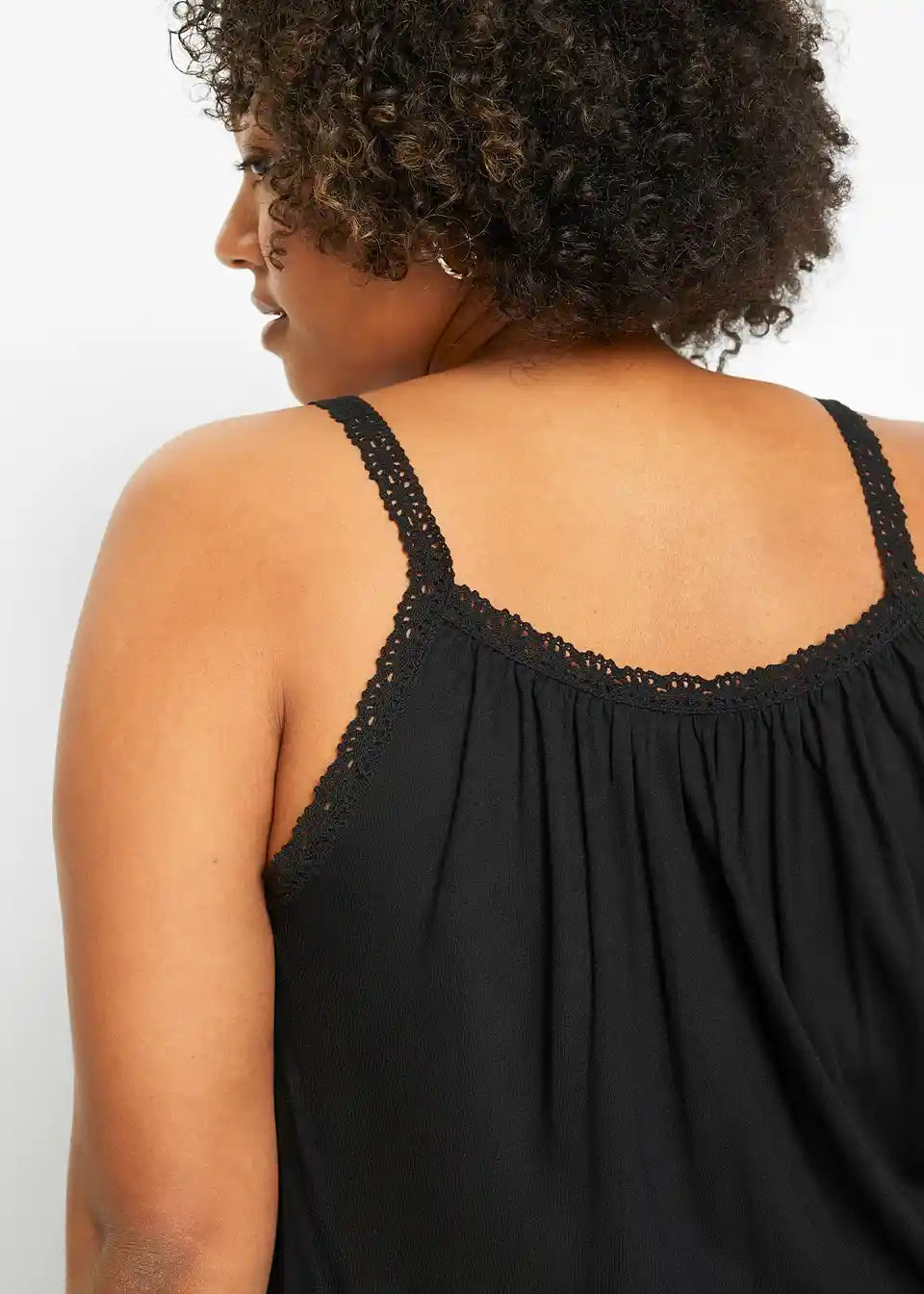 Raznovrsni stilovi mogu se postići s ovim modernim topom. Gornji dio koji pokriva bokove ukrašen je nježnom čipkom na špageti naramenicama i uz izrez. Zahvaljujući opuštenom kroju, top pada u nježnim naborima i ležerno obavija figuru. Bez obzira nosite li ga uz hlače, šorc, traperice ili suknju - majica s čipkastim rubom pruža brojne mogućnosti kombiniranja.