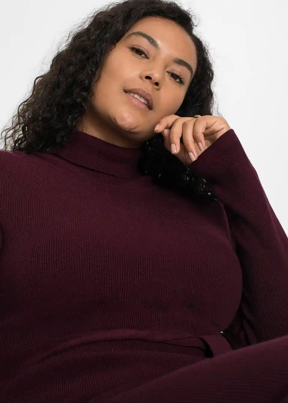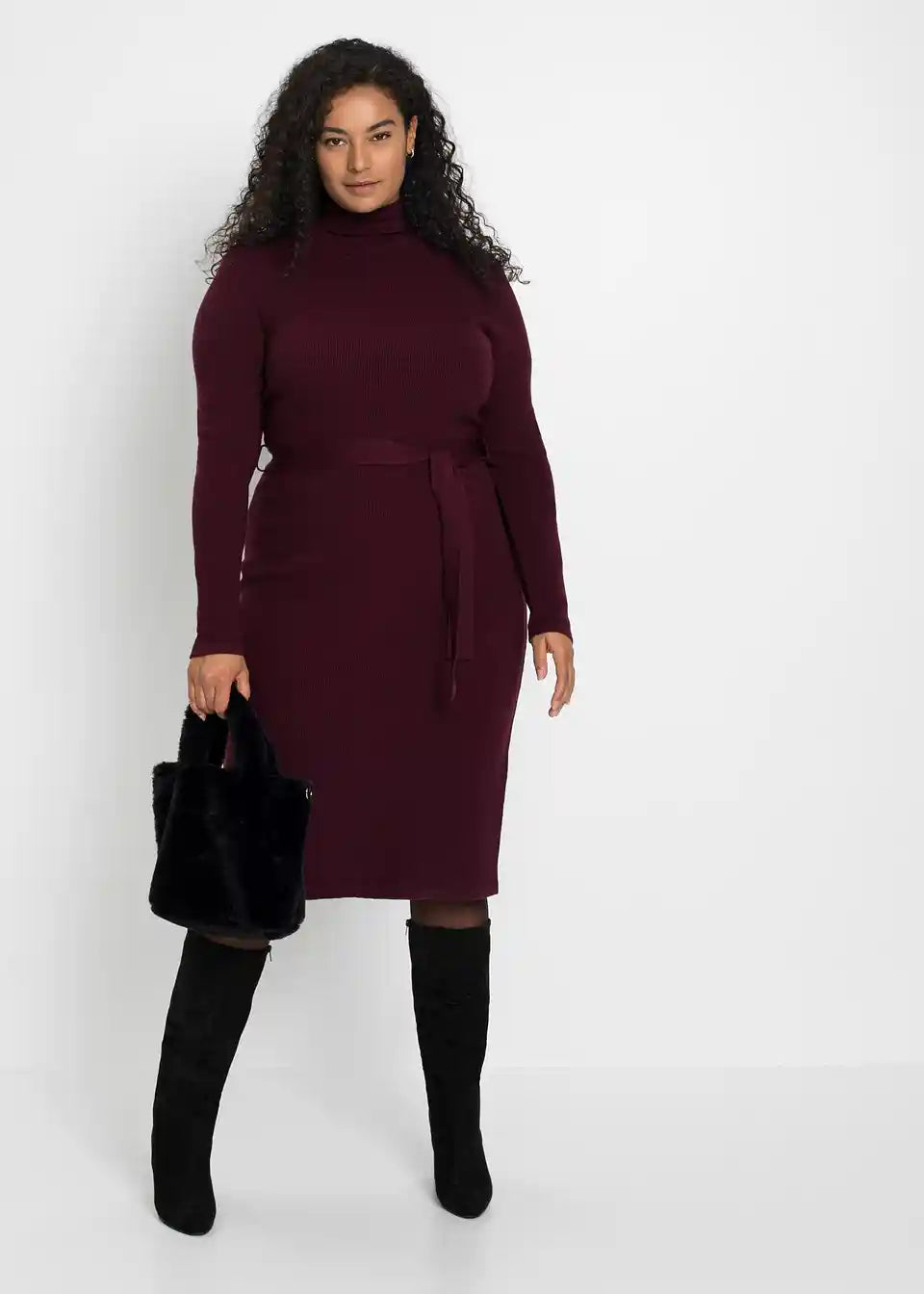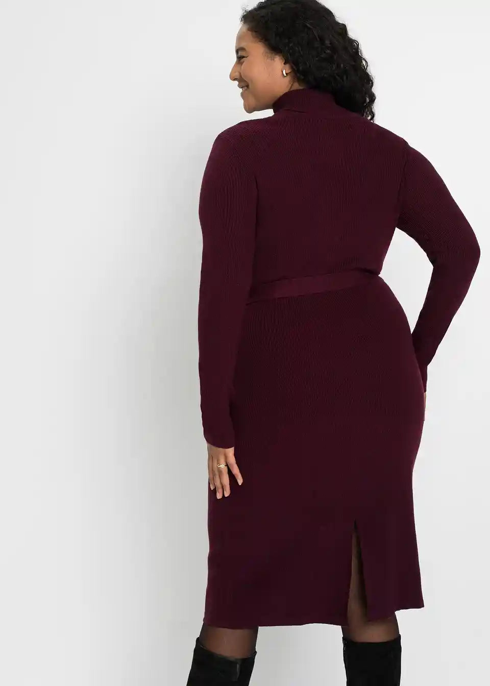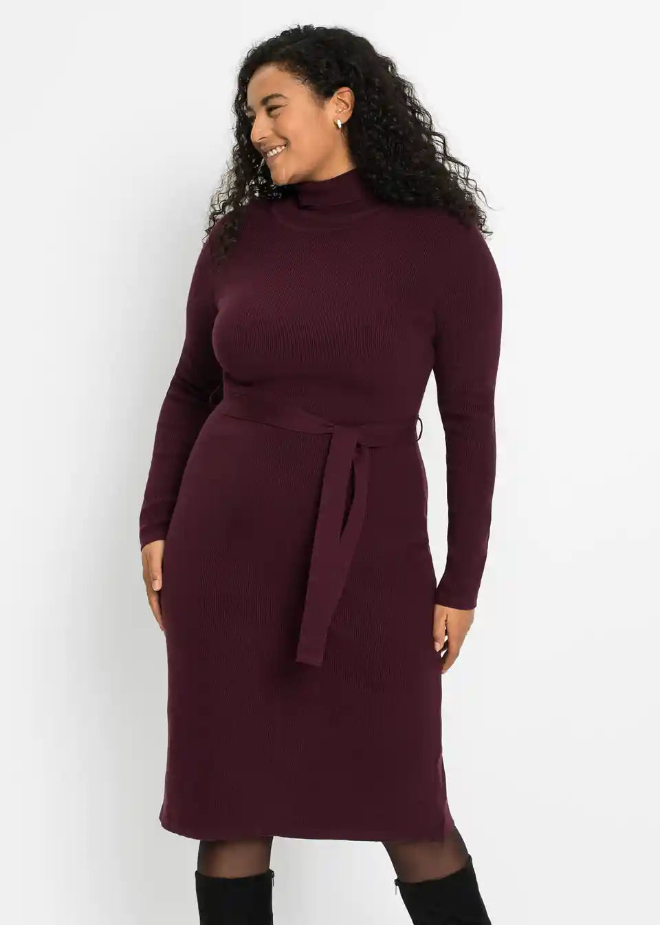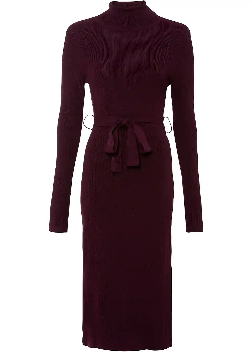 Privlačna pletena haljina s praktičnim remenom za vezanje oko struka.