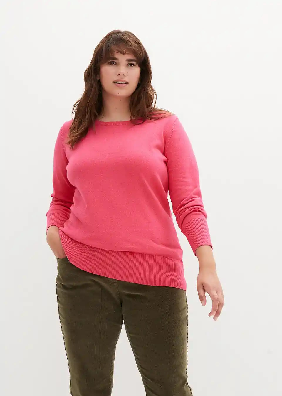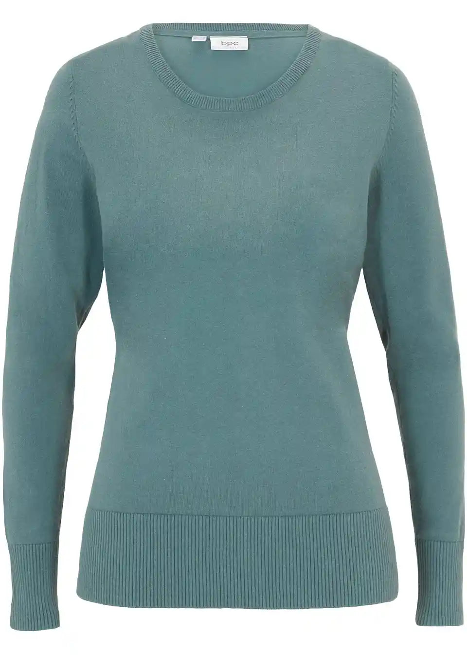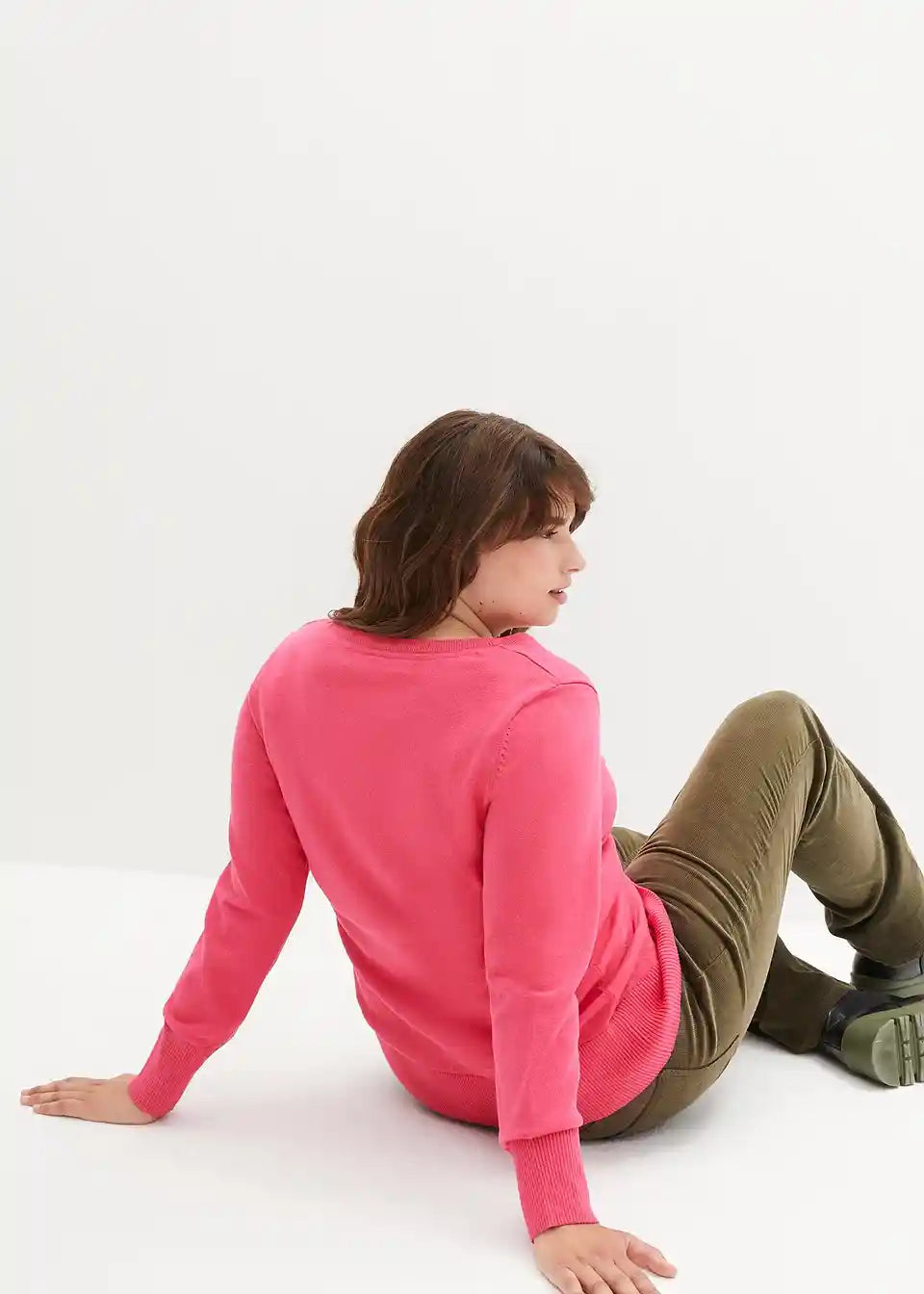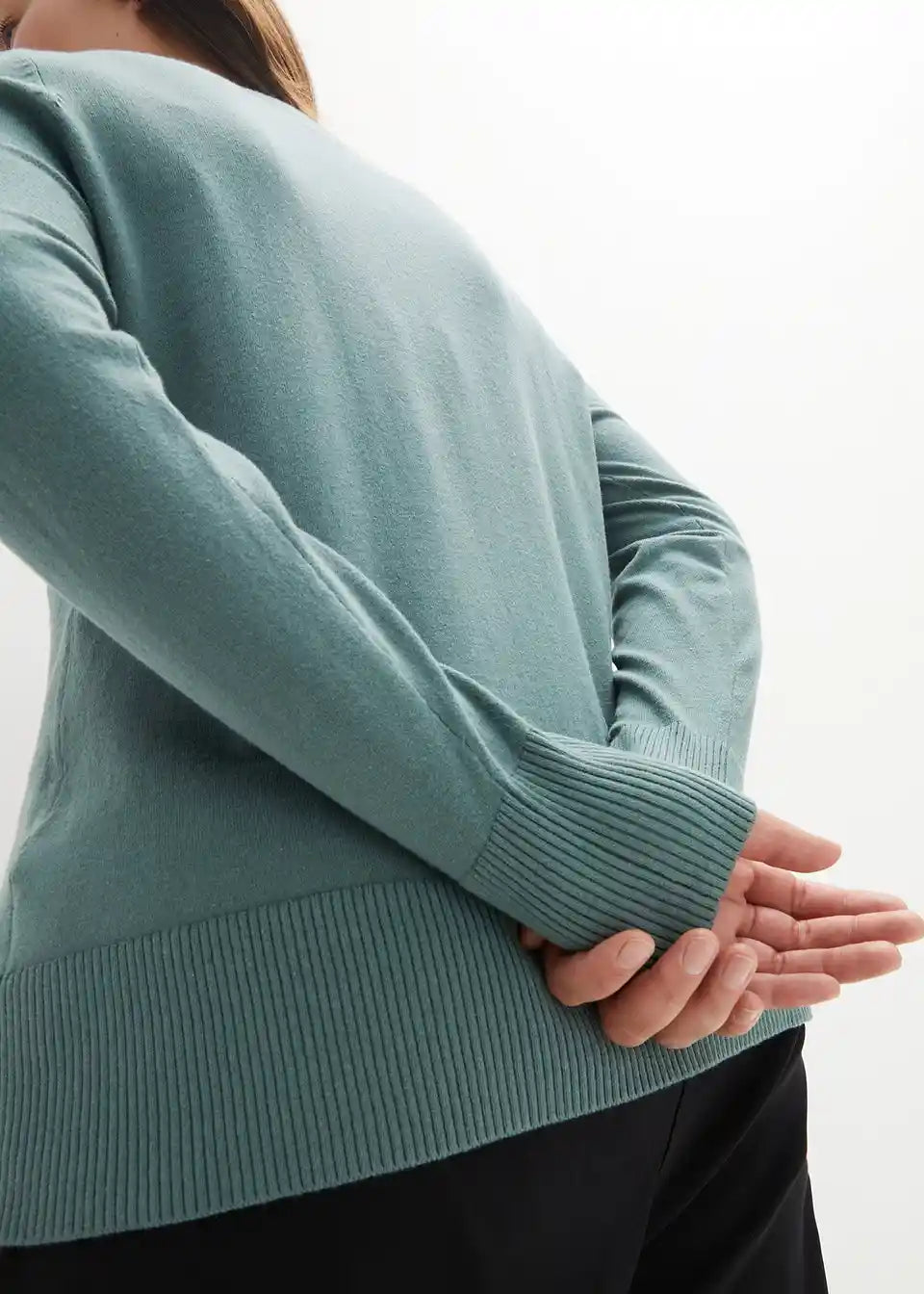 Pulover b.p.c Casual od finog pletiva, s V-izrezom i rebrastim porubima. Duljina od otprilike 64 cm (vel. 36/38) do otprilike 72 cm (vel. 52/54), periv u perilici rublja