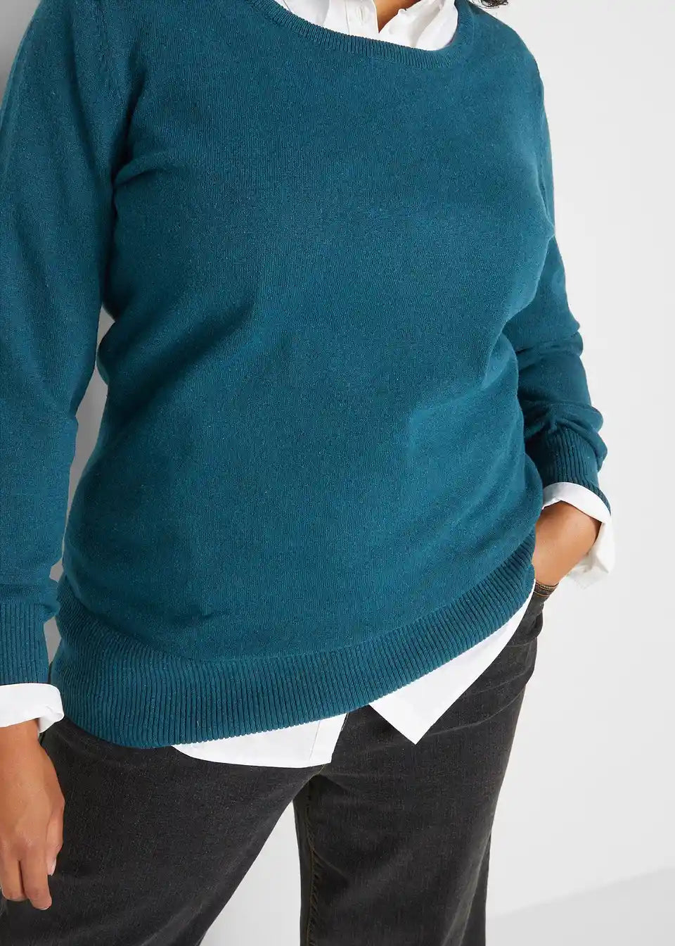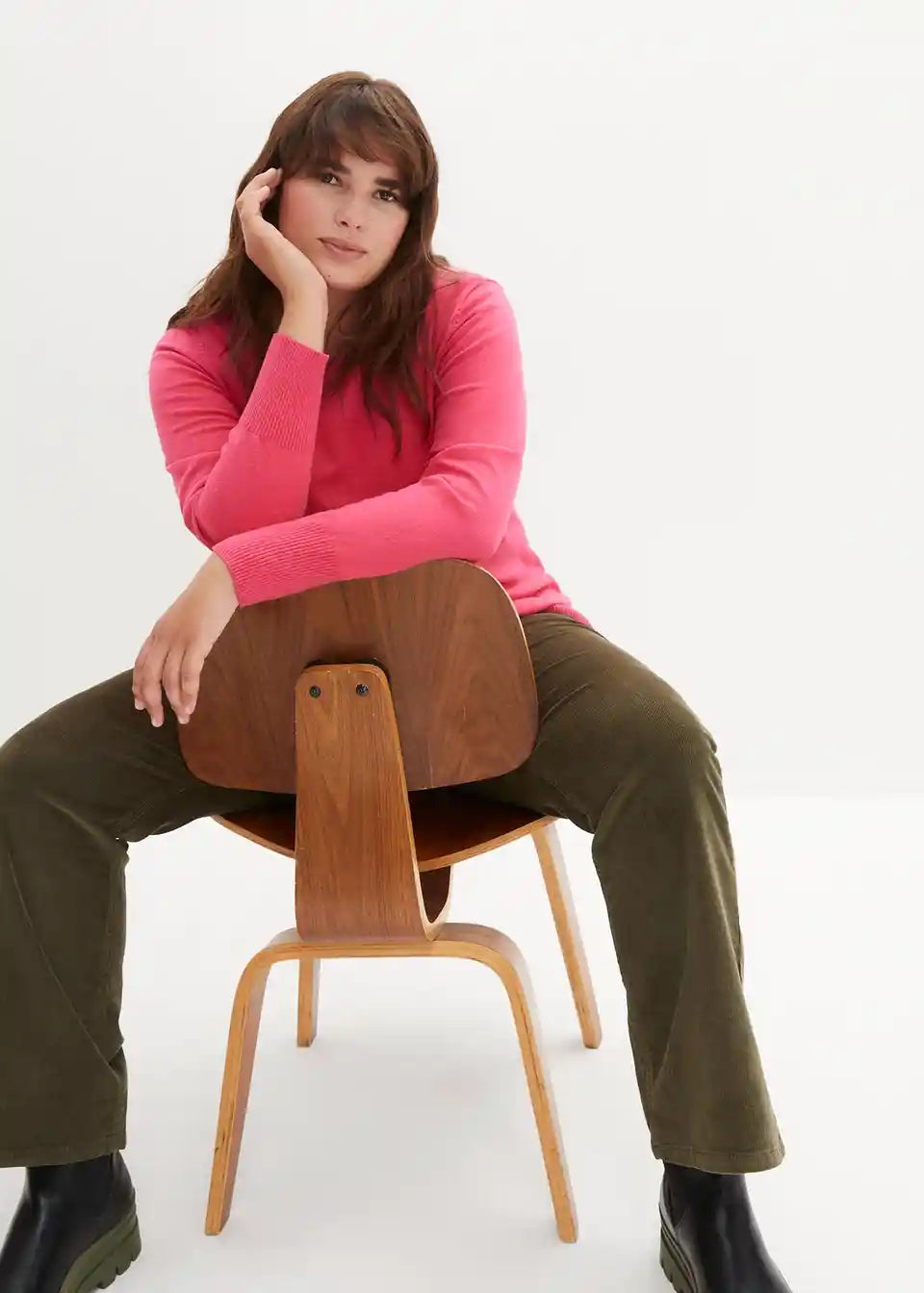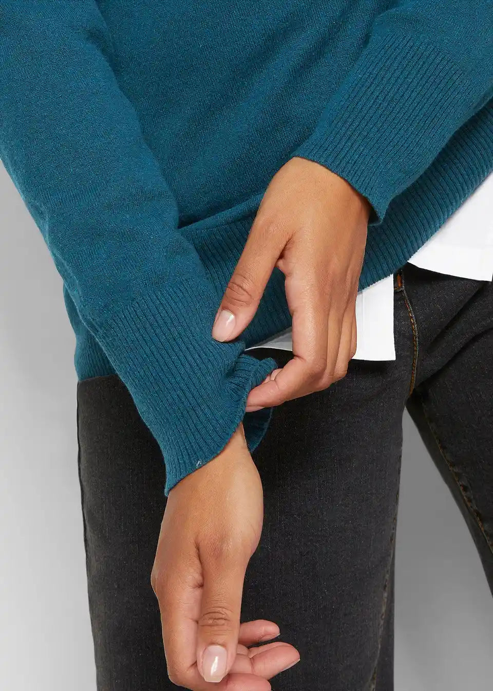 Pulover b.p.c Casual od finog pletiva, s V-izrezom i rebrastim porubima. Duljina od otprilike 64 cm (vel. 36/38) do otprilike 72 cm (vel. 52/54), periv u perilici rublja